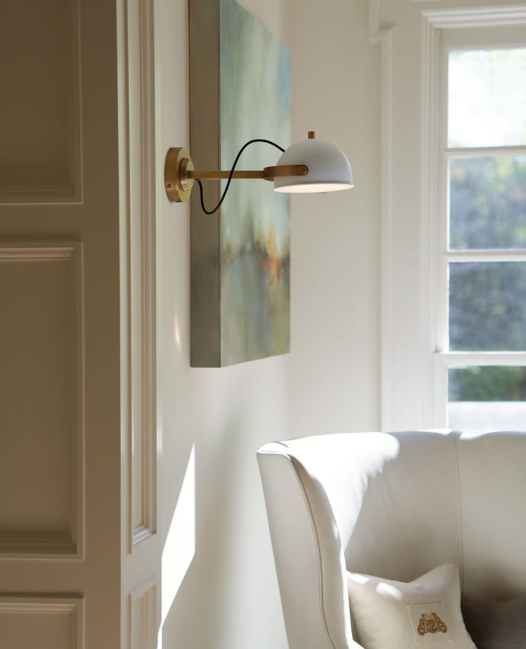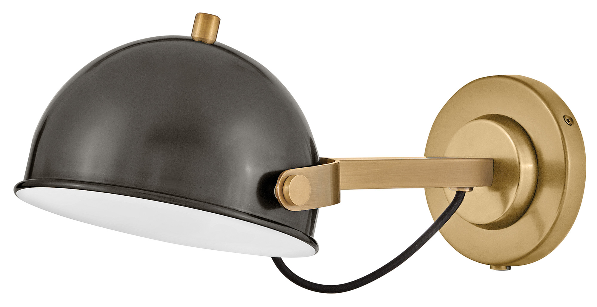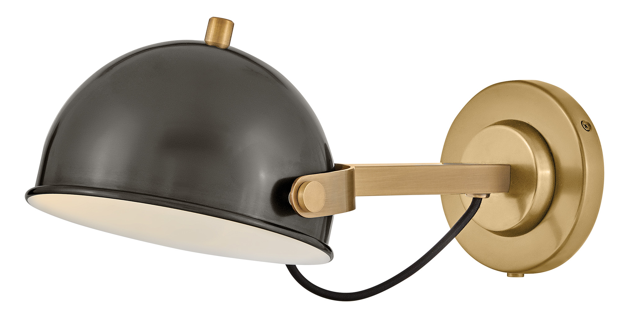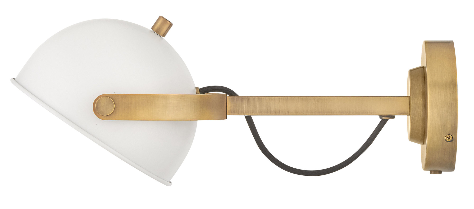 Item DescriptionA modern bedside sconce with a vintage feel, Spence’s adjustable, rotating shade, painted white interior, and convenient on/off switch create the ideal reading or task light. Heritage Brass details and removable, black, fabric-wrapped cord complement each finish.