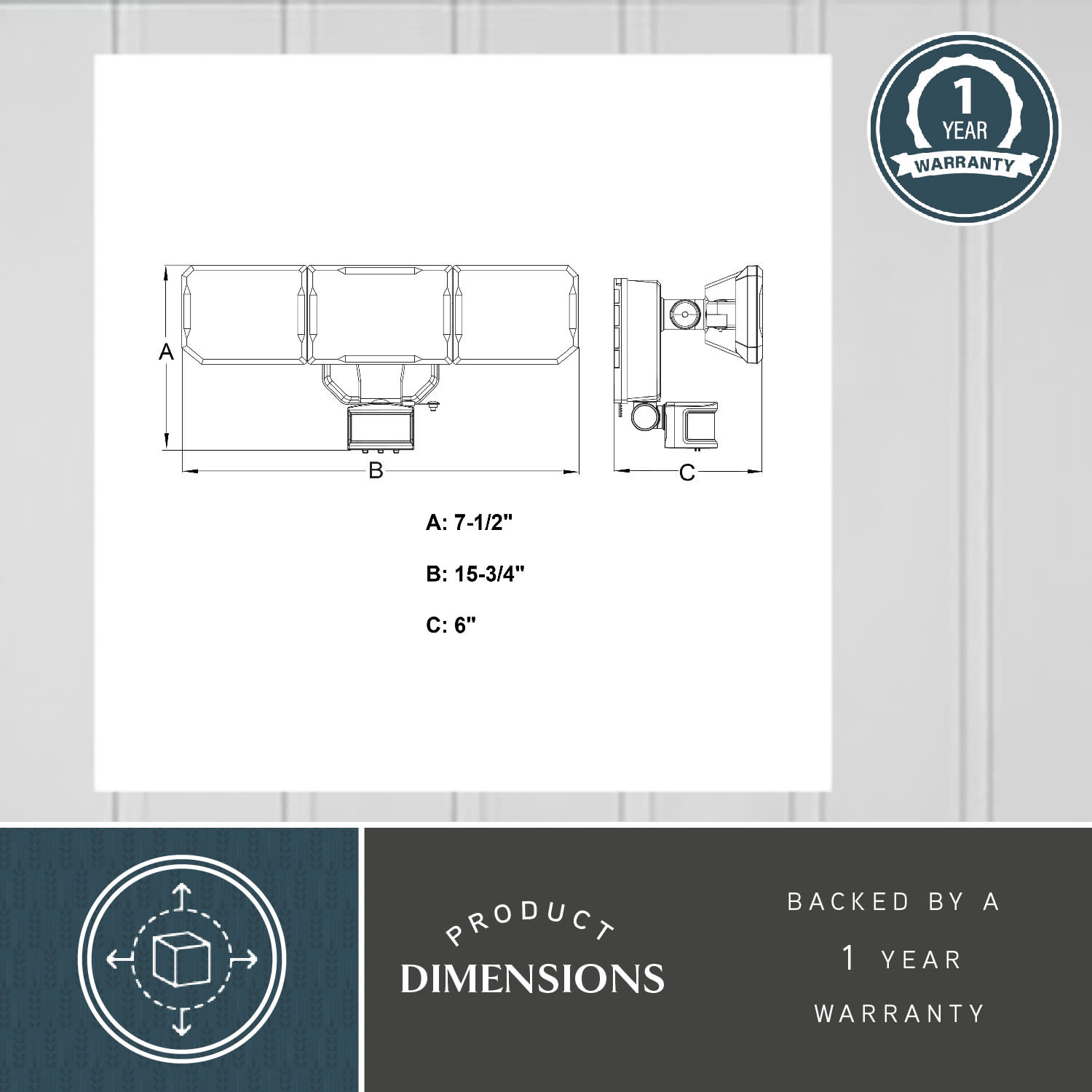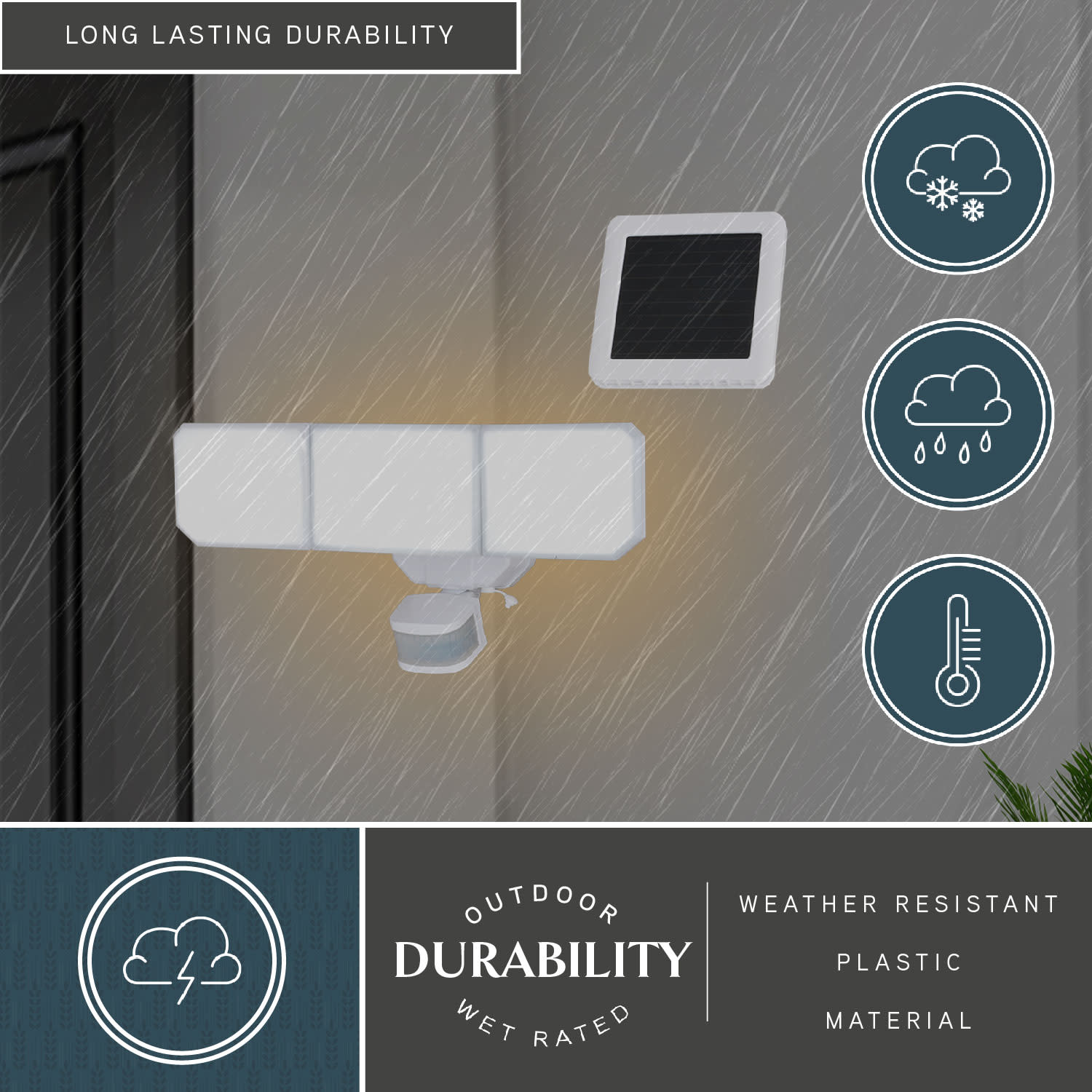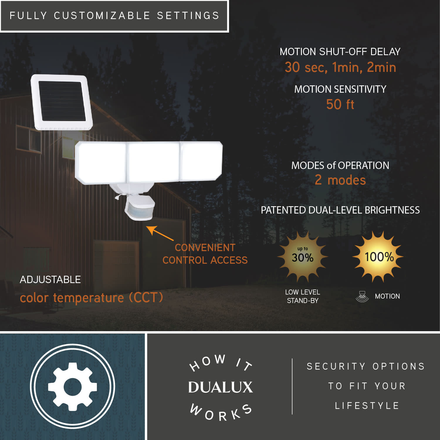 Item DescriptionThis 3-light integrated LED solar outdoor motion sensor security light provides dual-level lighting: ambient 2700K low-level lighting overnight and 5000K full brightness high level when motion is detected. The light heads and sensor are fully adjustable and automatically deliver 2500 lumens to illuminate your home’s exterior with warm ambient light at dusk, then instantly brighten when motion is detected. This Dualux security flood light expands the functionality, safety, and security of your home’s outdoor spaces with bright, reliable light when and where it’s needed.