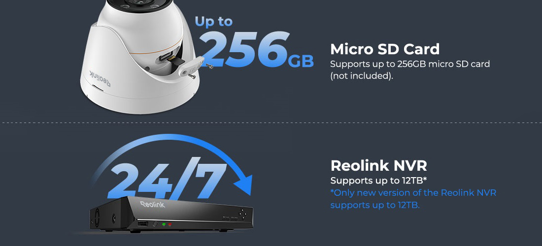 This smart IP video camera supports 24/7 continuous, motion-triggered, or scheduled recordings. All the videos can be saved to the micro SD card, Reolink NVR or FTP server. Choose a way you like and enjoy customized security.· Micro SD Card: Supports up to 256GB micro SD card (not included).· Reolink NVR: If you want to save videos for a much longer time or manage multiple cameras, you can simply connect this camera to a compatible Reolink NVR or security camera system. (* Reolink NVRs are recommended for best performance.)