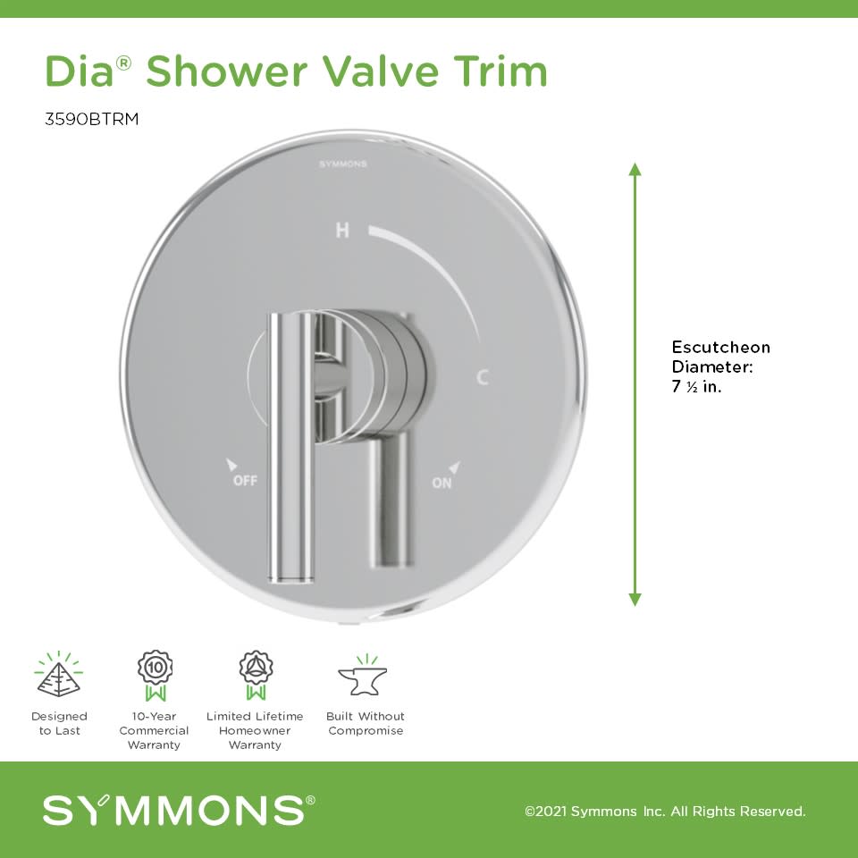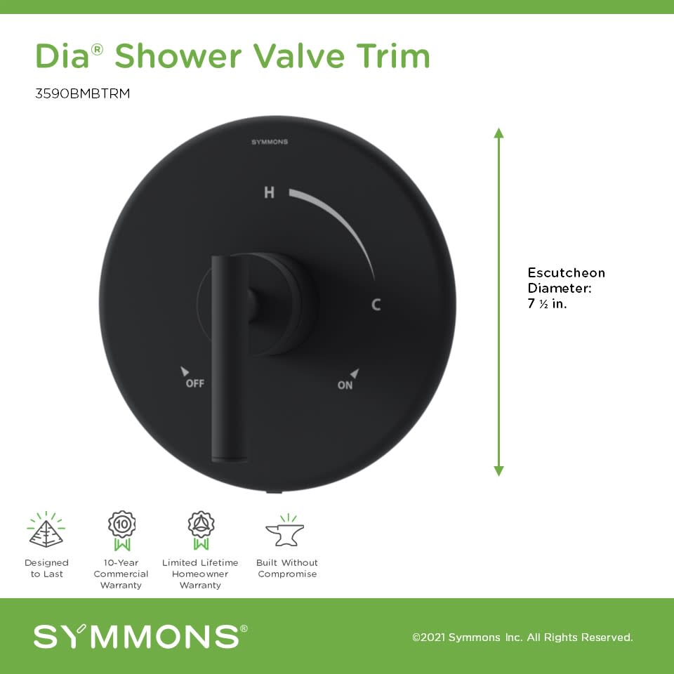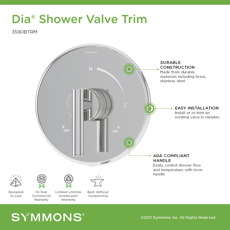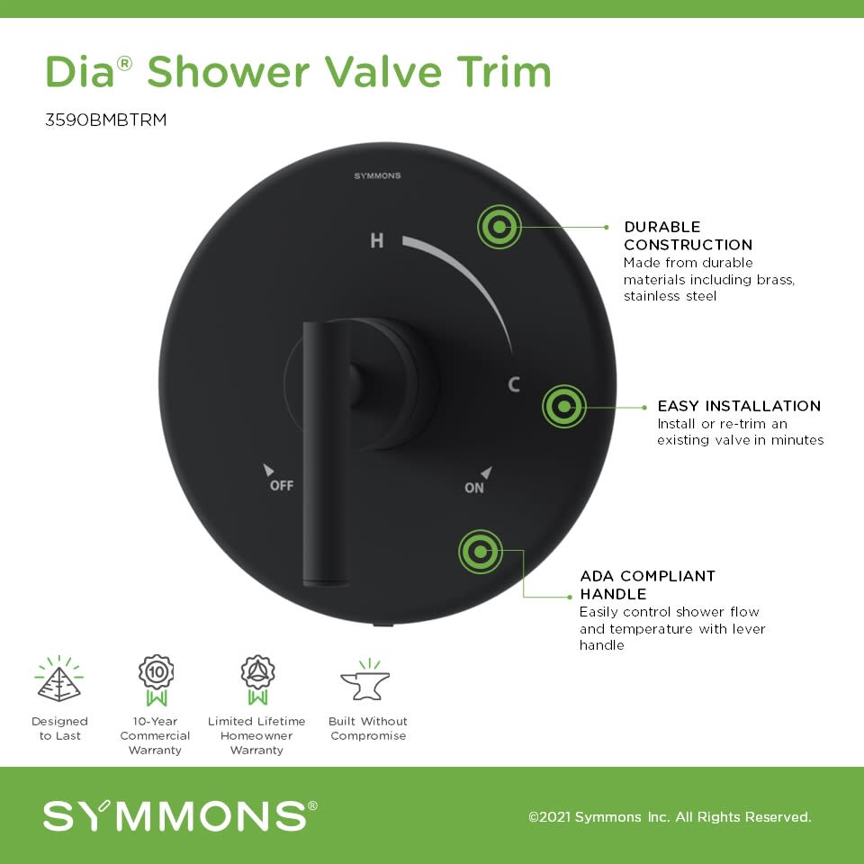 - Covered under Symmons's 10 year commercial and limited lifetime residential warranties and 10 year commercial warranty