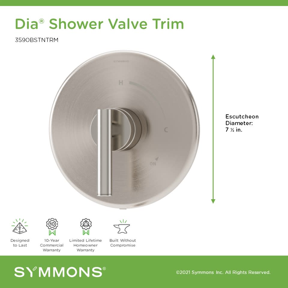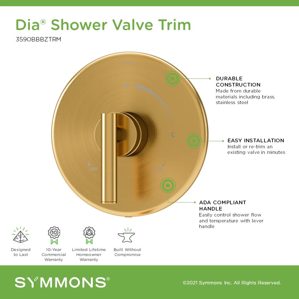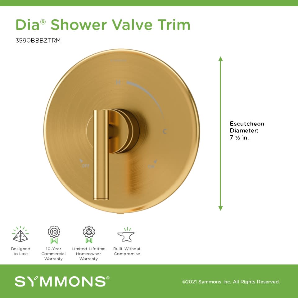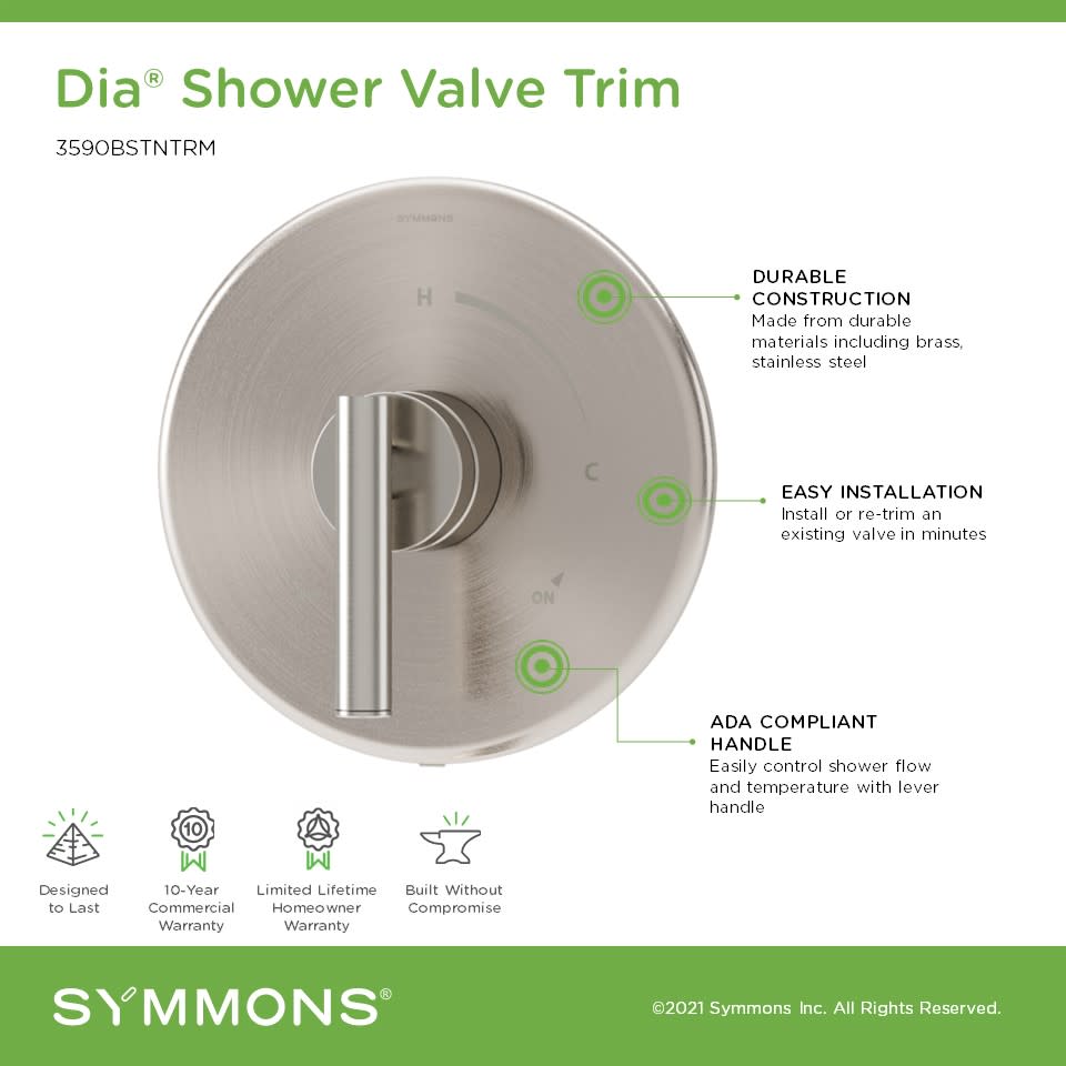 - Covered under Symmons's 10 year commercial and limited lifetime residential warranties and 10 year commercial warranty