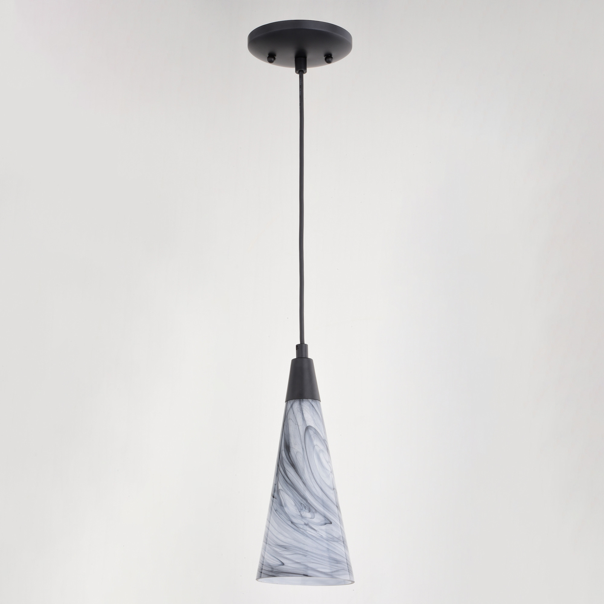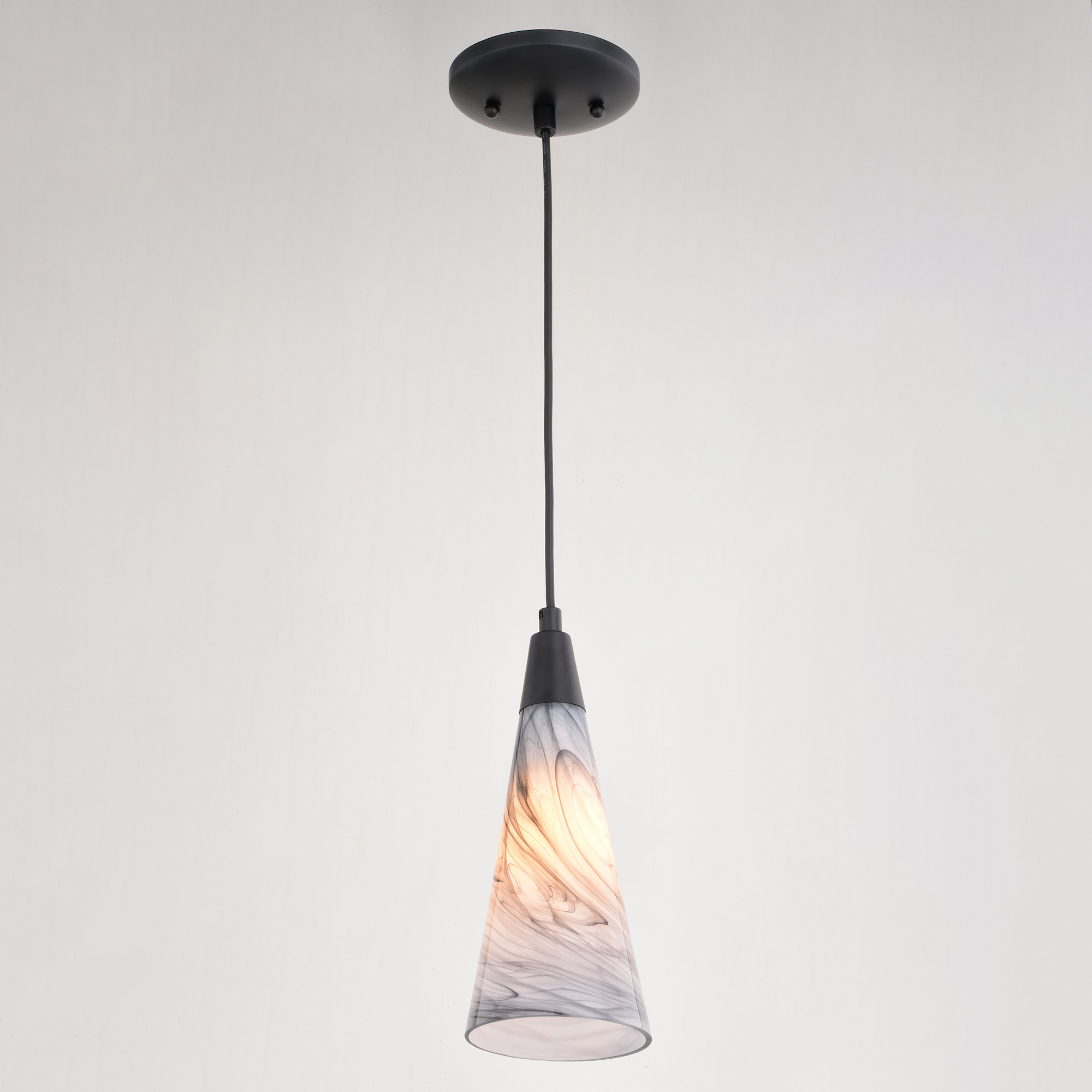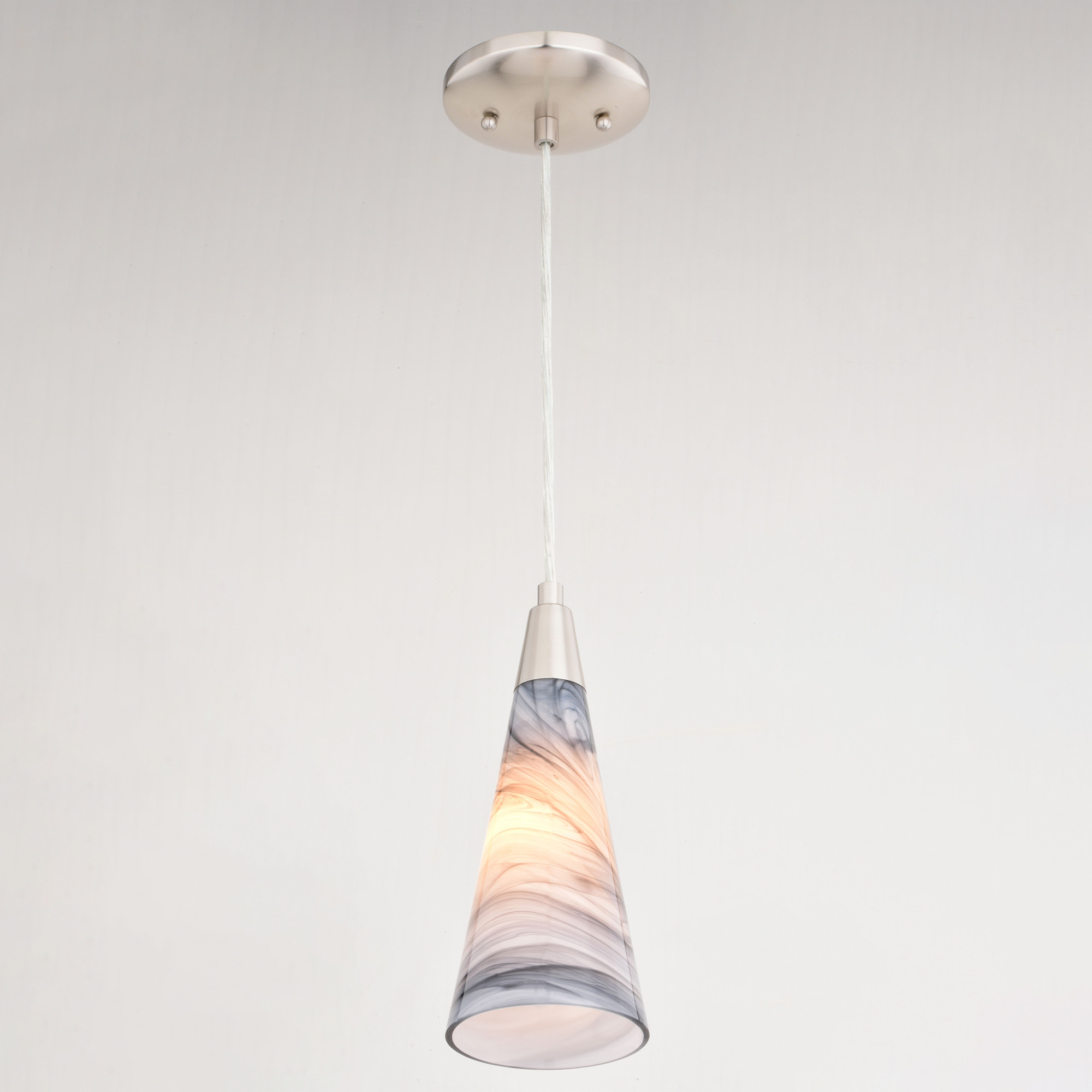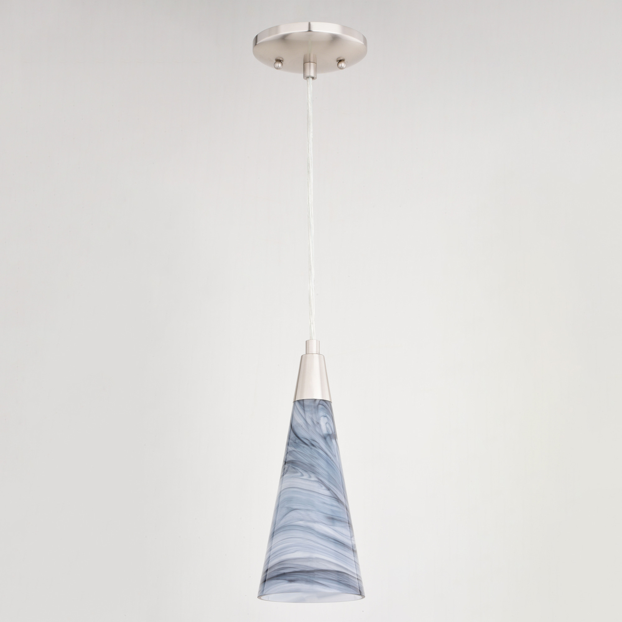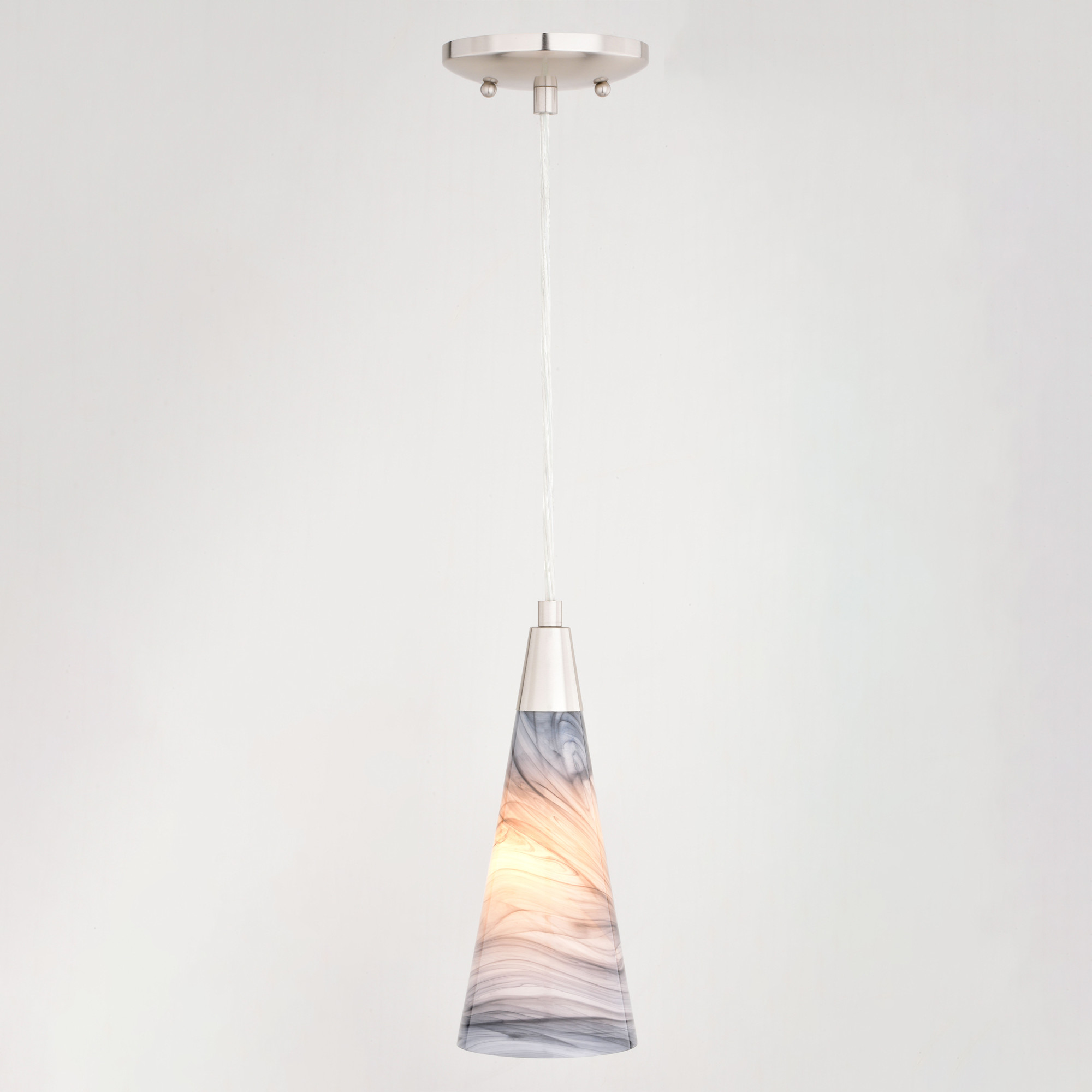 Item DescriptionThe Milano collection of art glass mini pendant lights feature hand-blown glass which gracefully blend into almost any decor. Because each glass is handcrafted utilizing century-old techniques, no two pieces are identical. The marble swirl colored glass has tones of gray and silver in an updated elongated cone shape. Install this mini pendant individually or in a grouping; ideal for kitchens, dining areas, or bar areas.