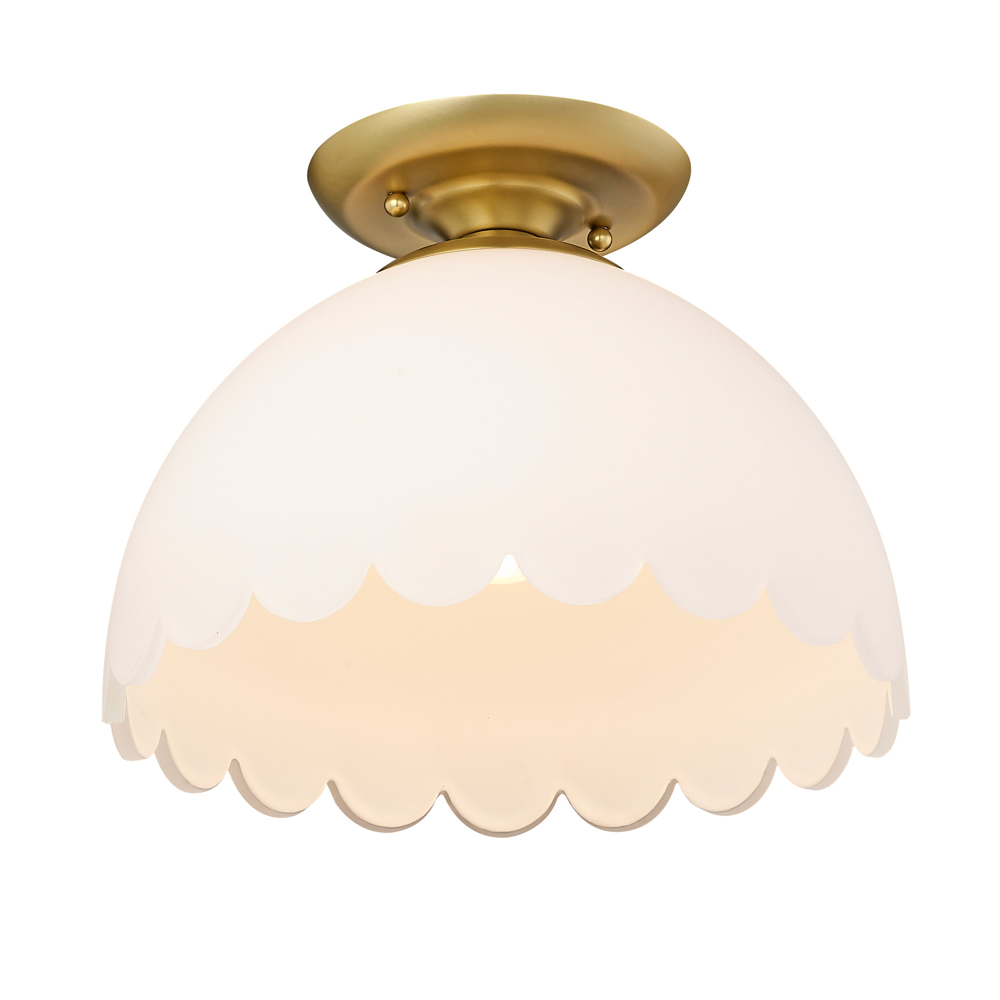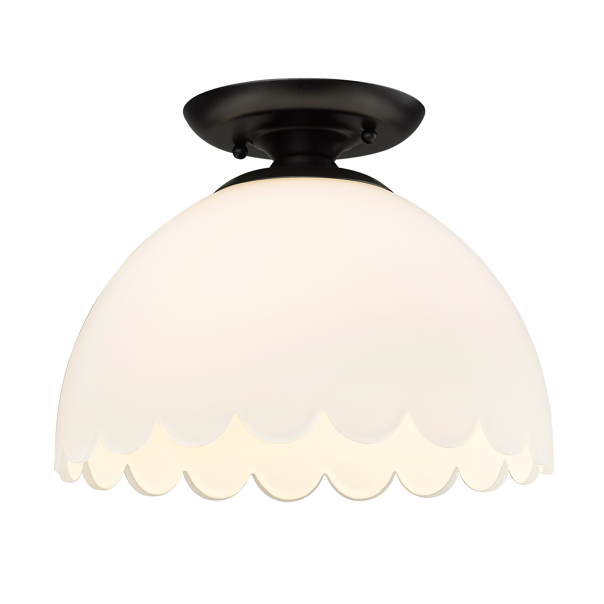 Item DescriptionThe Dorinda's transitional design is fit for a variety of decors. The scalloped opal glass shade gives the fixture a gentle, whimsical feel. When lit, the smooth glass glows warmly. The Dorinda has a sweet, classic look that is ready to grace your home.