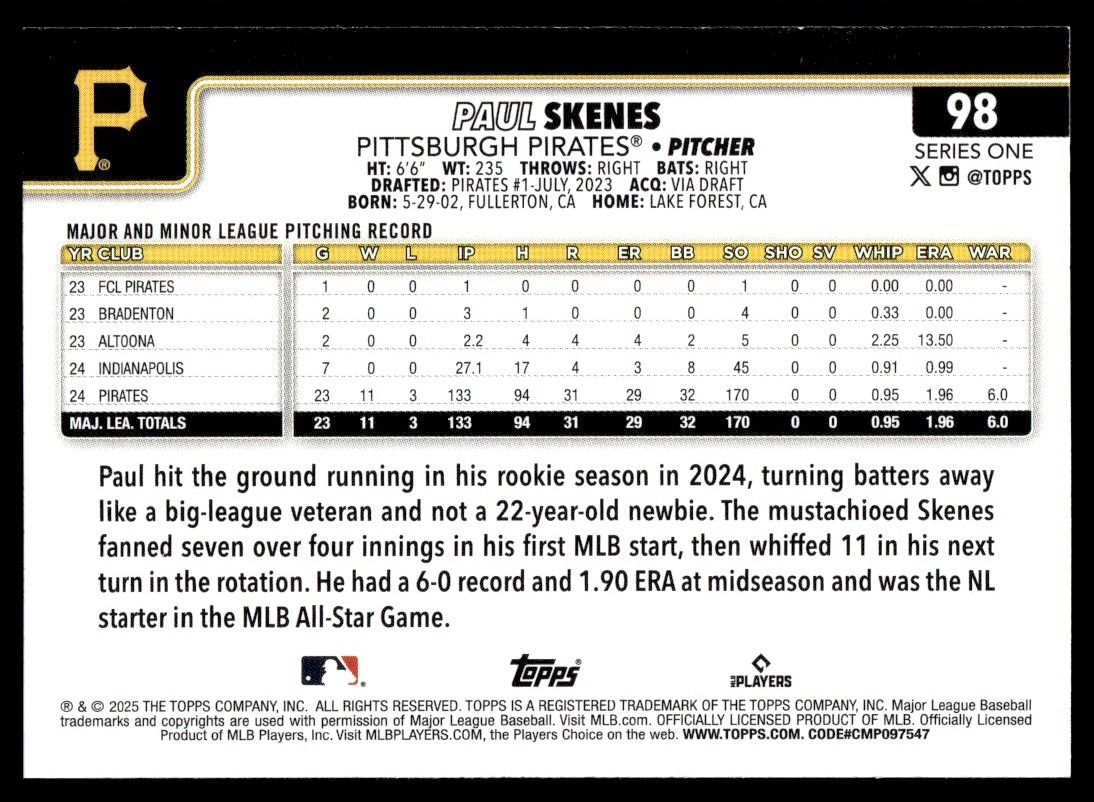 | 2025 Topps Paul Skenes Pittsburgh Pirates #98 |