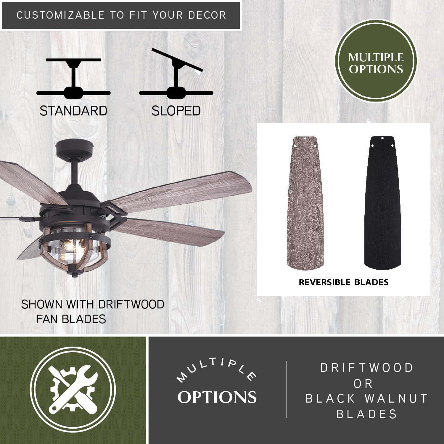 - Matte Black and Rustic Oak finish includes reversible Medium Wood fan blades