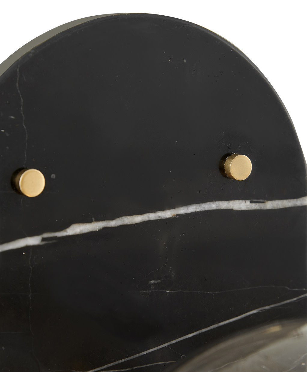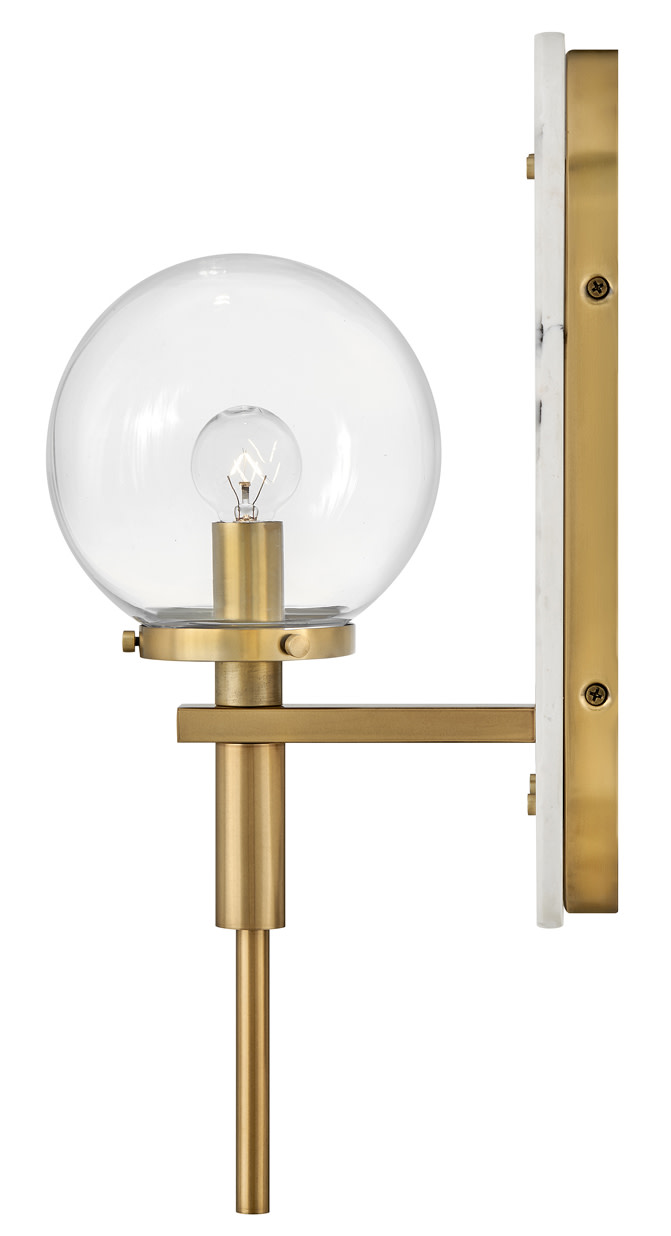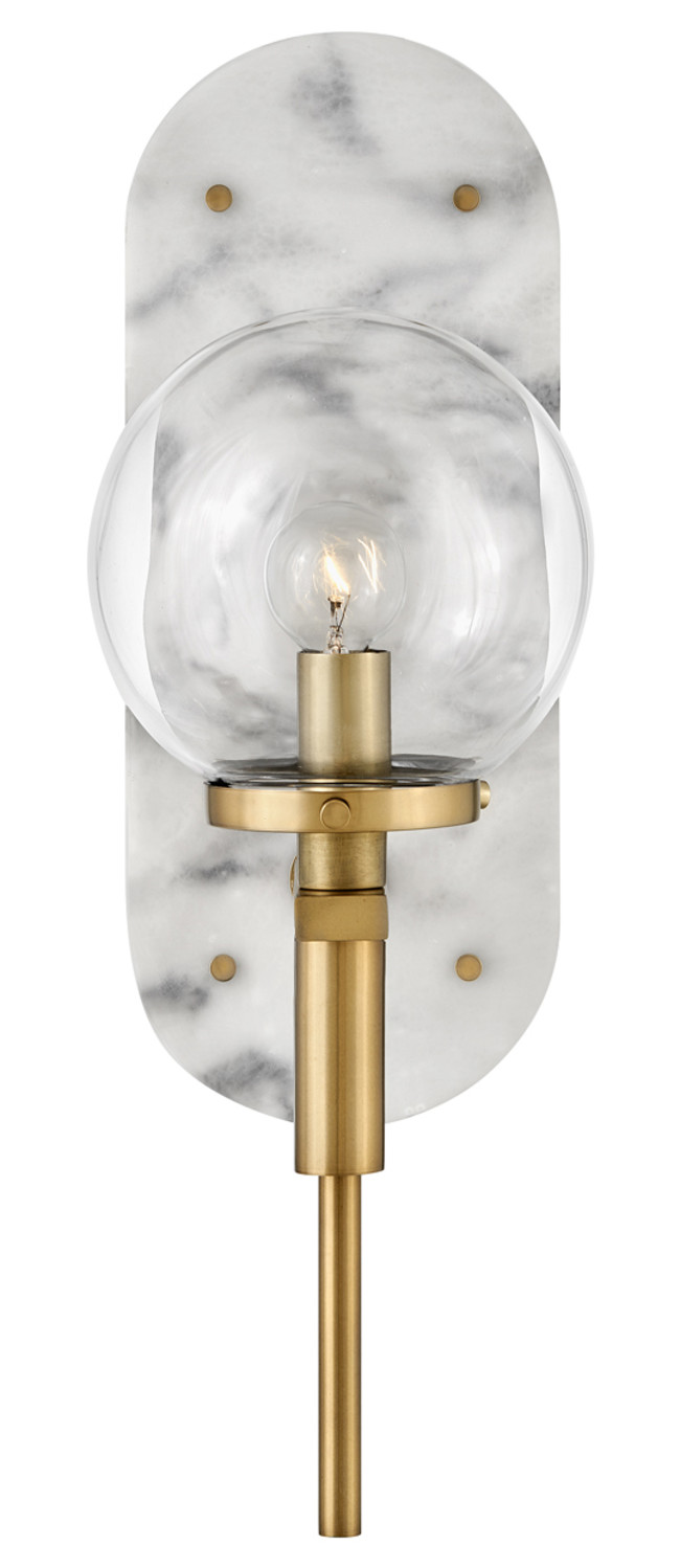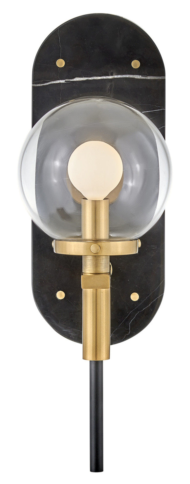 An alluring profile that blends a vintage and modern aesthetic, Gilda is the best of both worlds. This show-stopping sconce showcases a large clear glass globe atop a brass stem with contrasting rivets on a luxurious Black Marble or Faux Alabaster backplate. Gilda features a concealed on/off switch and removable cord and can be hardwired or plugged in.