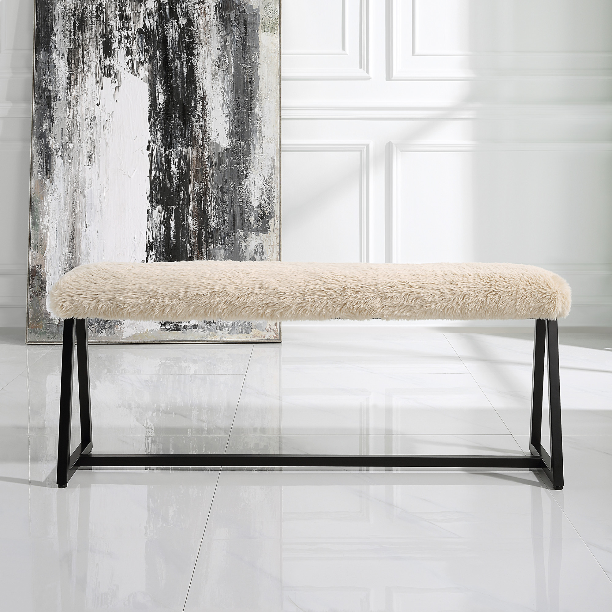 Item DescriptionA space saving seating solution featuring a slim bench seat upholstered in plush long haired faux sheepskin in a toasty beige over a matte black finished iron base.