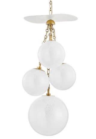 Item DescriptionInspired by dangle earrings, Antoinette is jewelry for the wall or ceiling. Cloud glass globes with shade caps hang from an intricate chain in a matching metal finish. The Gesso disc adds visual interest and picks up the light from the globes below.