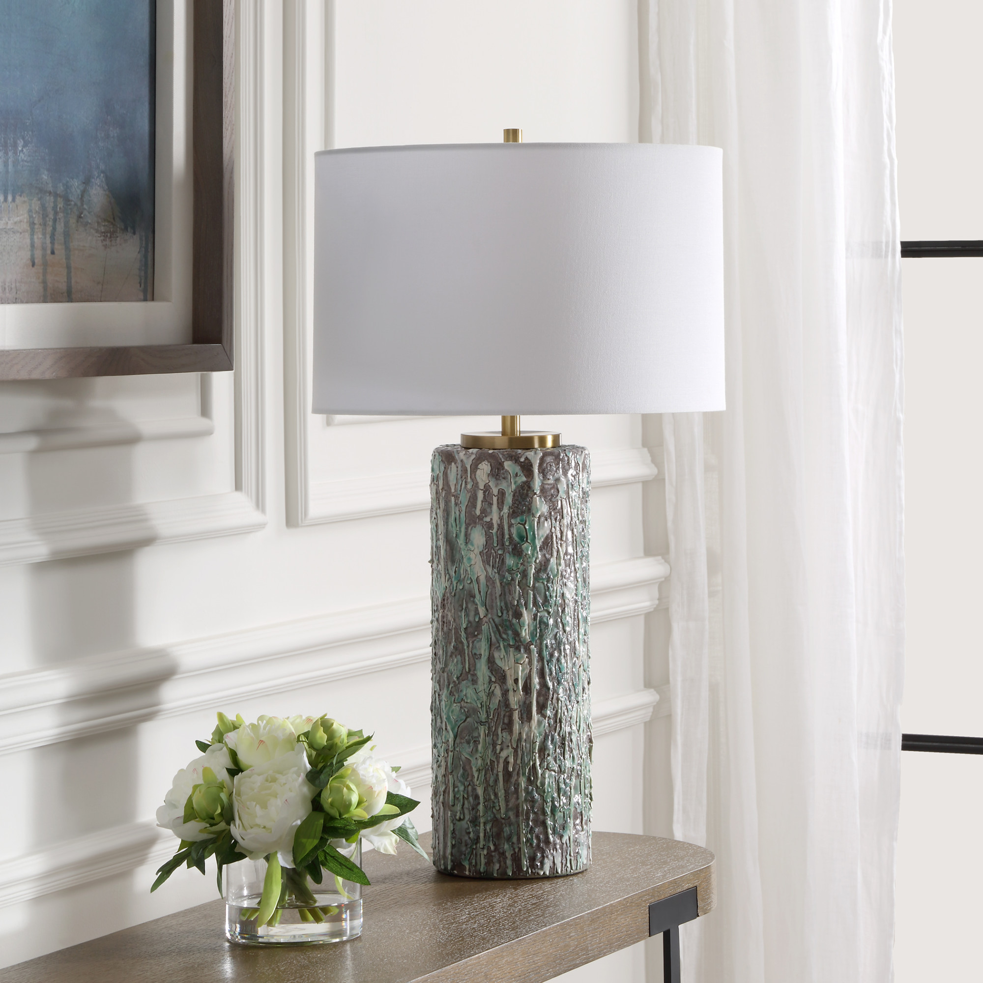Item DescriptionThis table lamp is inspired by abstract forms, featuring a ceramic base that boasts a heavily textured glaze, set against a dramatic background. Plated details add a touch of sophistication to this striking piece. The round hardback drum shade is a crisp linen fabric.