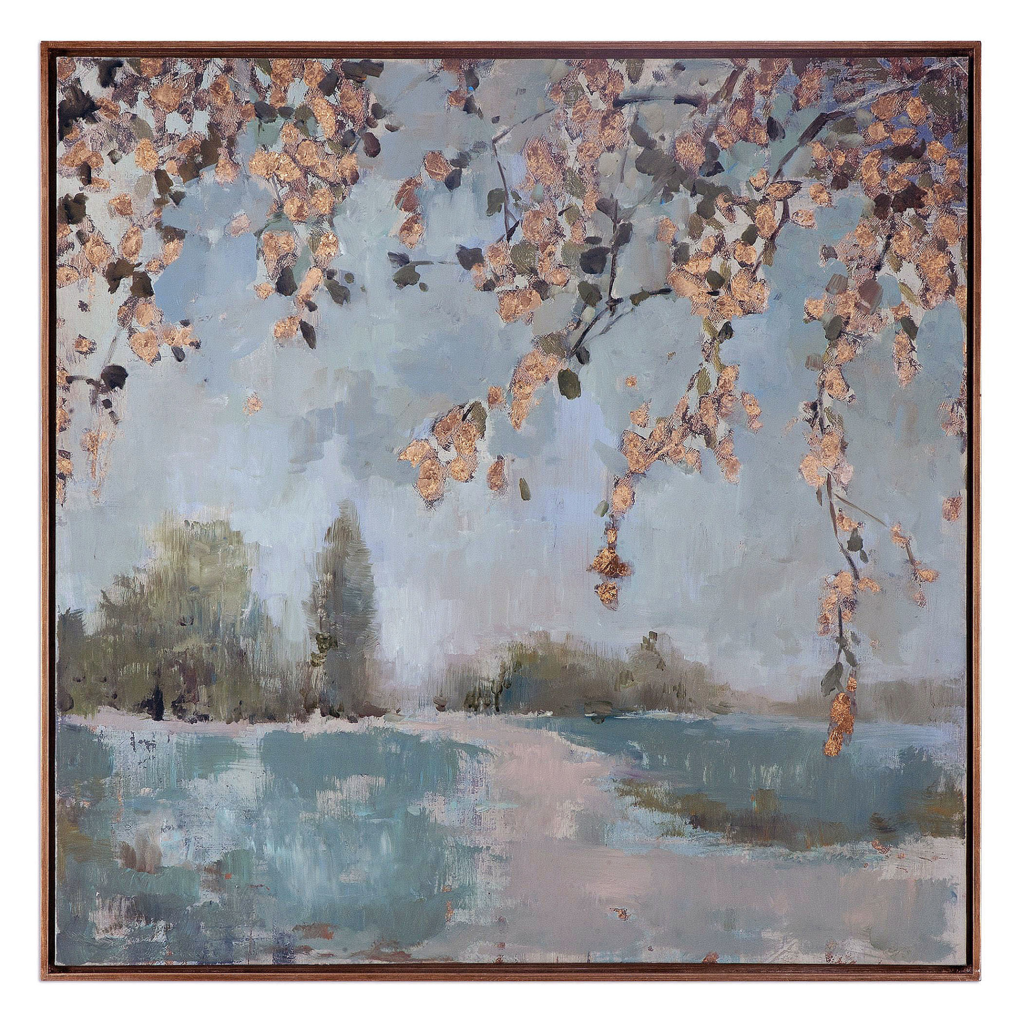 - Hand painted canvas with a gold accented frame with pale grey undertones