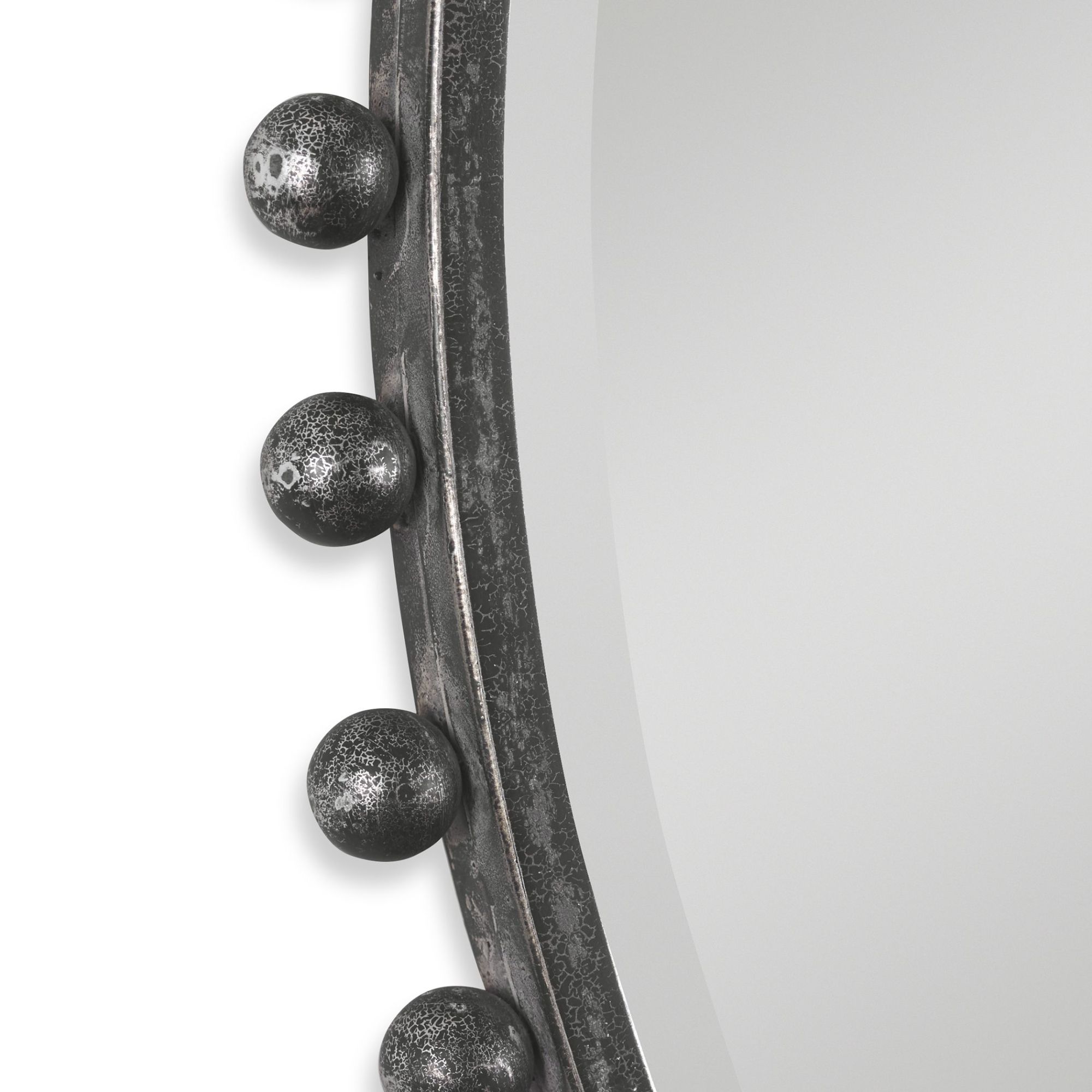 Item DescriptionPetite iron spheres line the outer edge of this round frame, finished in a distressed black with silver highlights and a light gray glaze