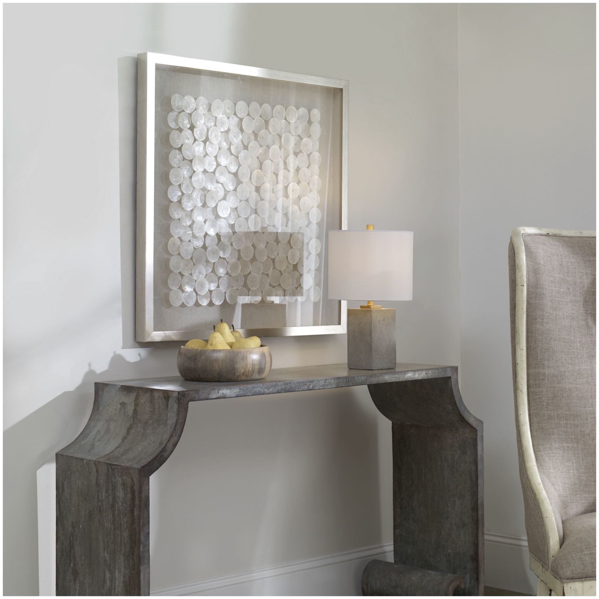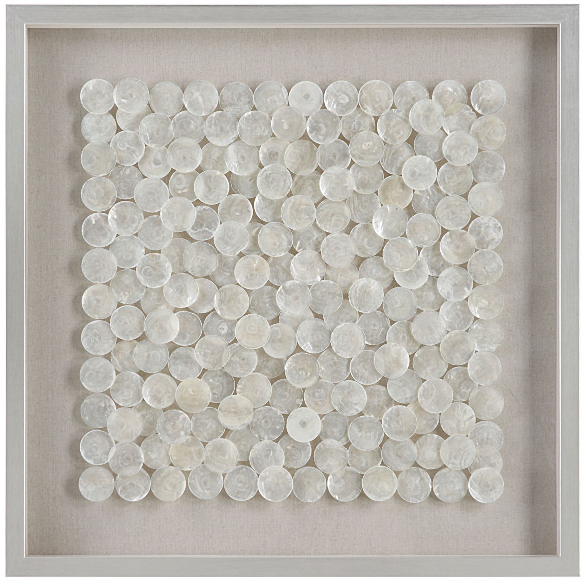 - Known as the windowpane oyster for it's transparent qualities, the natural layered Capiz shells shimmer in this shadow box style wall piece