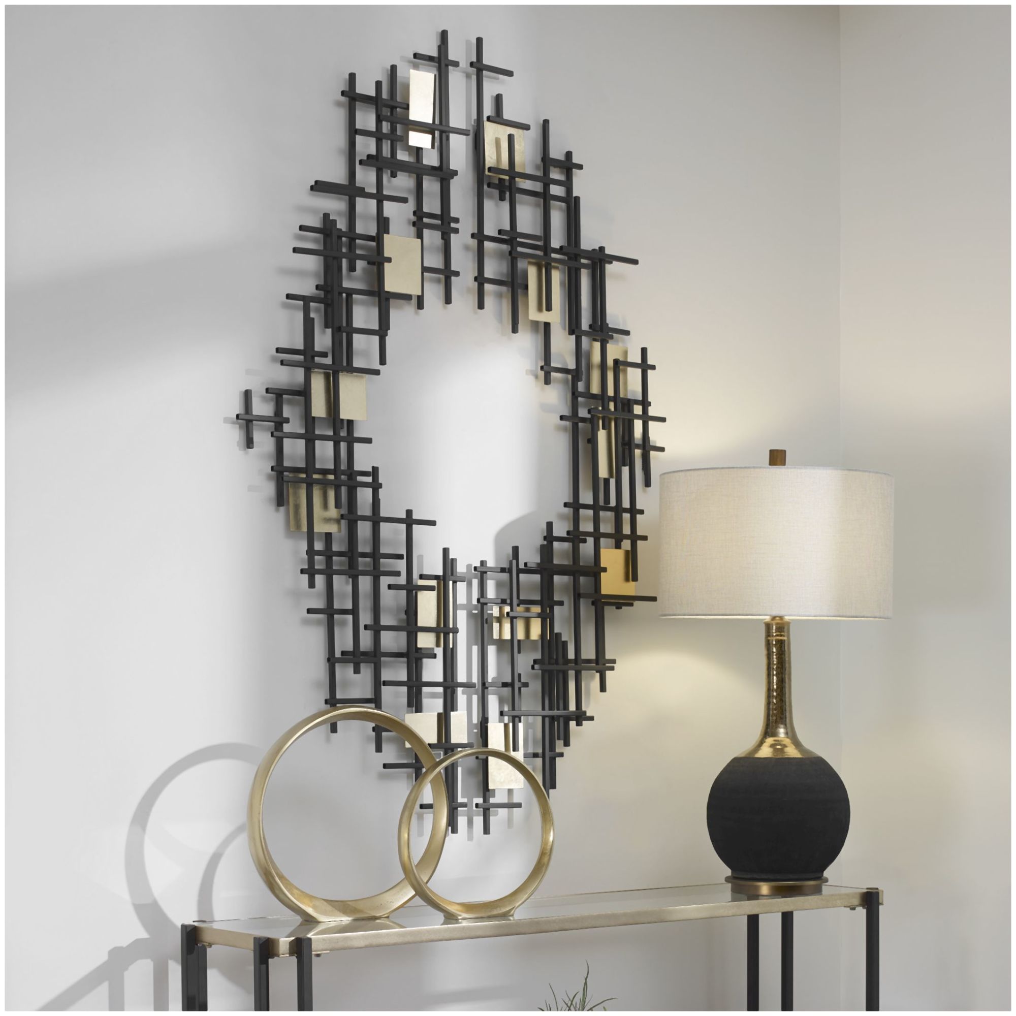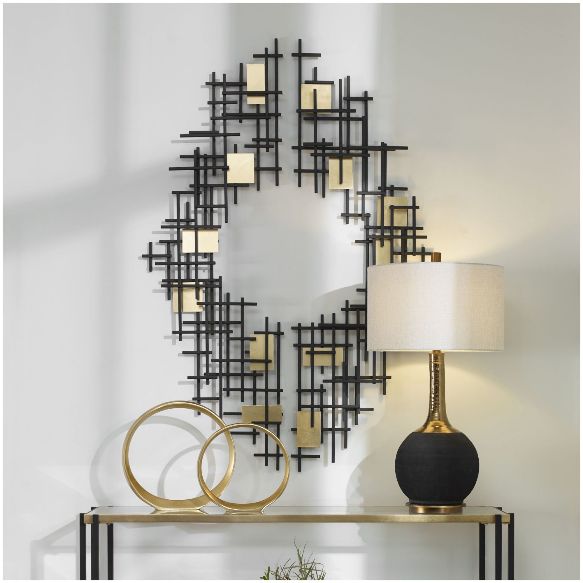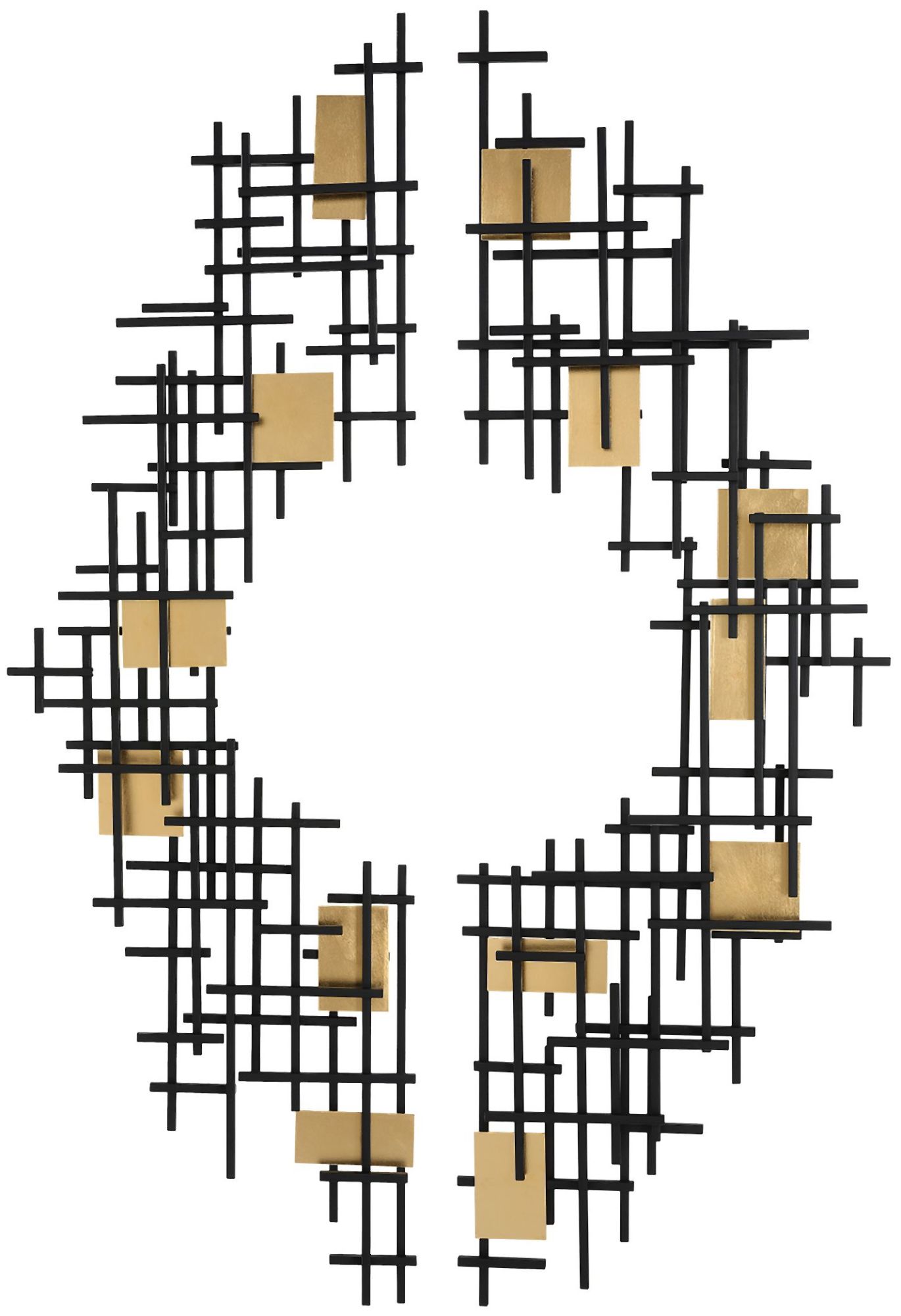 - Set of two abstract wall pieces display overlapping iron grids finished in matte black with gold leaf accents
