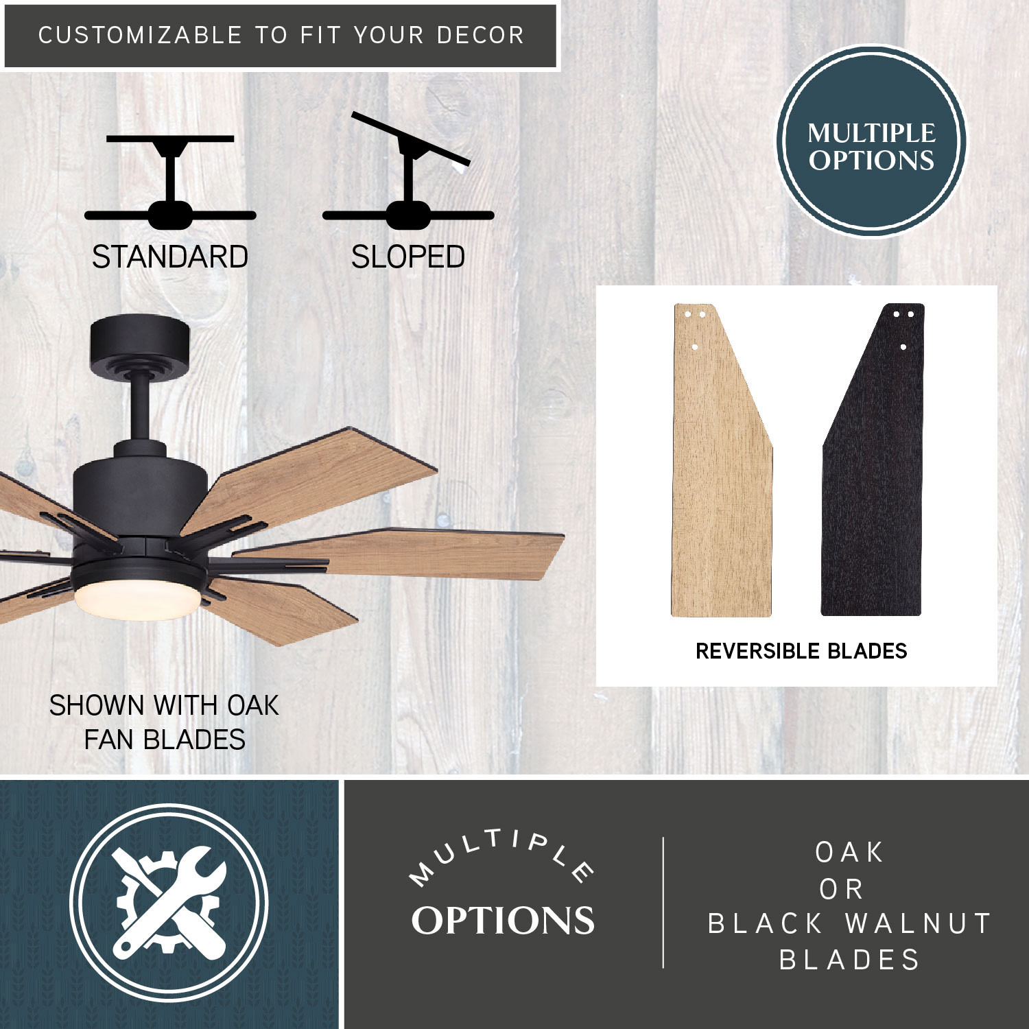 - Includes reversible Oak / Black Walnut fan blades