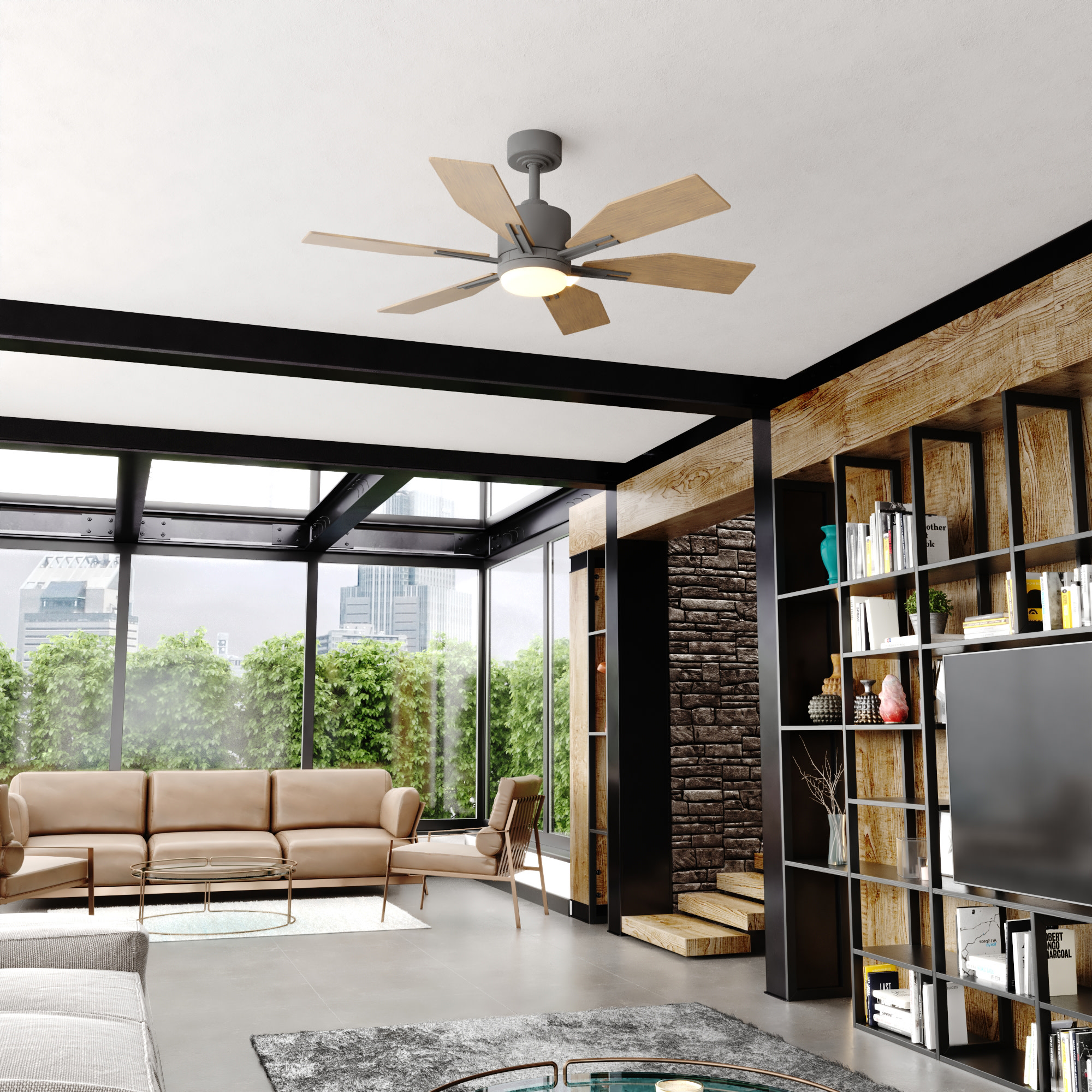 Item DescriptionThis ceiling fan called Mayfield is a real looker! Six squared off wood toned blades are held in place with matte arms. The cool and warm tones play well together giving it a comforting aesthetic. The Integrated LED light kit provides the right amount of light for a completely functional space.