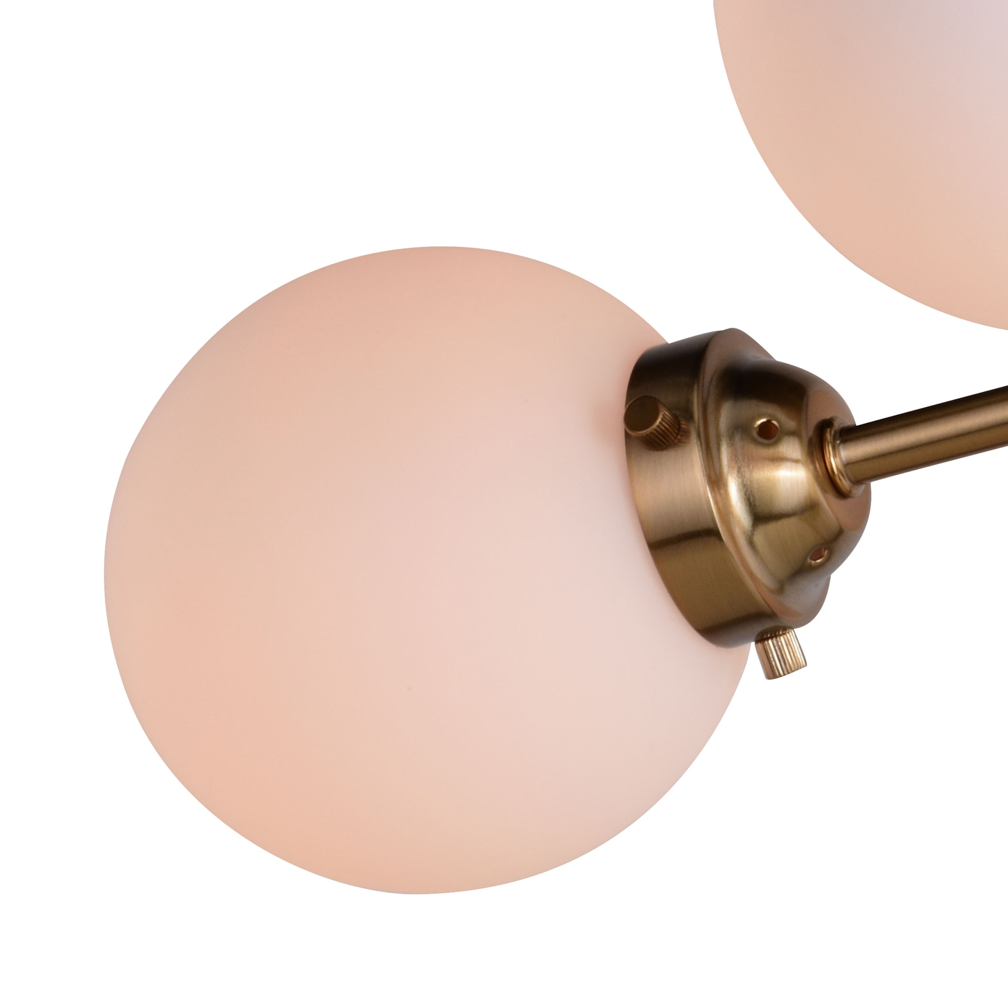 Item DescriptionThe Orbit sputnik collection is characterized by its retro flair. Outstretched arms are punctuated with frosted opal white glass globes. The muted brass finish showcases a familiar look from a mid-century modern time. This semi-flush mount ceiling light is ideal for hallways, living rooms, bedrooms, entryways, or utility rooms.