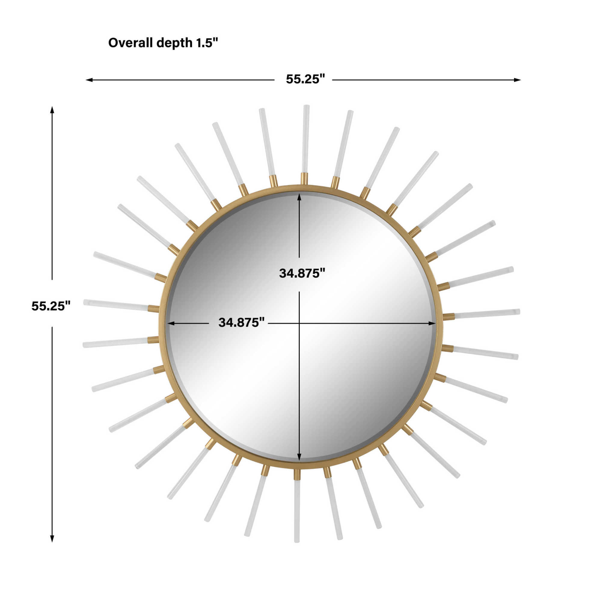 Item DescriptionThis stunning round is sure to make a statement in any space. The frame is crafted from forged iron finished in a metallic gold leaf, accented with clear acrylic rods. Mirror features a generous 1 1/4" bevel.