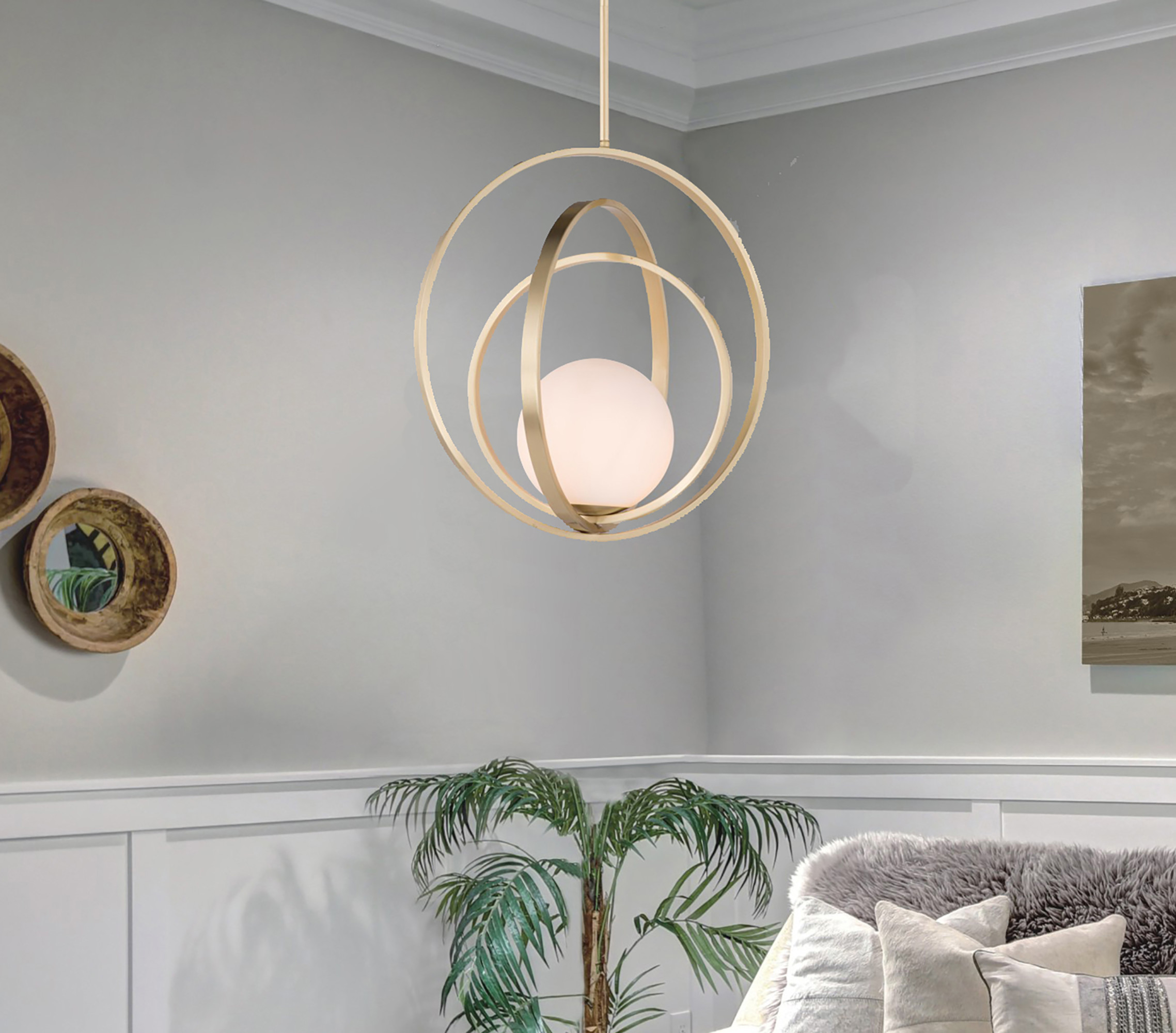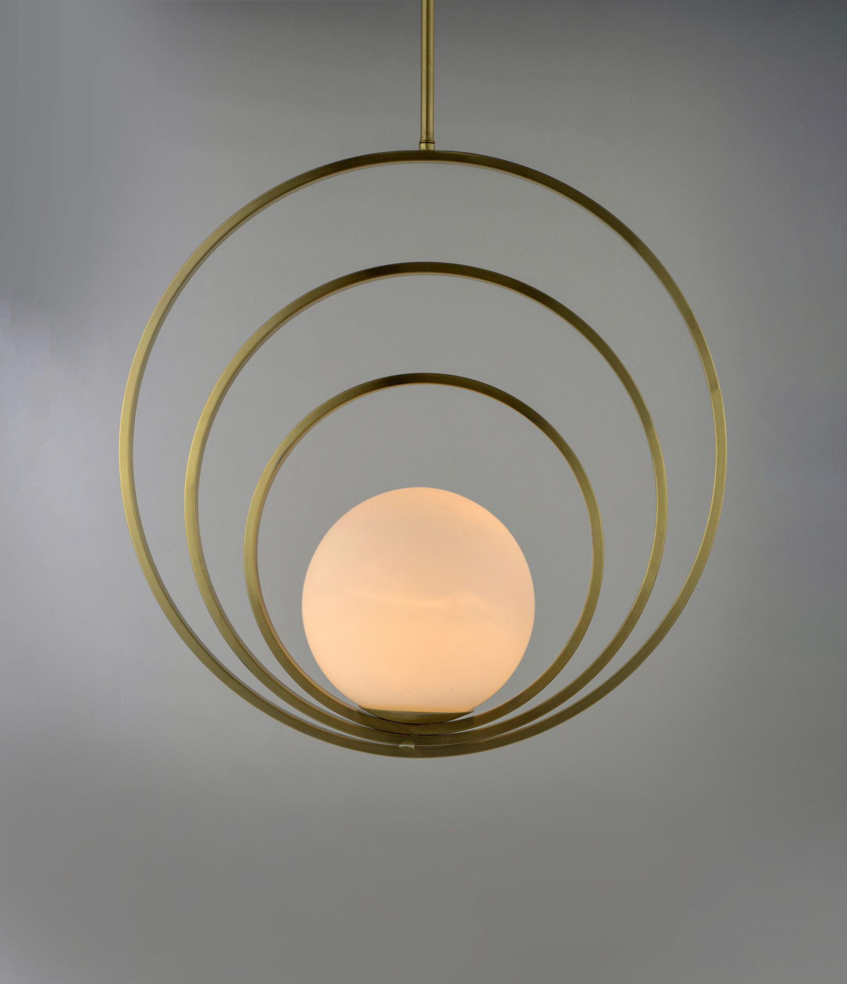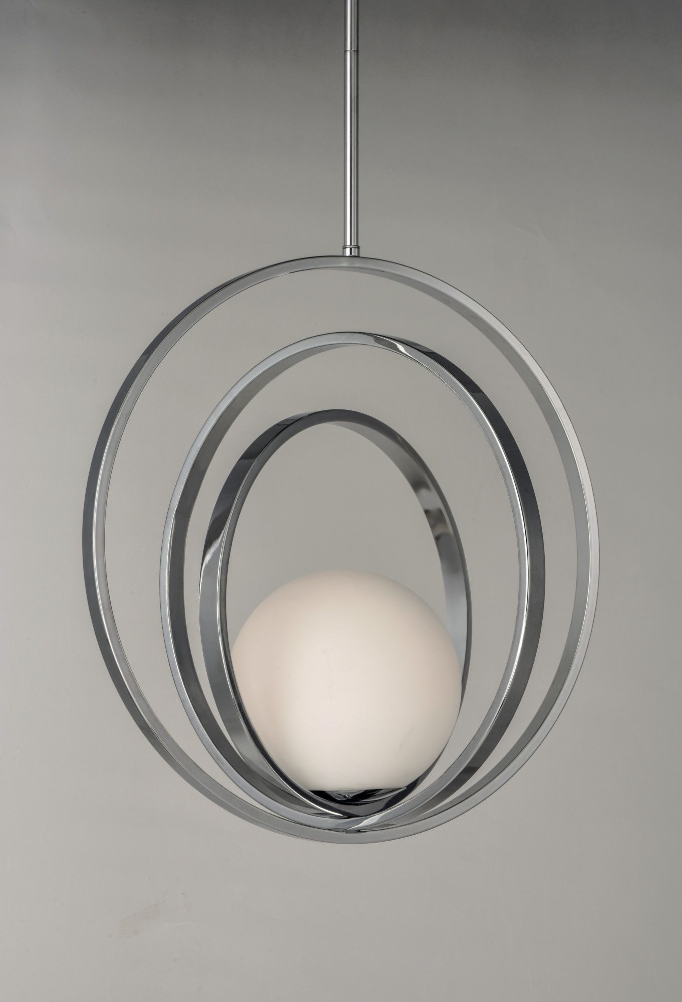 Item DescriptionAdjustable rings available in Polished Chrome or Satin Brass add dimension to this contemporary pendant design. Opal white glass softly diffuses light to complete the look.