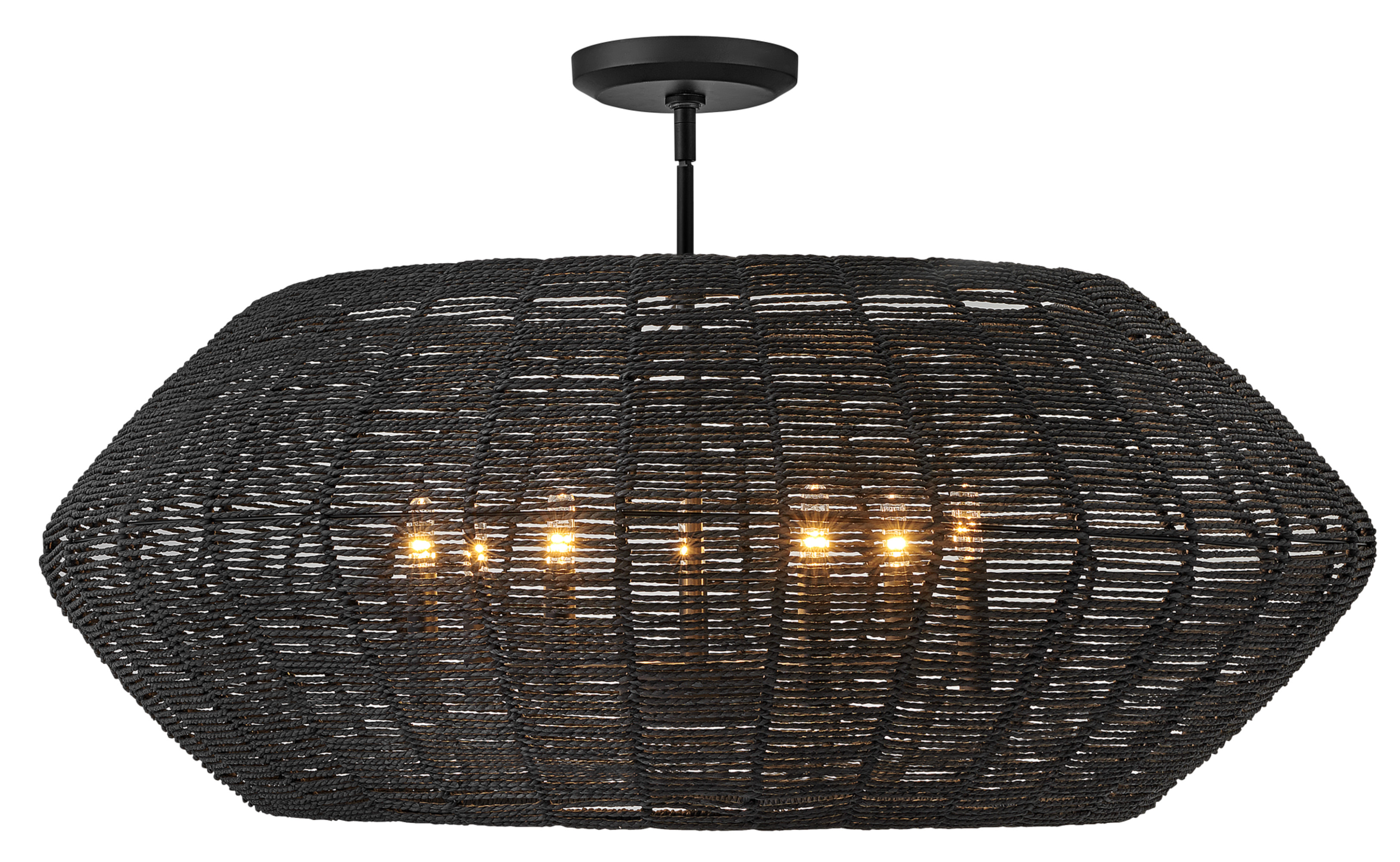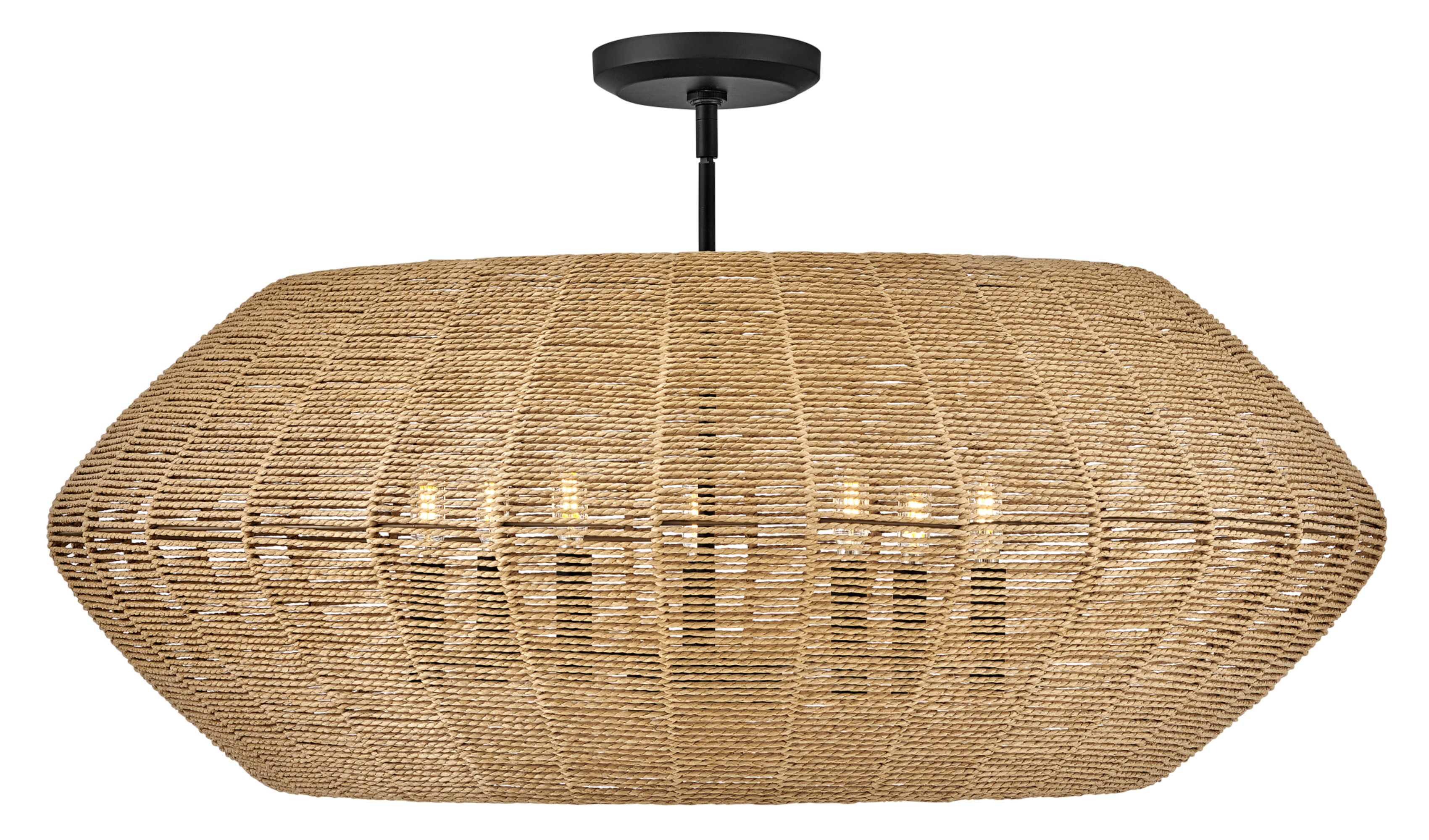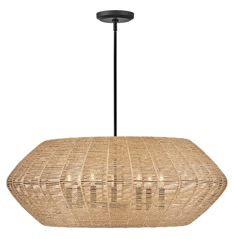 The Luca Collection's coastal vibe is permeated with a slightly exotic edge. The bold pendant showcases a robust, woven drum shade, and a full finished cluster for plenty of functional light offered in either Black with Black shade, Polished Chrome with Natural shade, or Black with Camel shade.