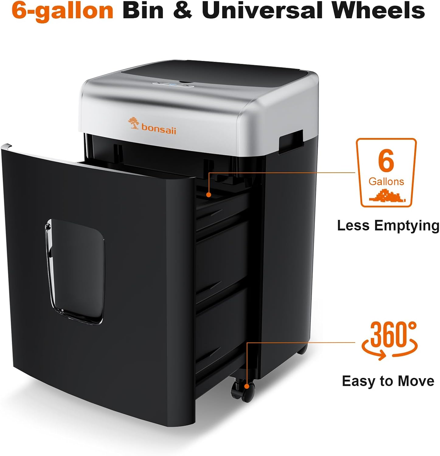 - Large Capacity & Easy to move: 6-Gallon pullout bin reduces the frequency of emptying. With 360-degree universal casters, you can move the heavy duty shredder freely.