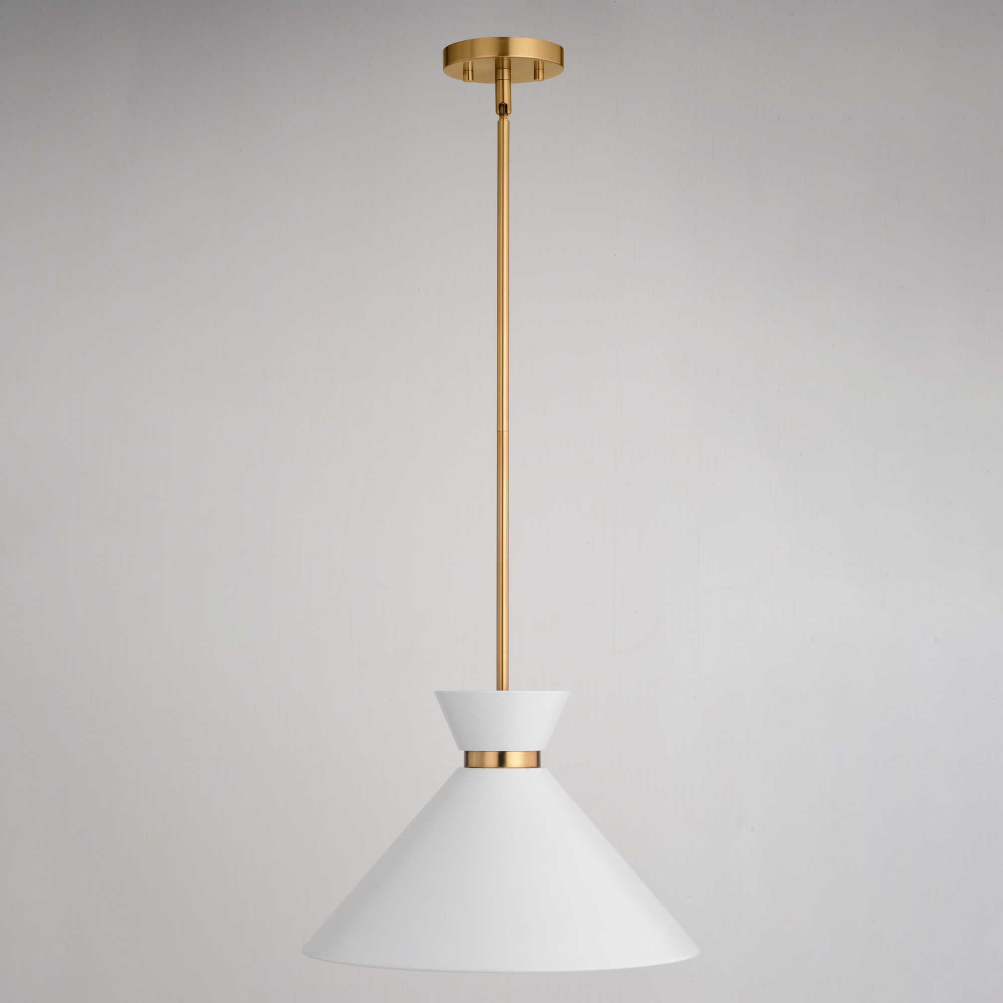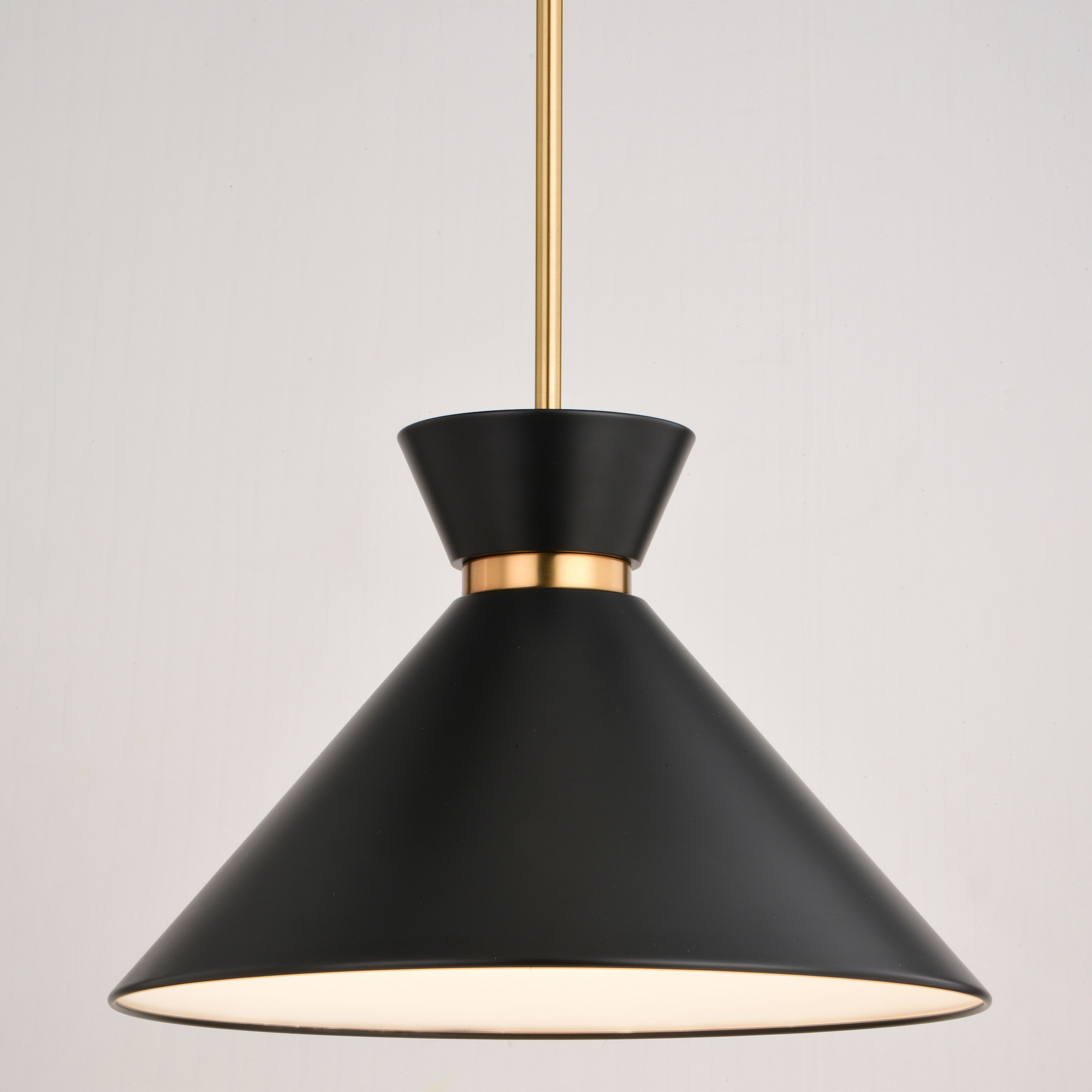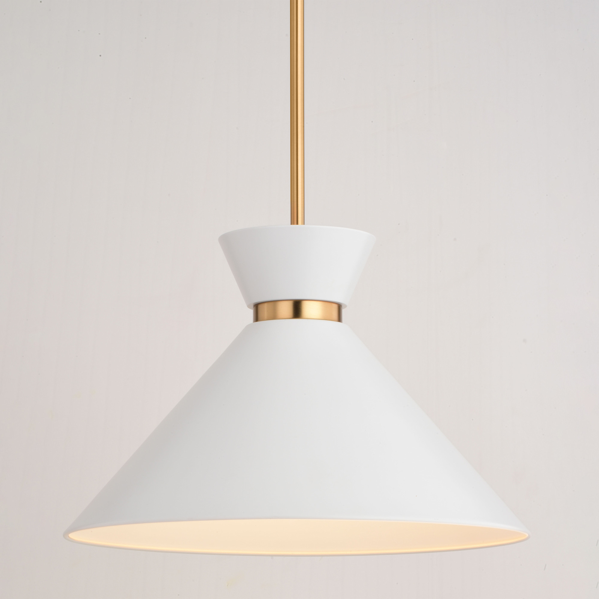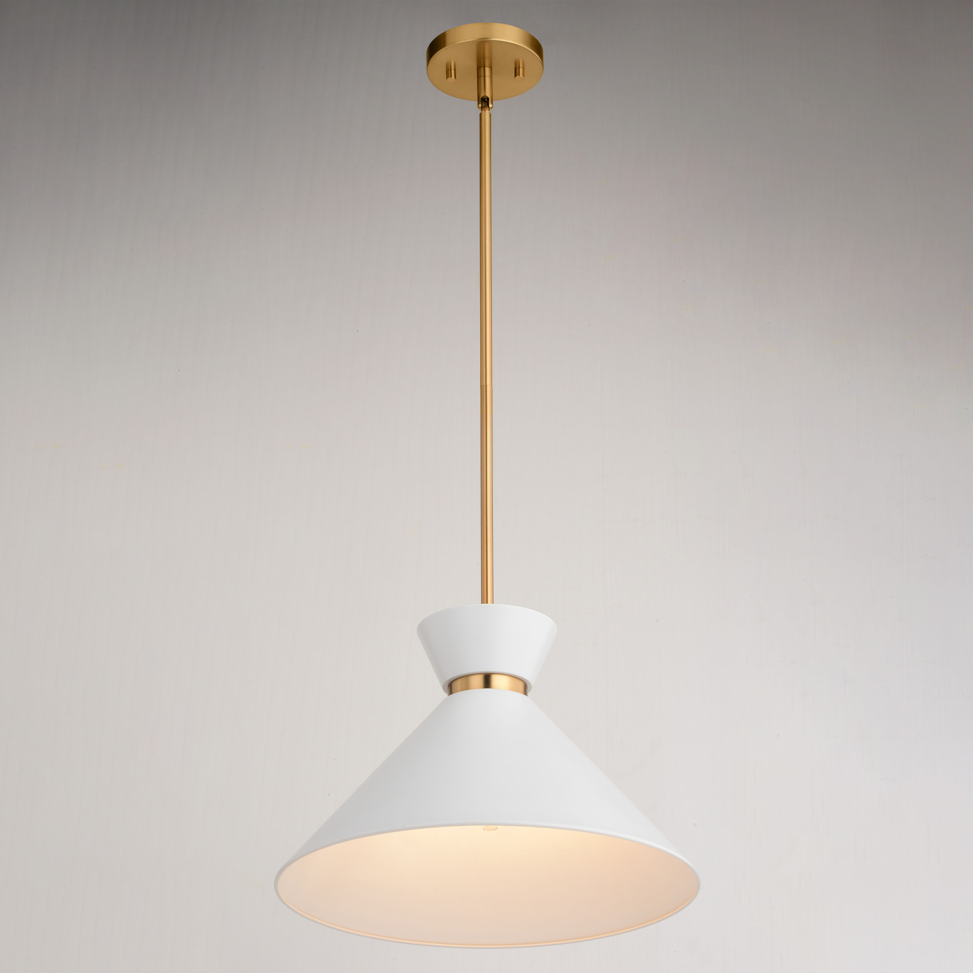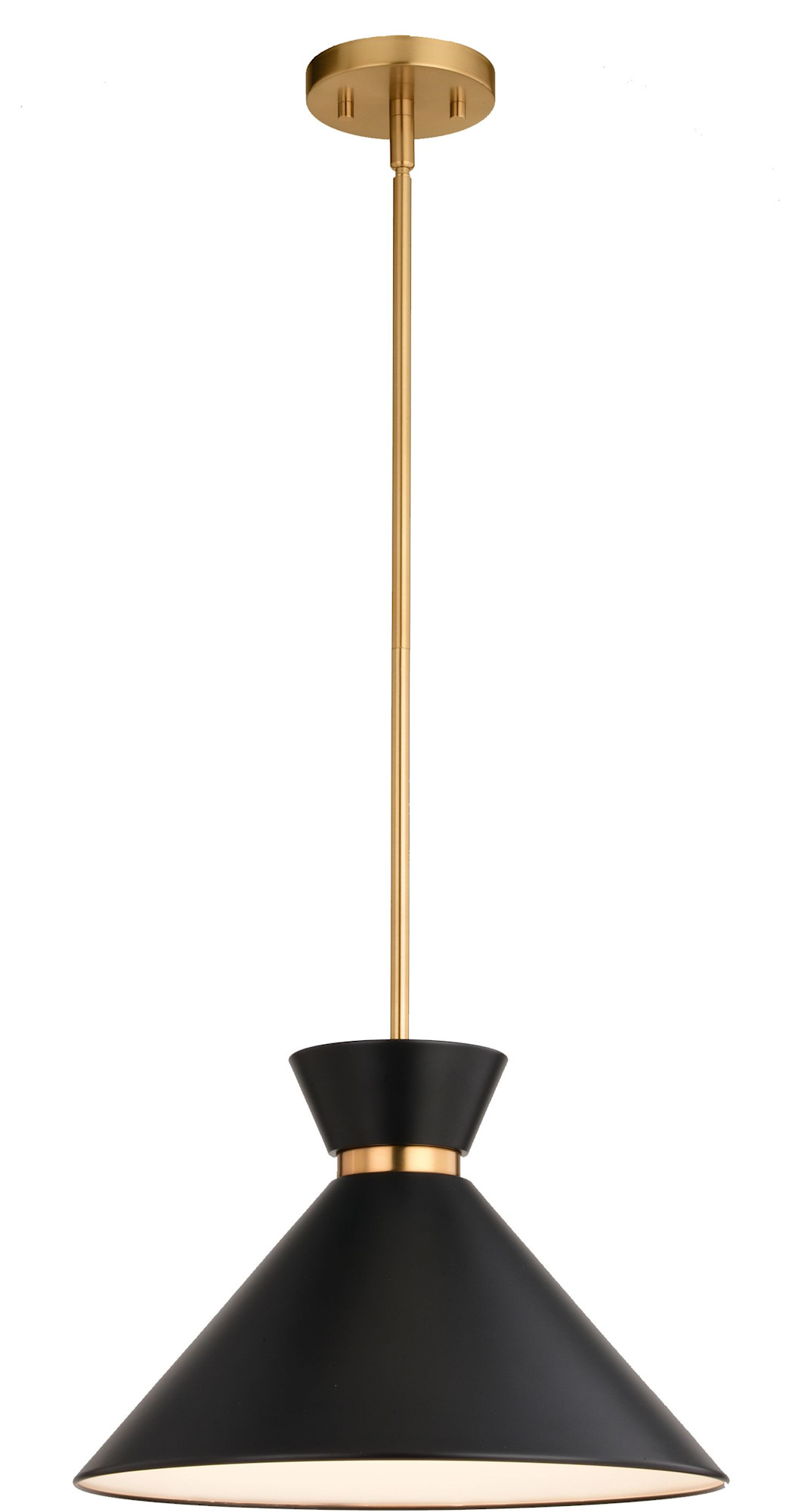 - Metal shade with white interior provides bright illumination and a mid-century modern feel