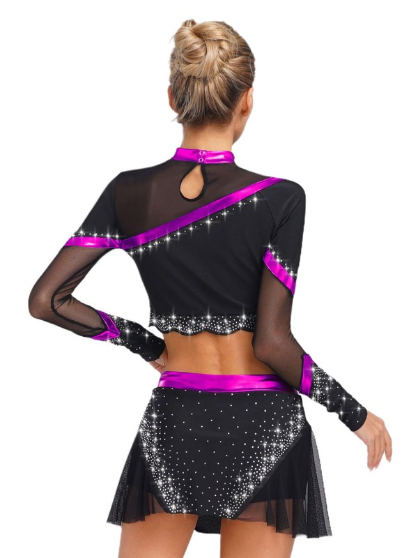 The rhinestone-adorned long-sleeve crop top adds a touch of sparkle and glamour, making it a trendy choice for stage performances.