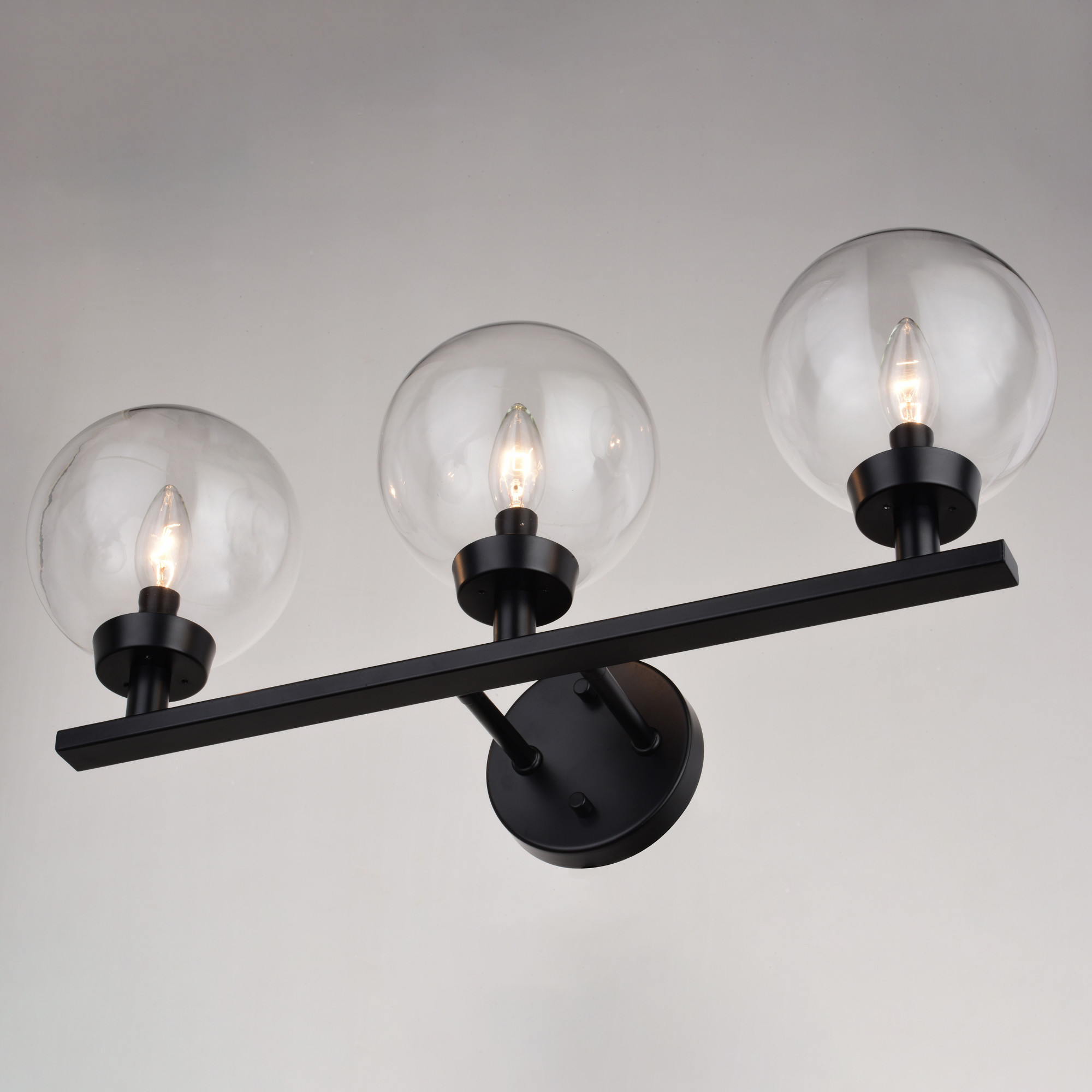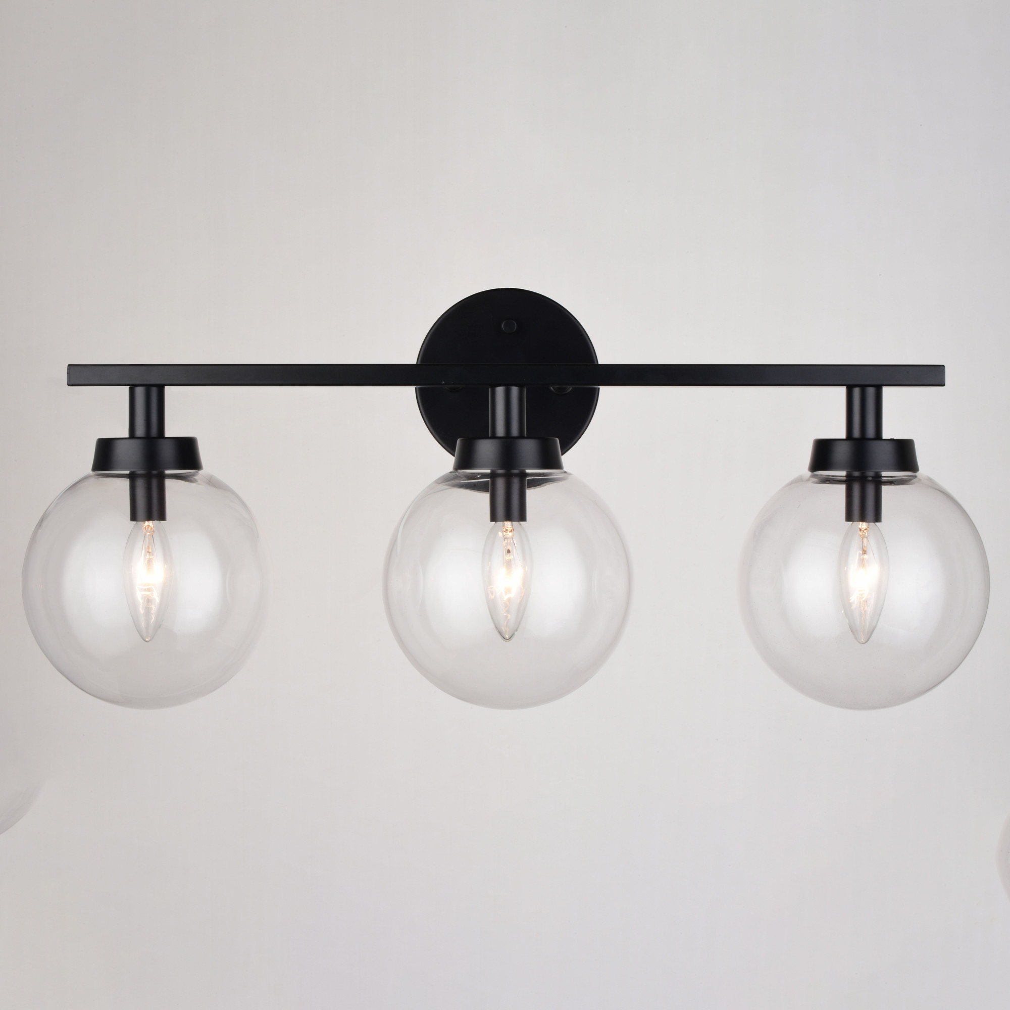 Item DescriptionThe Lander collection of interior lighting is contemporary style with flair. Distinctive metal arms support and highlight the round clear glass globes. This vanity light is a perfect addition to your bathroom, kitchen, or any other living area where a little extra style is desired.