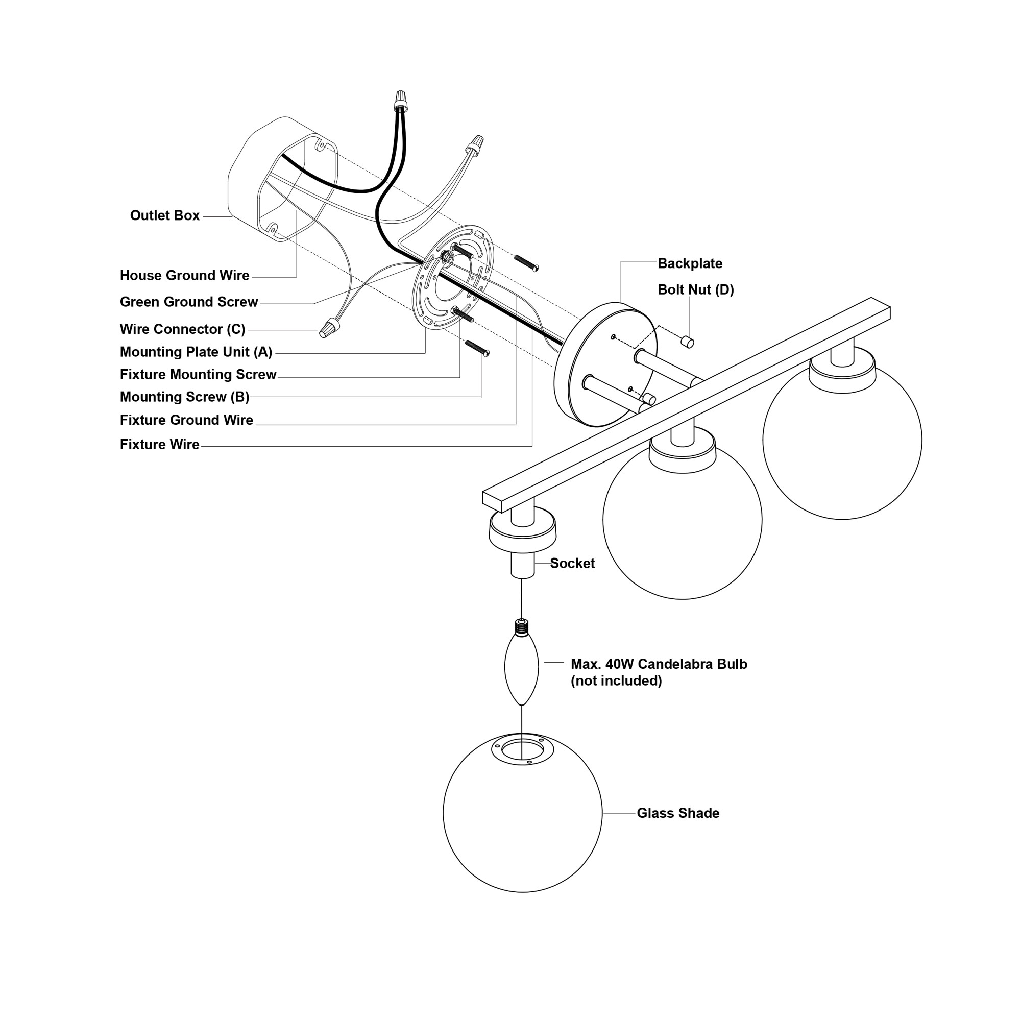 - (3) candelabra (E12) 40 watt bulbs required (not included)