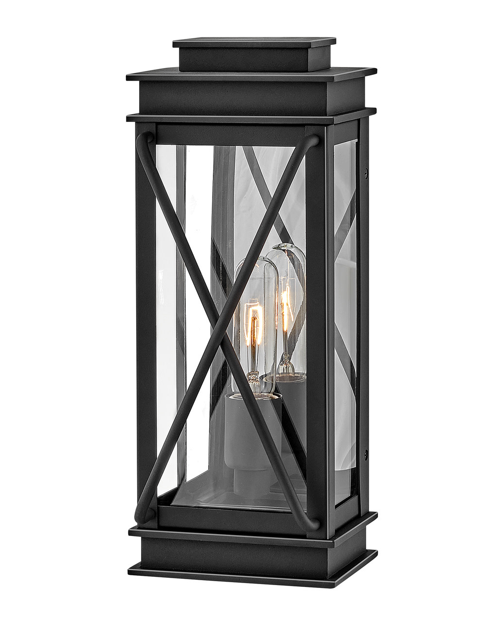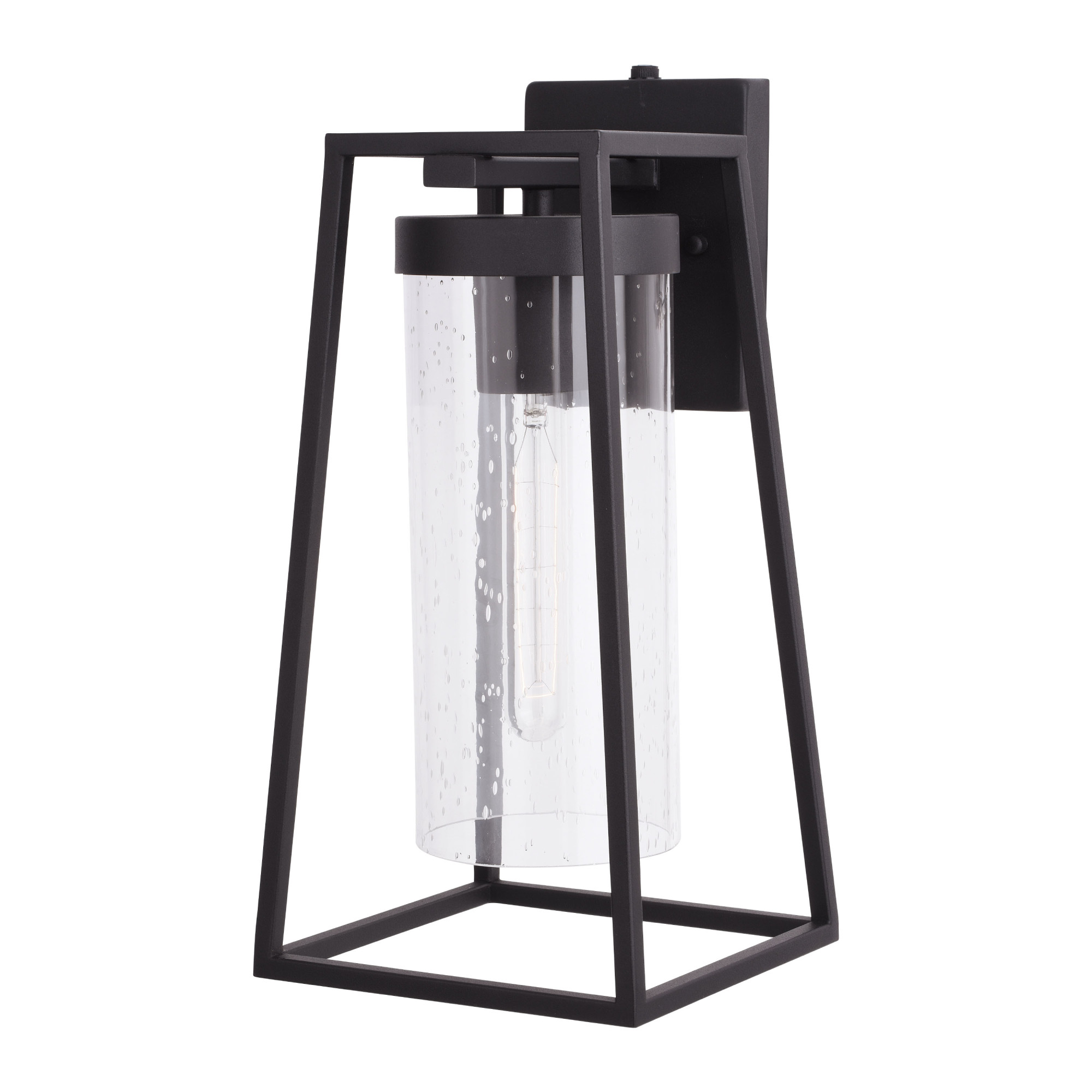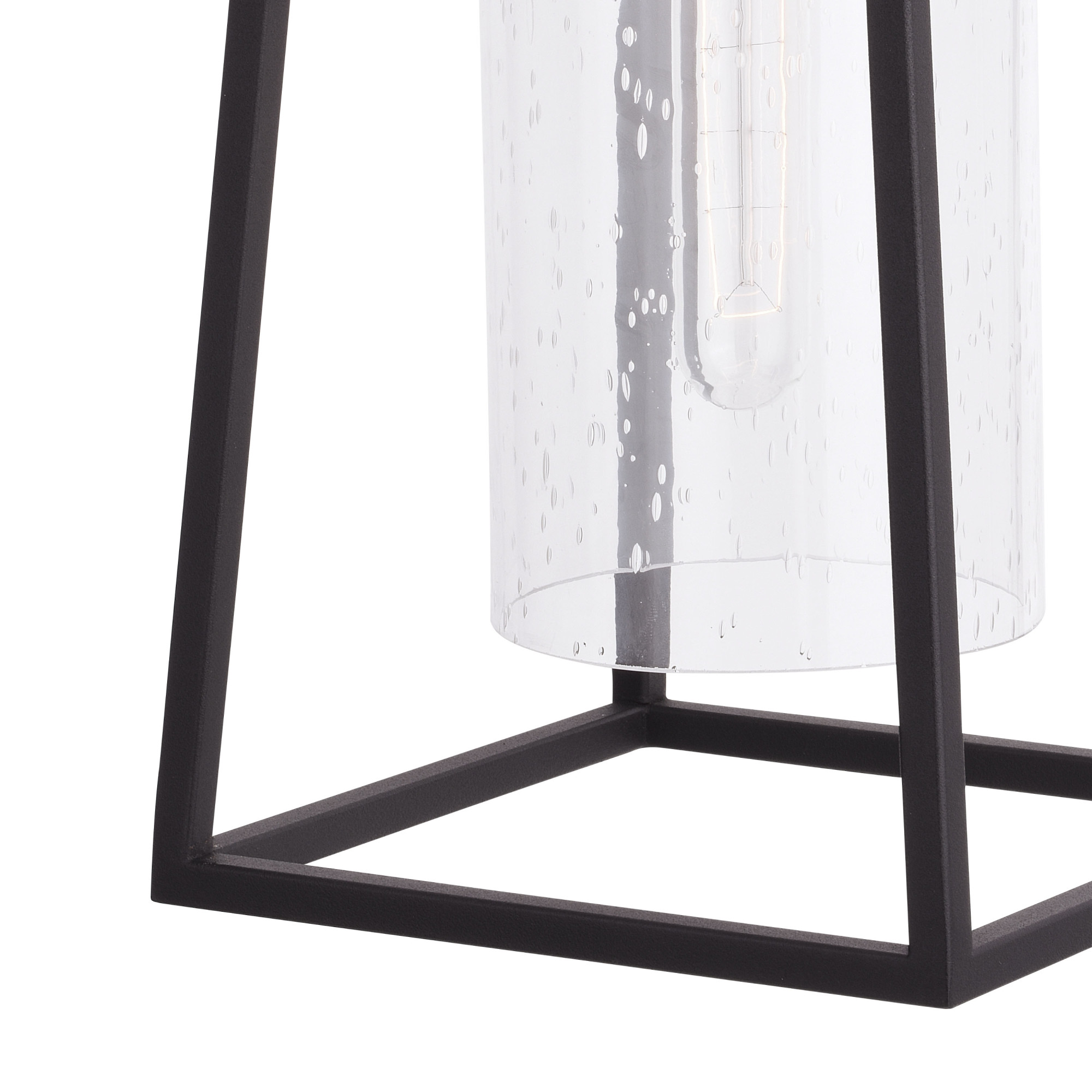 - Elongated, open framework design and paired with a cylindrical, clear seeded glass shade