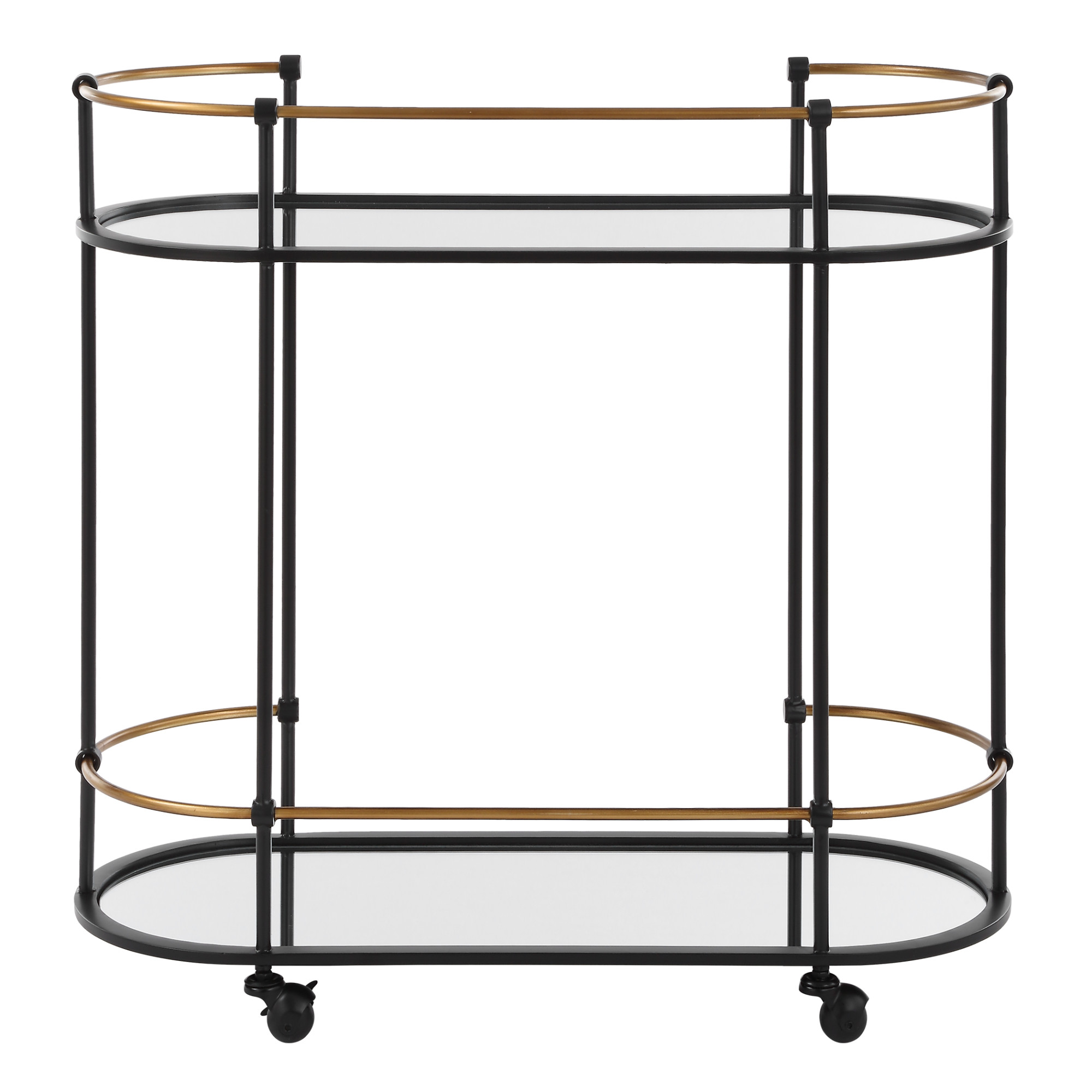 Item DescriptionHighlighting a clean pill shaped design this bar cart brags of metal legs. Two plain mirrored shelves act as stylish space for your favorite glasses and spirits. Complete with rolling and locking casters.
