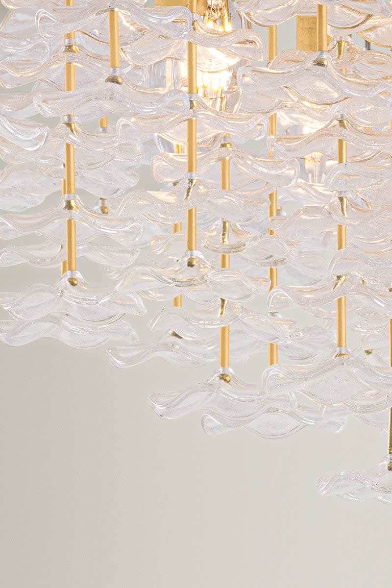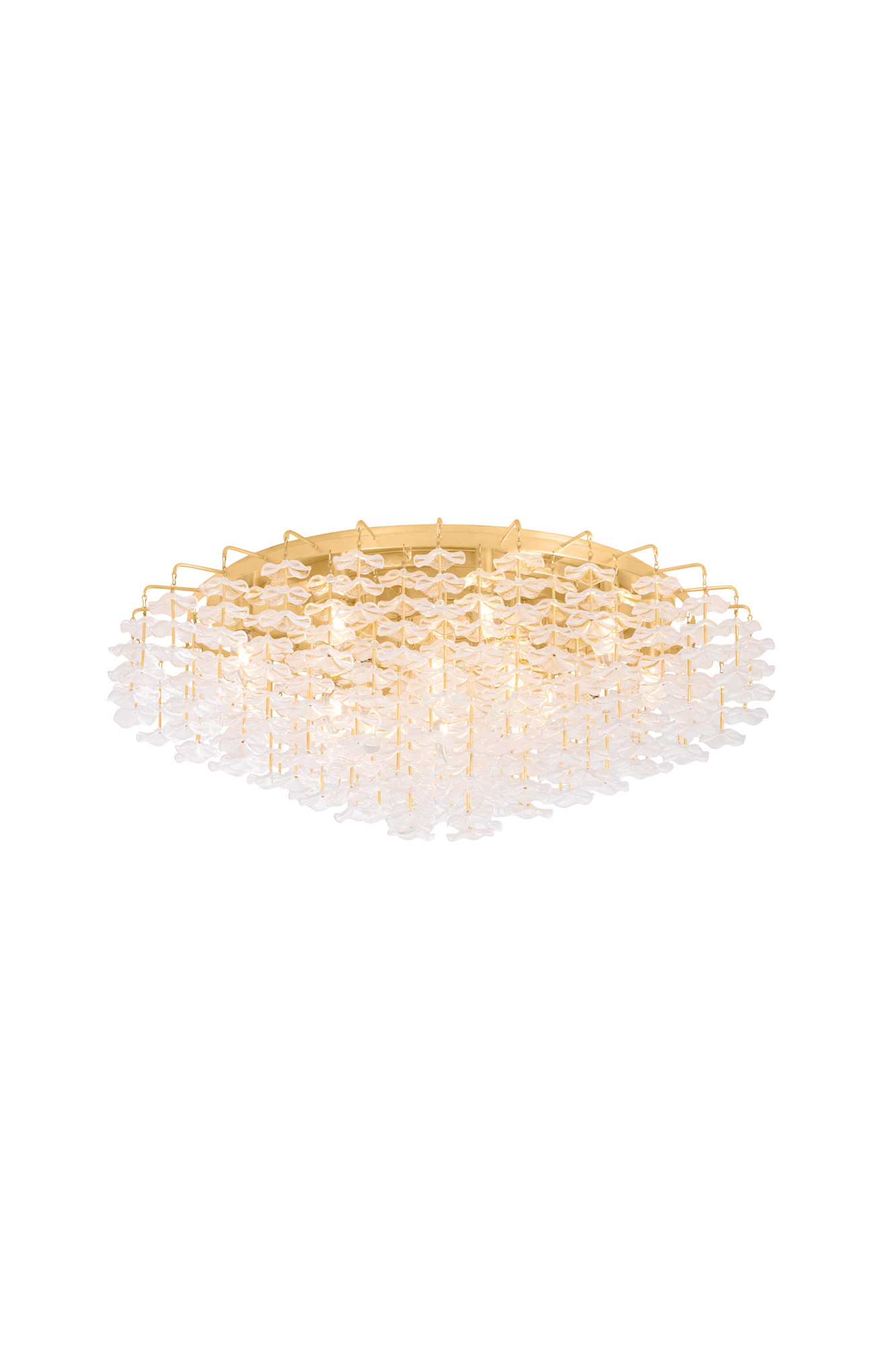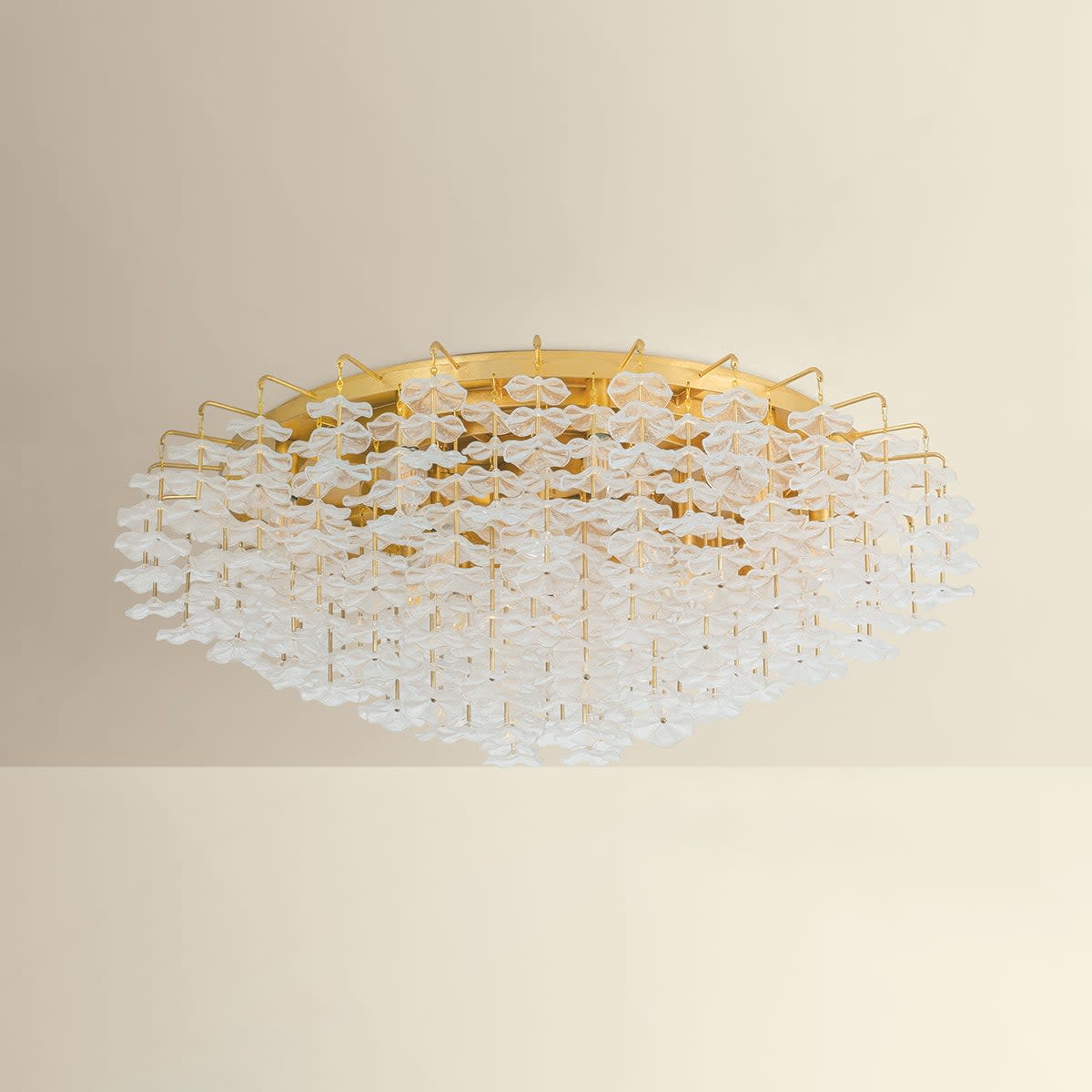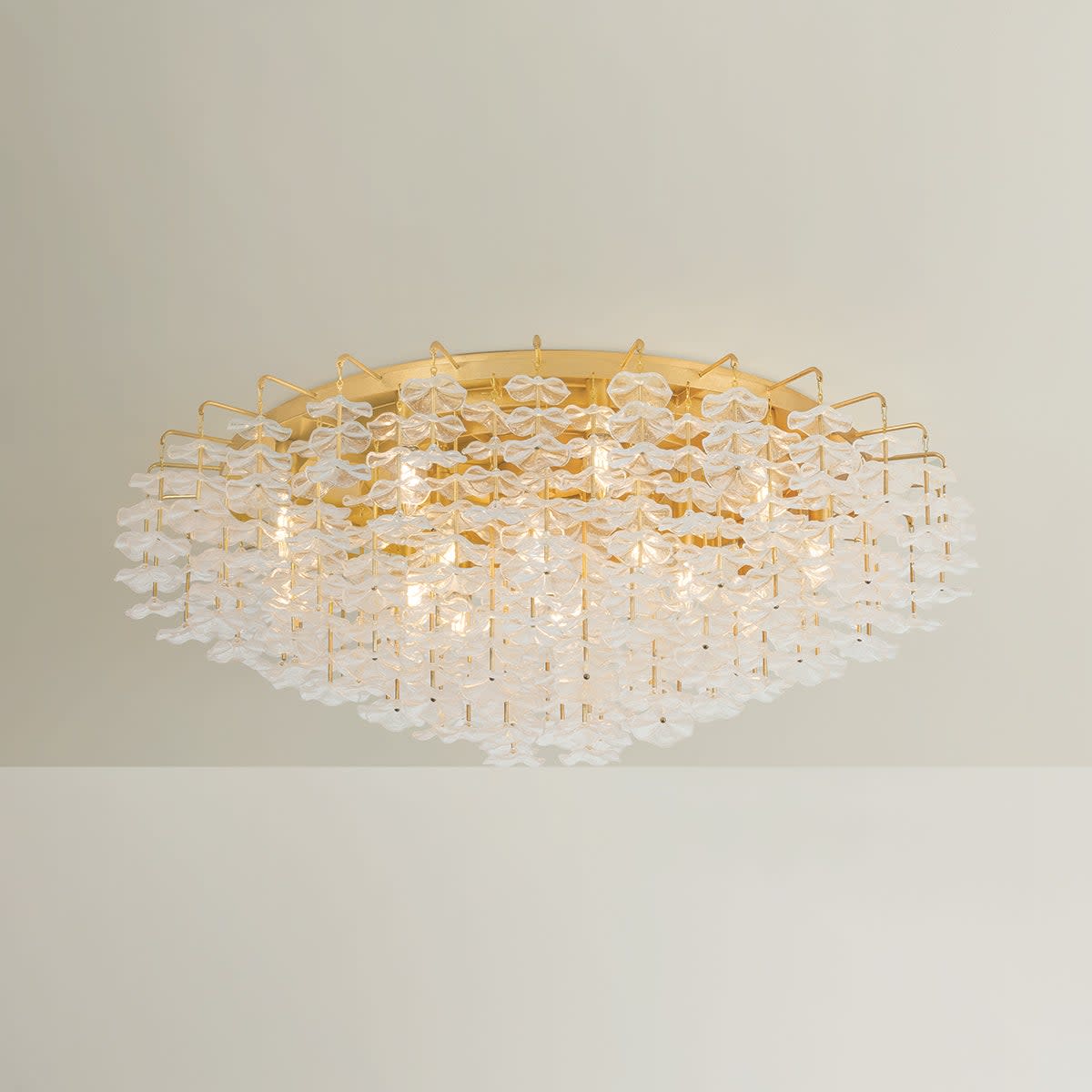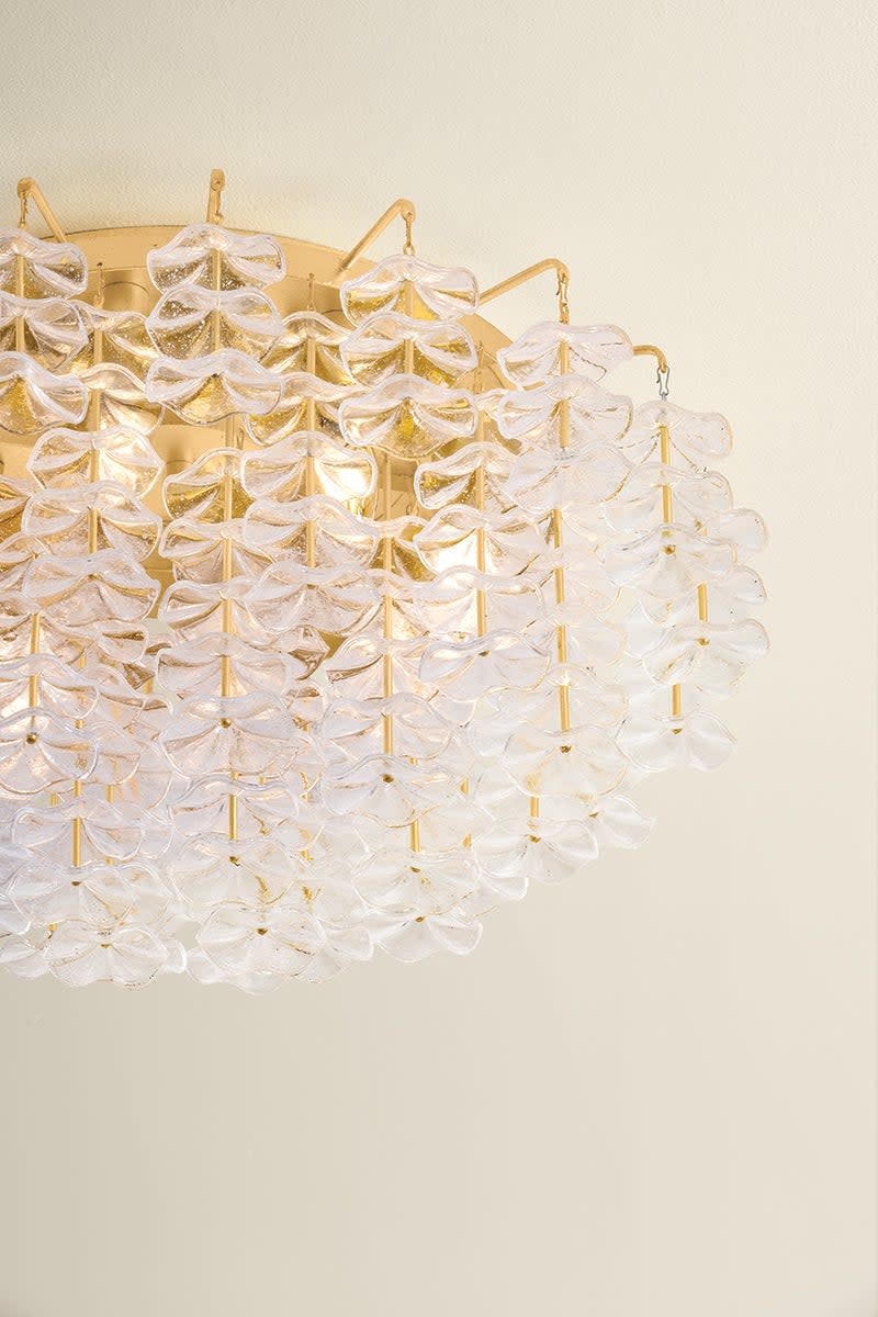 Item DescriptionInspired by the ditsy floral prints of Liberty fabrics, the small piastre glass forms of the Alsace semi flush mount create a whimsical lightness overhead. Stacked cast glass florals appear to float as they dangle from slender stems. The repetition of the textured petals creates a poetic statement through delicate details. Available with 8 or 17 lights.