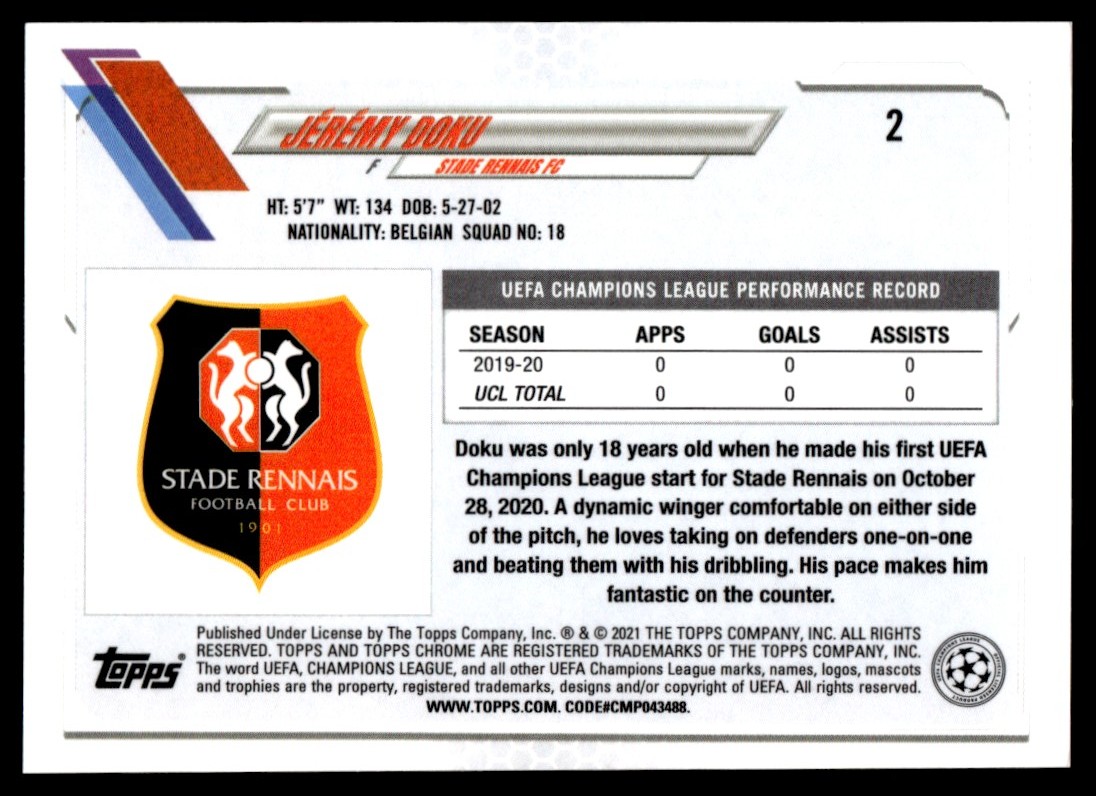 | 2020 Topps Chrome UEFA Champions League Pink Jérémy Doku Stade Rennais FC #2 |