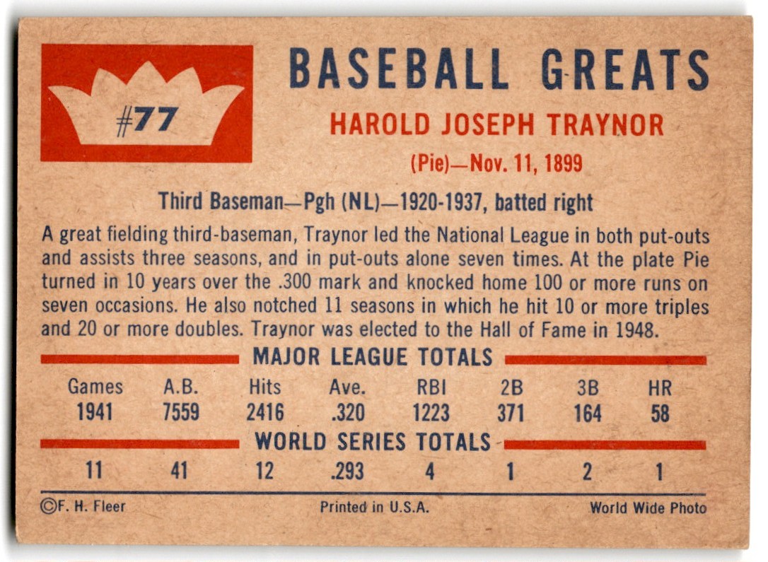 | Pie Traynor 1960 Fleer Baseball Greats Baseball Card #77 Pittsburgh Pirates - VG |