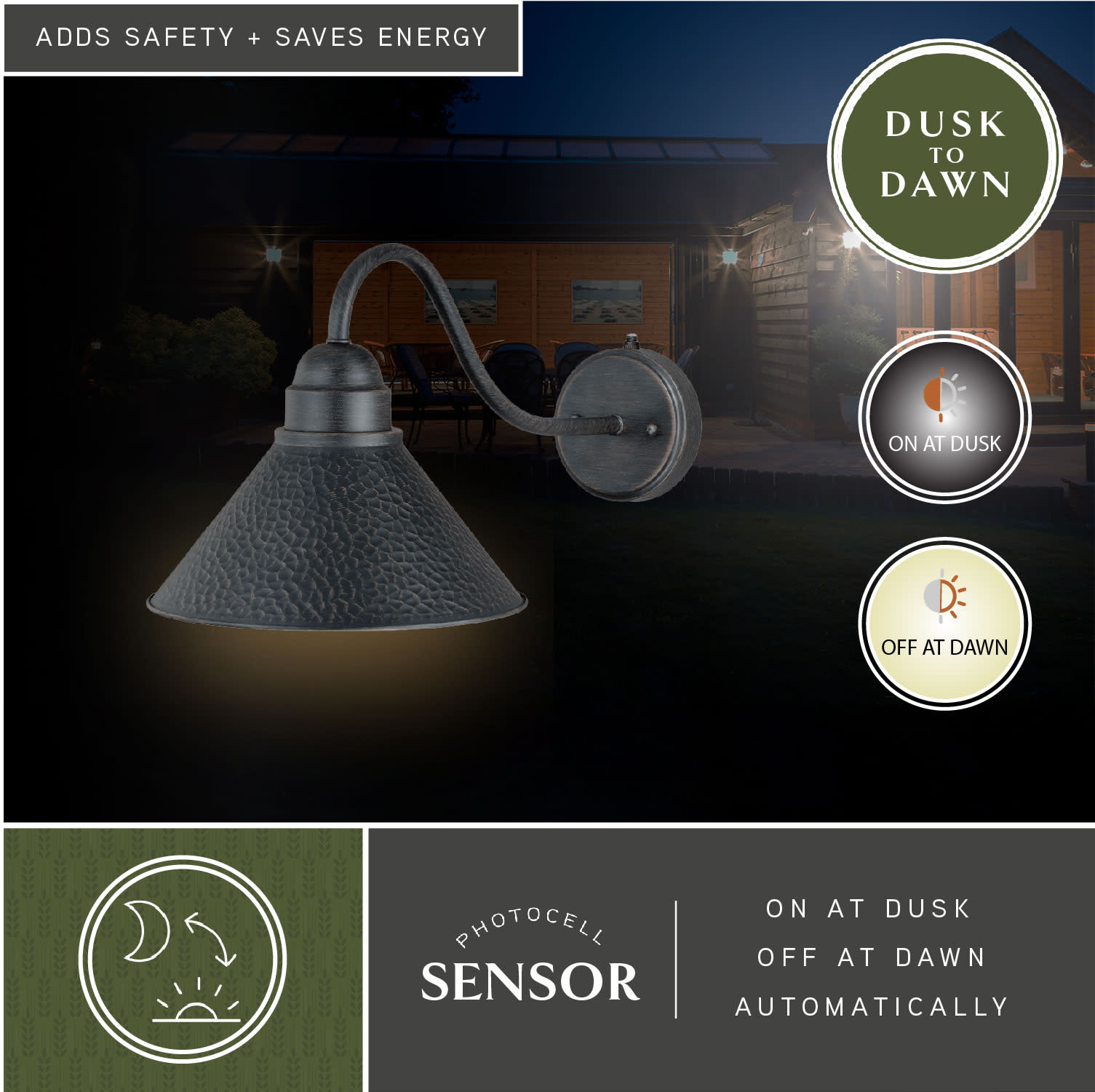 Item DescriptionDesigned with stately, yet rustic sophistication, the Outland Collection is a solid outdoor lighting choice. This fixture is dark-sky compliant - dusk-to-dawn photocell ensures that your light will always be on when needed (and off when it is not!).