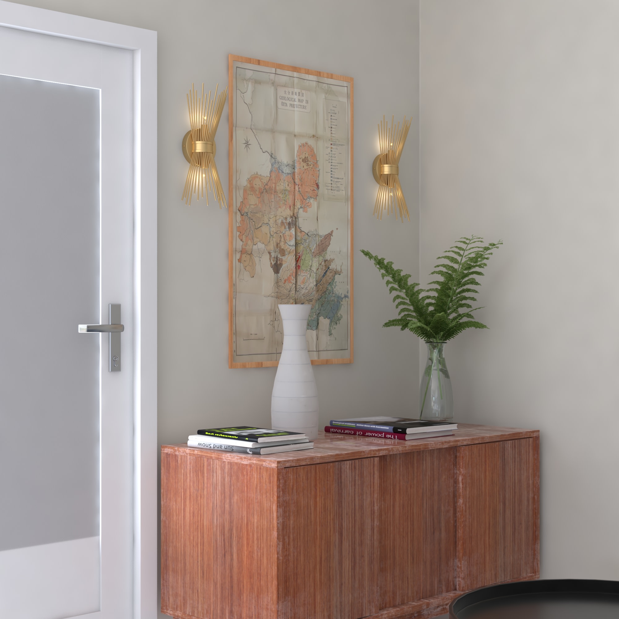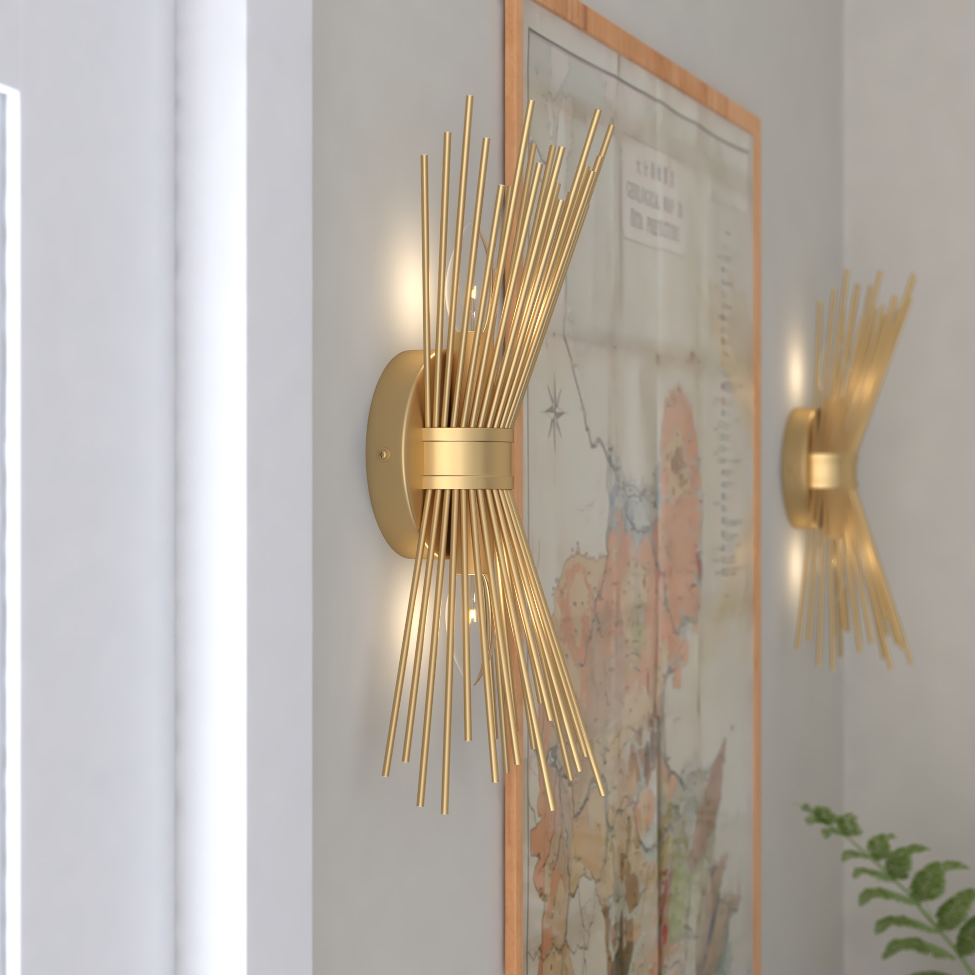 Item DescriptionThe Nikko collection is bursting with excitement and warmth. Gold finished rods playfully radiate from the central band like rays from the sun. This mid-century modern look is a flirty throwback to a simpler age. With its personality and charm, the Nikko collection feels like a familiar friend, sure to make a statement in any entryway, hallway, or bedroom.