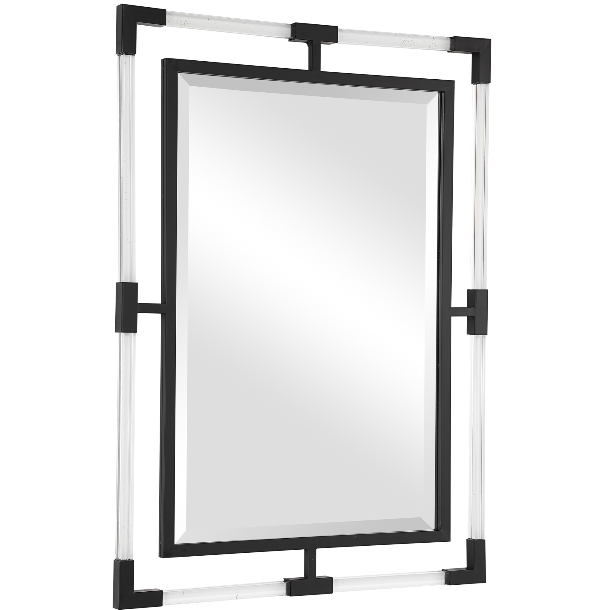 Item DescriptionThis mirror can certainly serve as a focal point for any room. Combining forged iron finished in matte black, with suspended, clear acrylic, solid bars creating a modern feel. Mirror has a generous 1 1/4" bevel and may be hung horizontal or vertical.