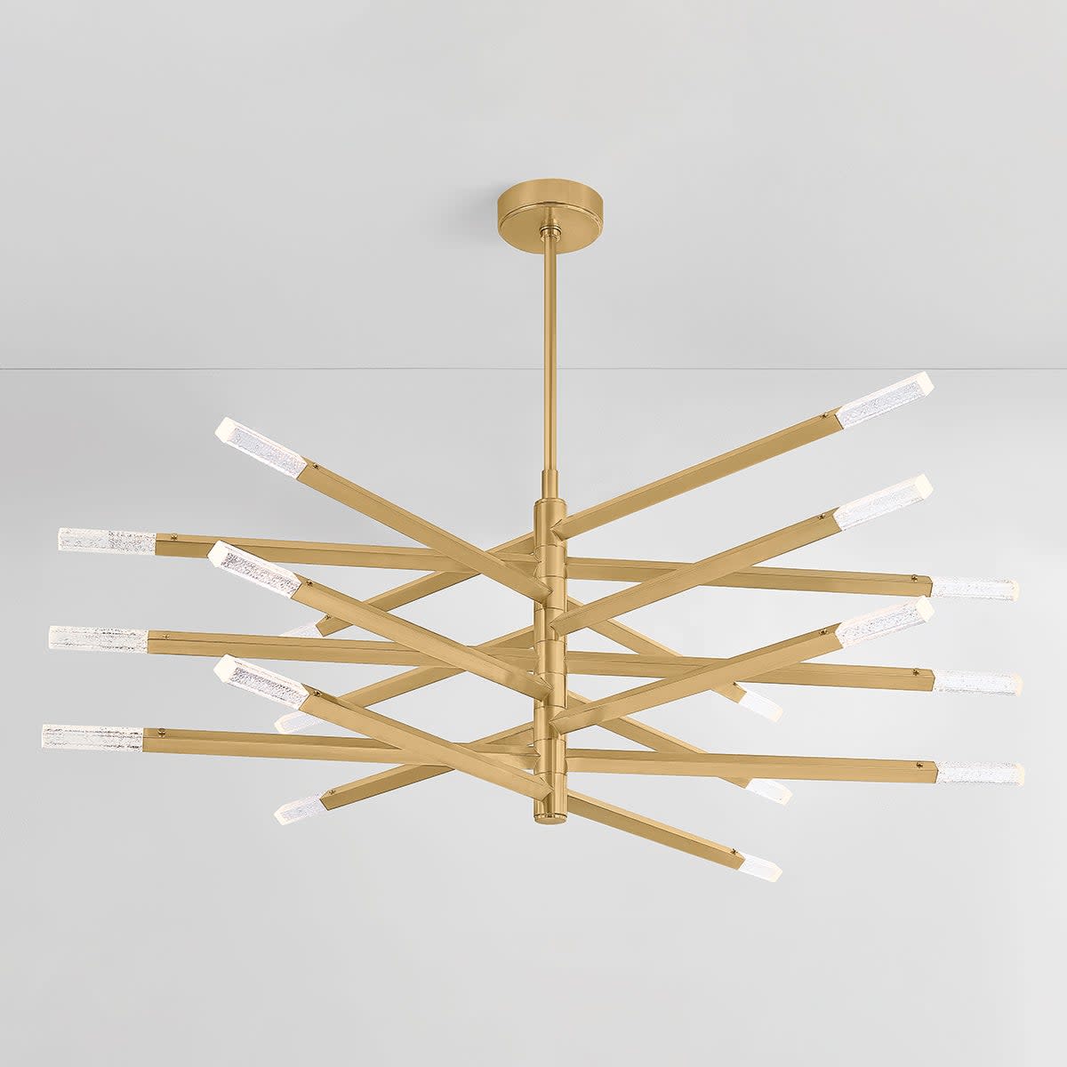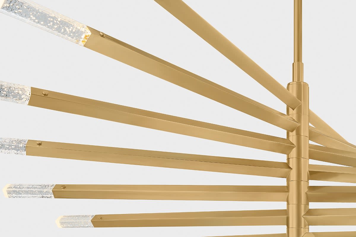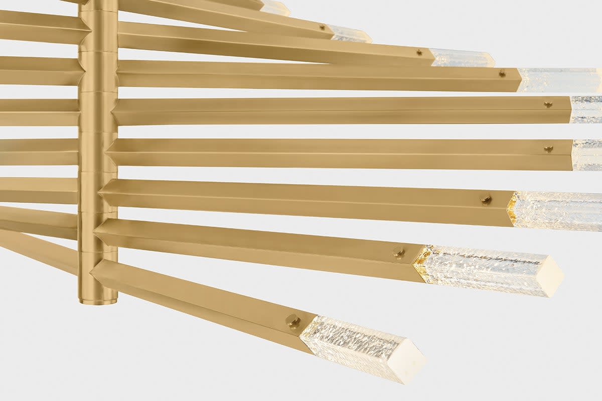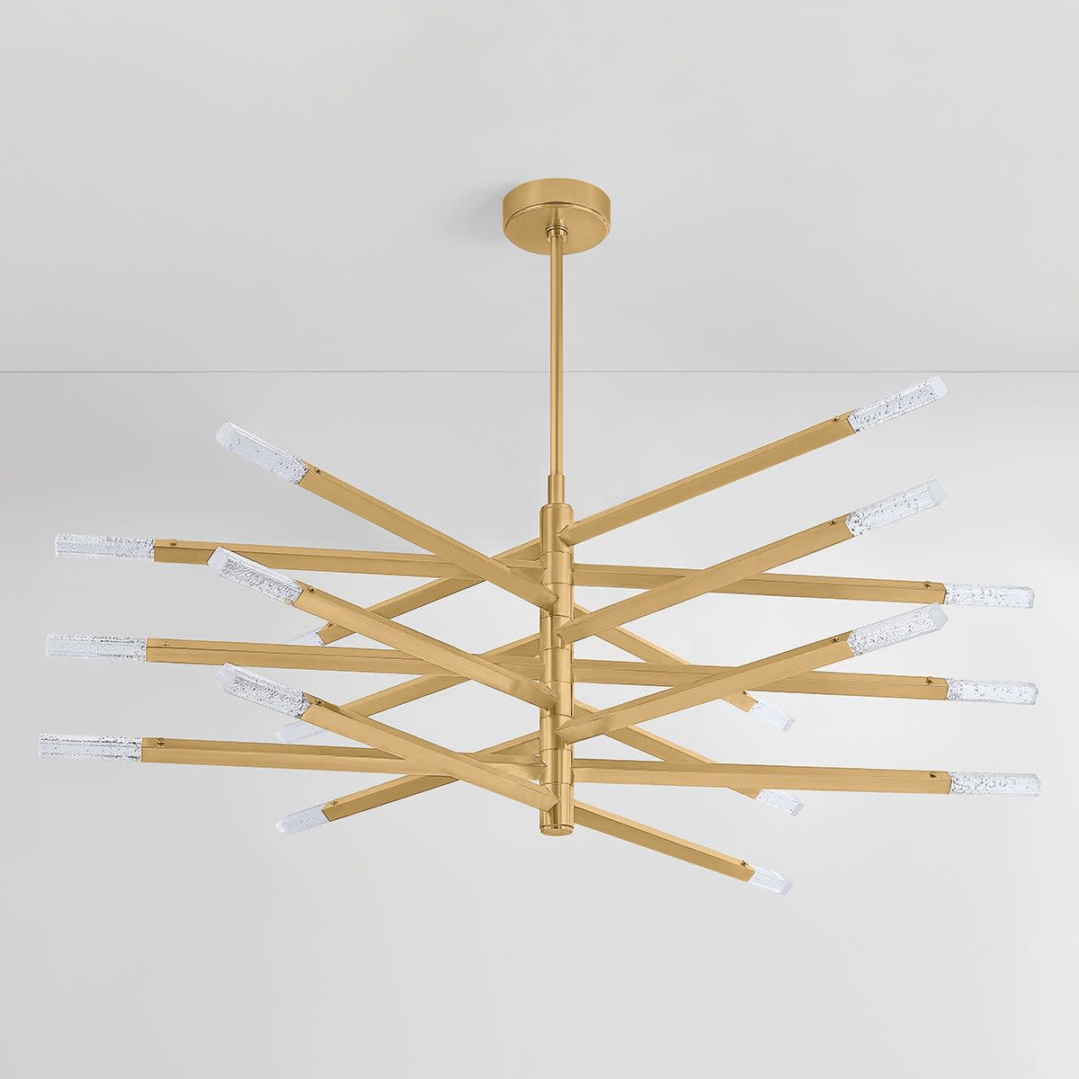 Item DescriptionBold and architectural, the Strasbourg family gives Art Deco style a modern twist. Available in two sizes, the chandelier features a fanned silhouette that forms a dynamic, artistic statement overhead. Each arm is capped on both ends by a cast-seeded glass optic, creating an even spread of light that extends in all directions.