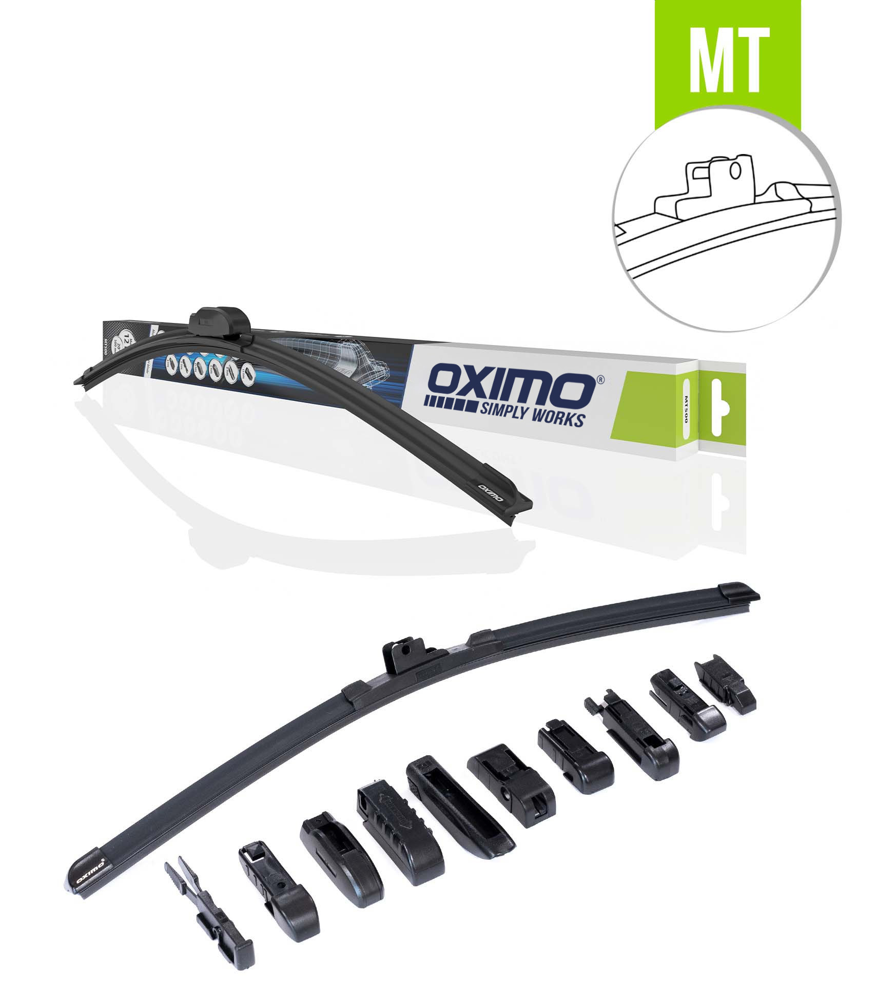 Die OXIMO MT Multi-Type Serie zeichnet sich durch eine rahmenlose, flache Bauweise aus (Flachwischer). Im Gegensatz zu herkömmlichen Wischern mit Gestell passen sich die MT-Wischer gleichmäßig und eng an die Scheibenoberfläche an. Dies sorgt für eine deutlich bessere Reinigung und streifenfreie Sicht – selbst bei starkem Regen, Schnee oder Schmutz.