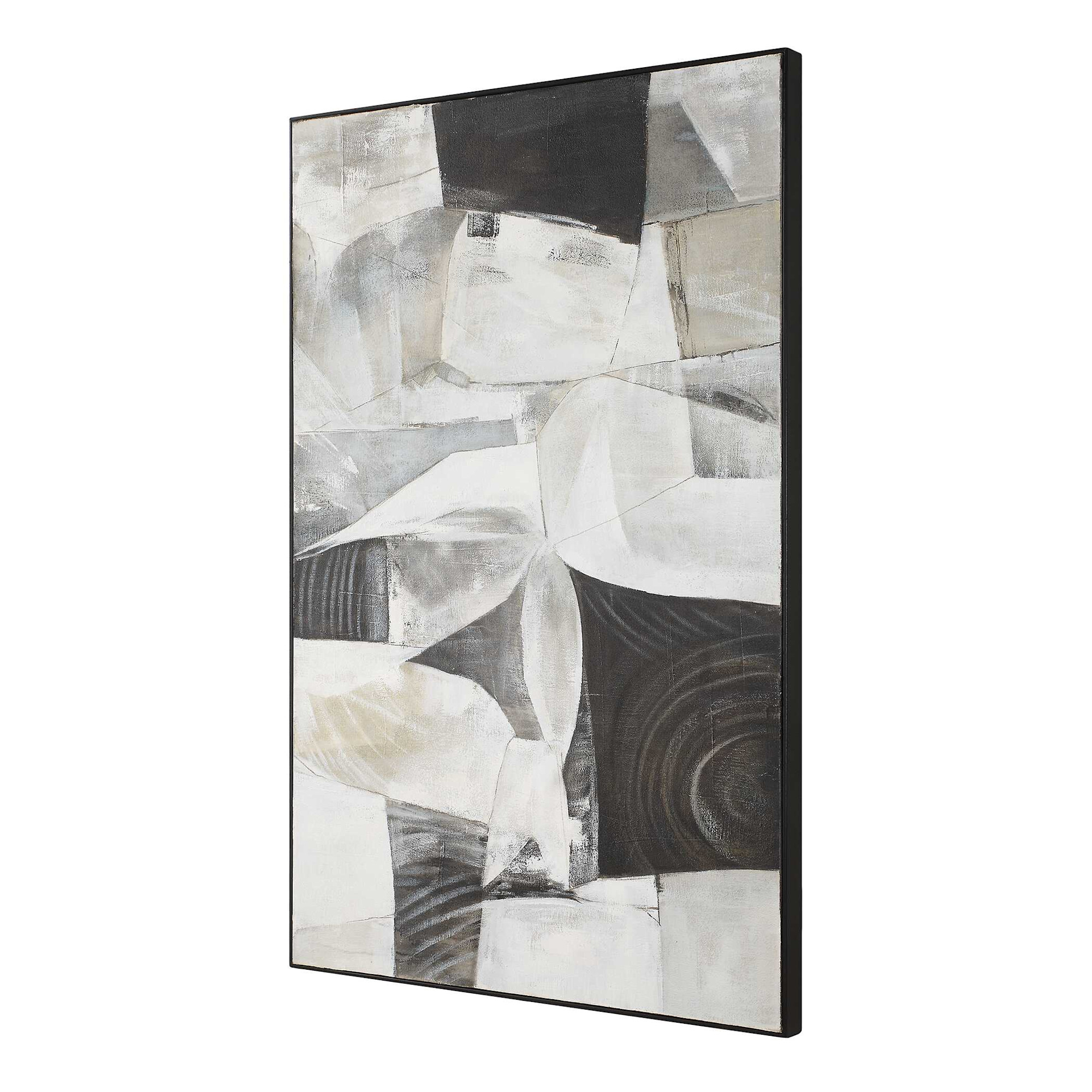 Item DescriptionThe folding time framed canvas features an abstract design with strong geometric influence that evokes the feeling of folded paper, with overlapping and intersecting shapes. The monochromatic color palette is emphasized by a thin, black gallery frame. Due to the handcrafted nature of this work, each piece may have subtle differences. This piece may be hung horizontal or vertical.