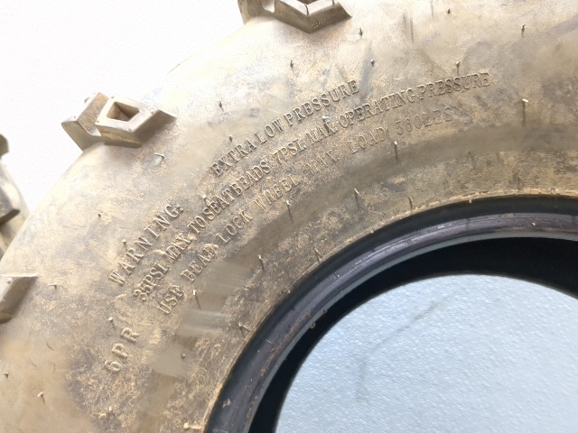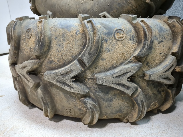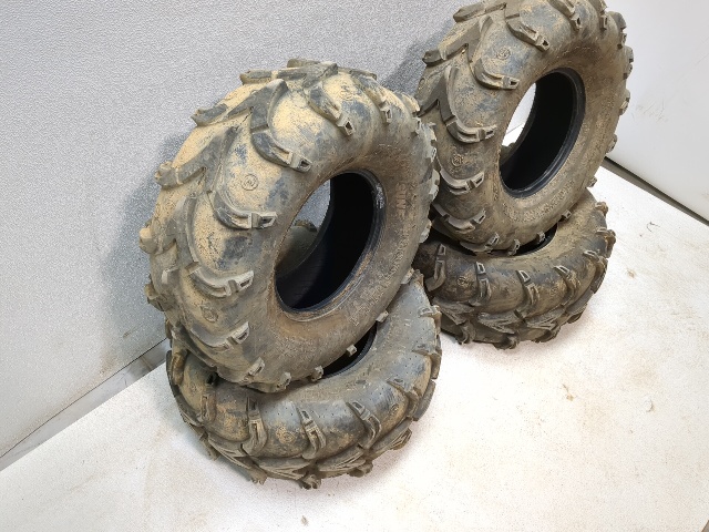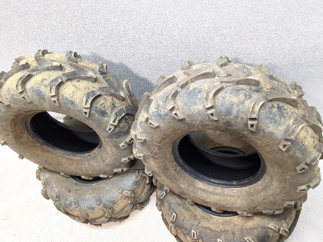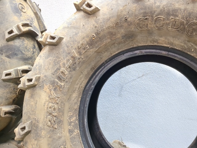 Tire Set - Set of four SunF Godzilla Monster Mud tubeless tires. Fits 2022-2024 Aodes Junglecross 800 and other UTV/ATV machines requiring a 28x10-12 square setup. Features an aggressive mud tread pattern with a 6-ply rating (6PR). Structurally sound with age-appropriate wear. OEM equipment for Aodes utility vehicles.