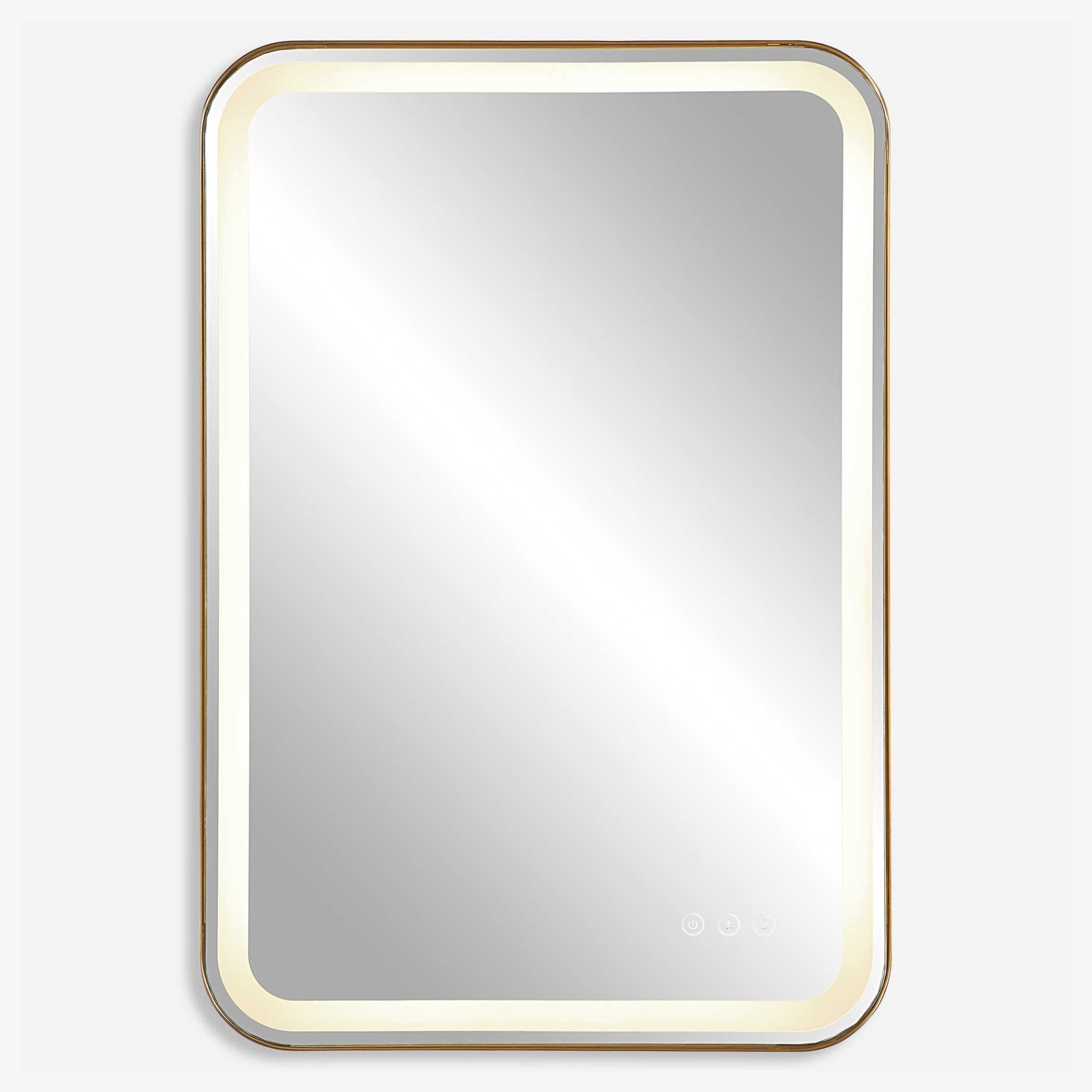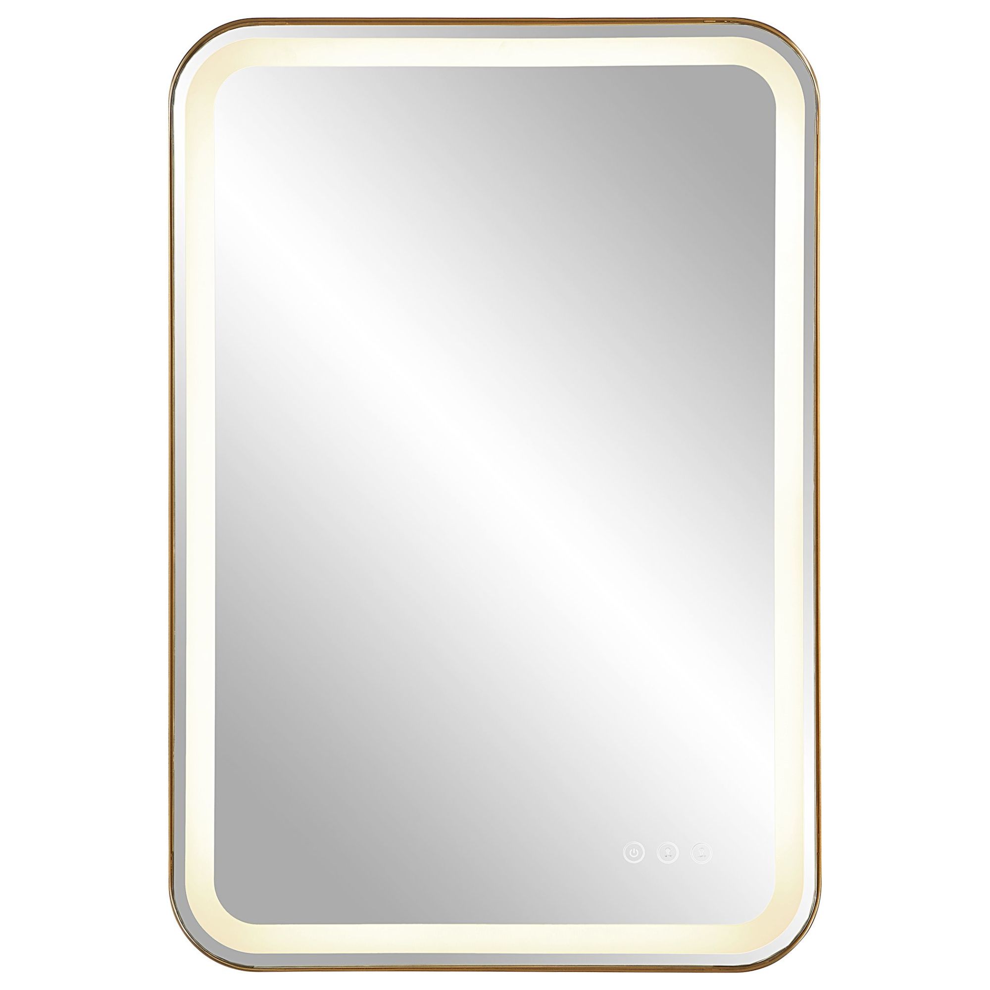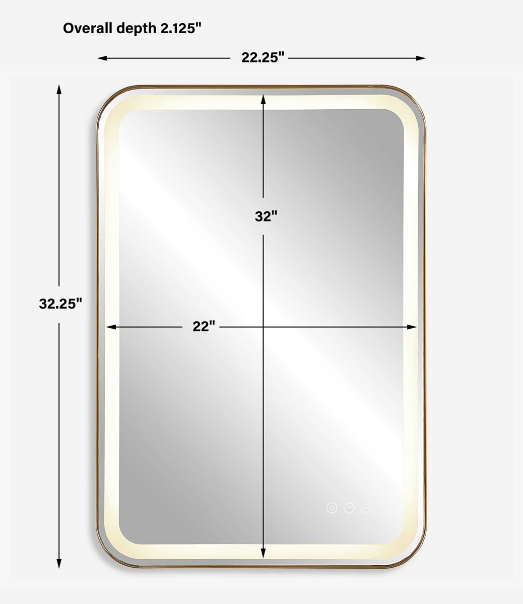Item DescriptionVersatile In Design, This Vanity Mirror Has Integrated LED Lighting That Illuminates Through The Frosted Strip In The Polished Edged Mirror. The Brushed Brass Plated Stainless Steel Frame Is Off Set From The Wall To Allow Ambient Lighting From The Back. Easy To Use Touch Buttons Are Featured On The Bottom Right Of The Mirror With An On Off Function, Touch And Hold Kelvin Control From 2700k To 4000k, And Touch And Hold Brightness Control. LED Lights Rated At 40,000 Hours. Ships With Plug, But Can Be Hardwired Professionally.