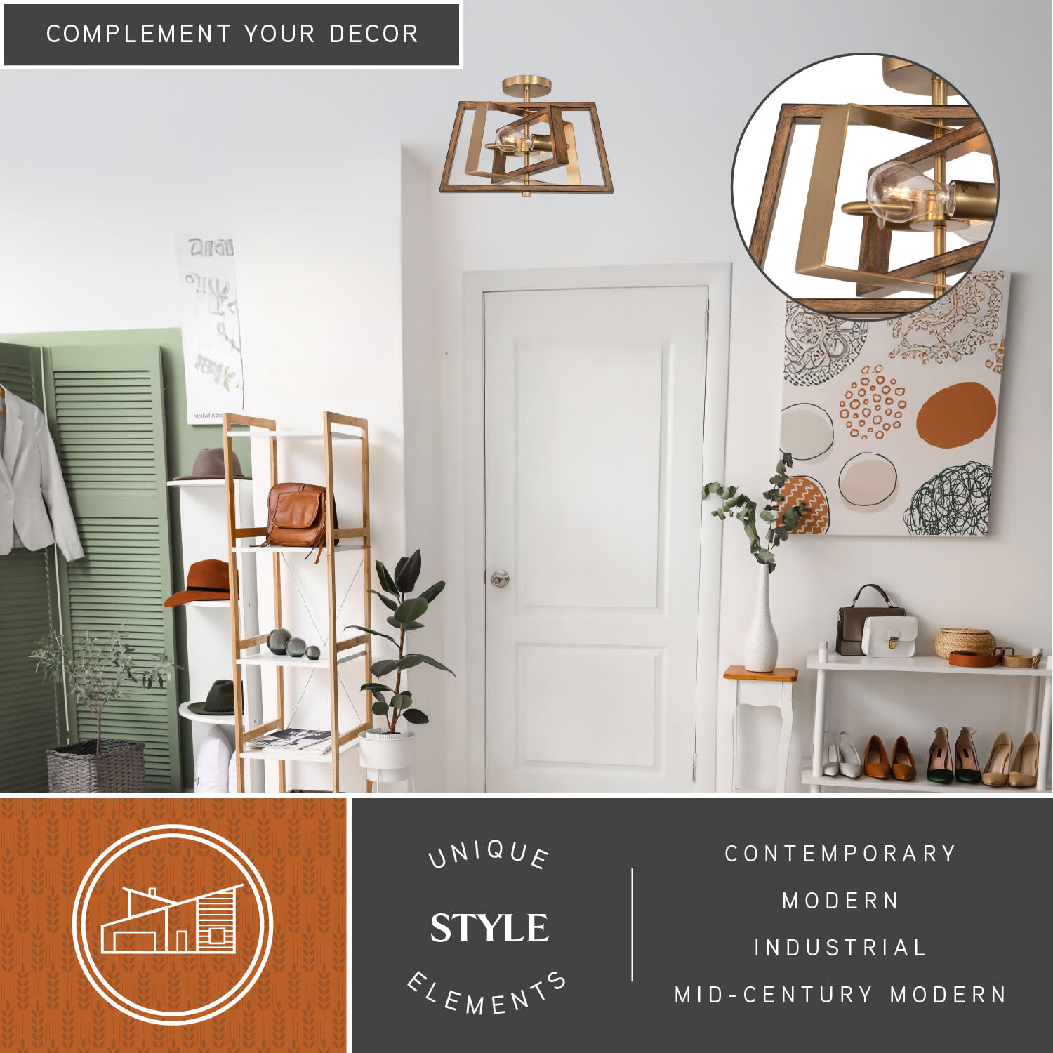 - An open frame design provides bright illumination and a transitional feel
