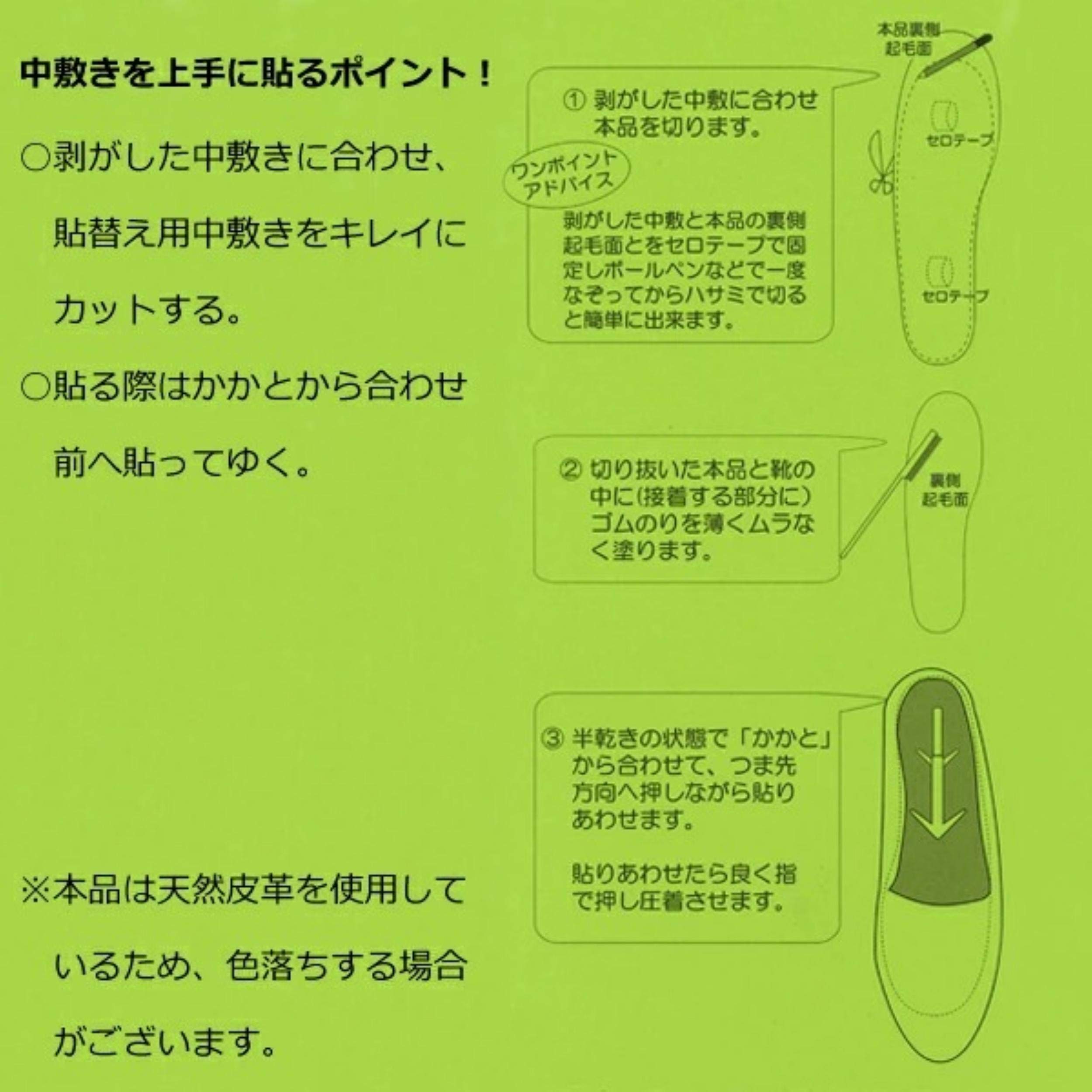 Made of luxurious, genuine leather, these insoles offer excellent moisture absorption and breathability. They keep the inside of your shoes clean. Available in a wide variety of colors. Choose your favorite. The soft goat leather provides exceptional comfort. The color is consistent and the large size makes them easy to work with. *This product is made of natural leather, so color fading may occur.