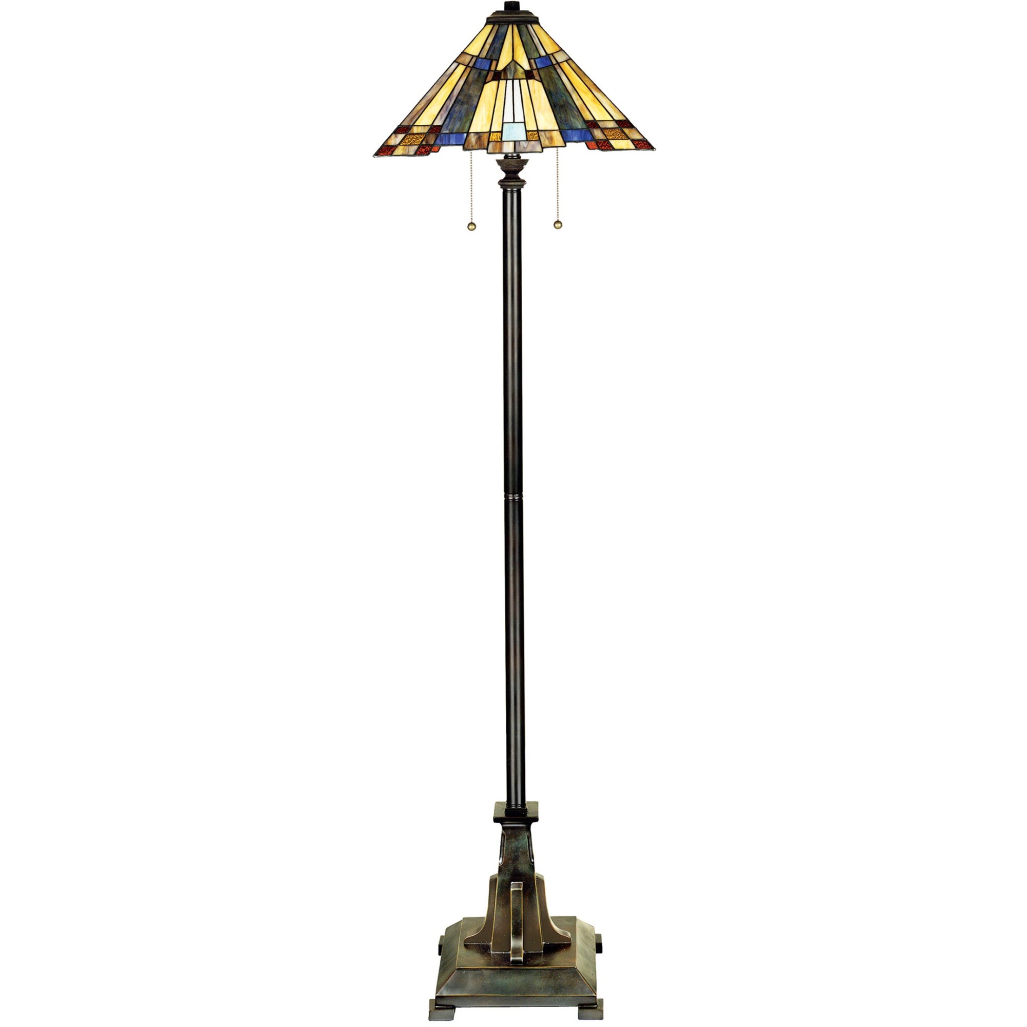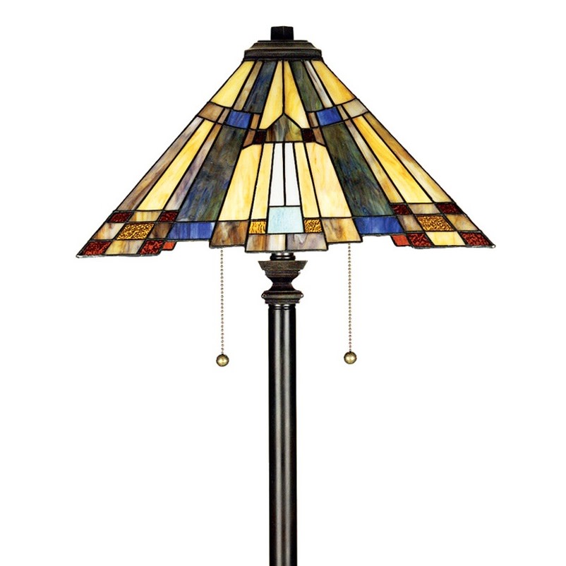 Item DescriptionThis Arts and Crafts style features a pyramid shade with a stepped border for added visual interest. The classic geometric design includes art glass in shades of amber, cream and tan, accented with glass pieces in sapphire blue and rich green. The linear geometric details on the base makes it a perfect complement to the shade.