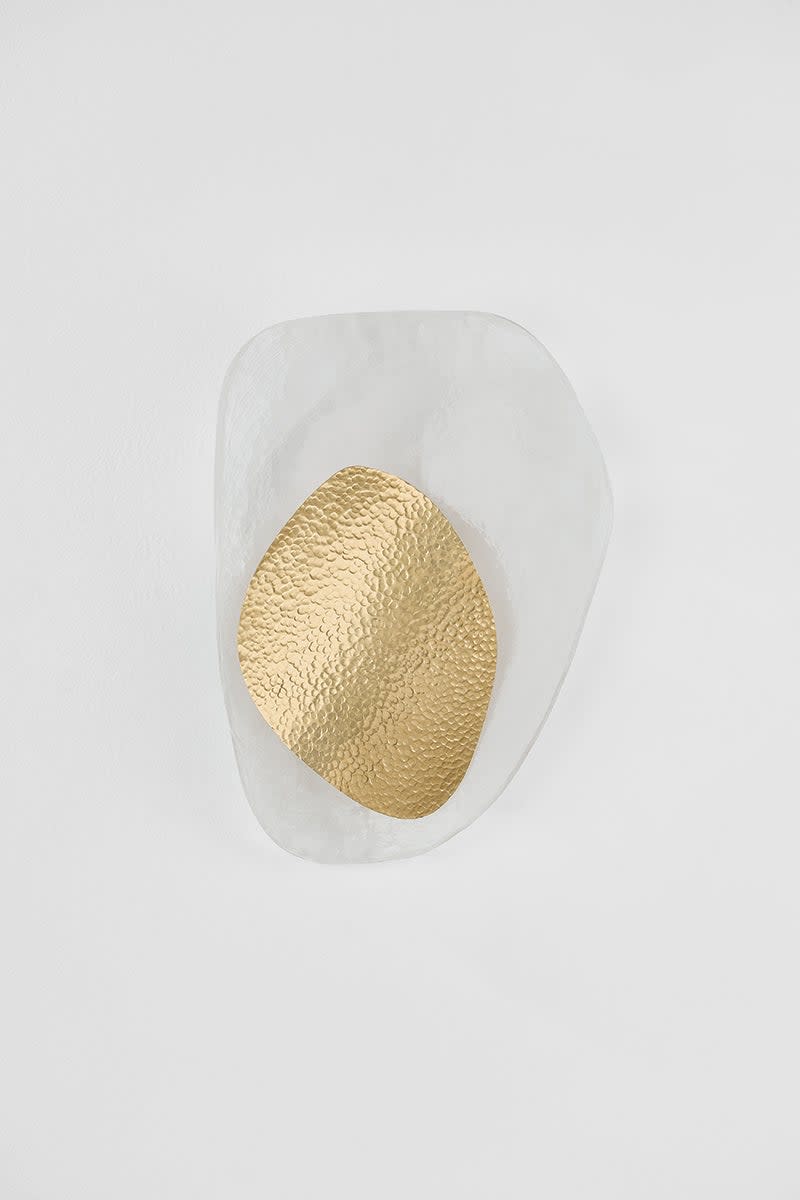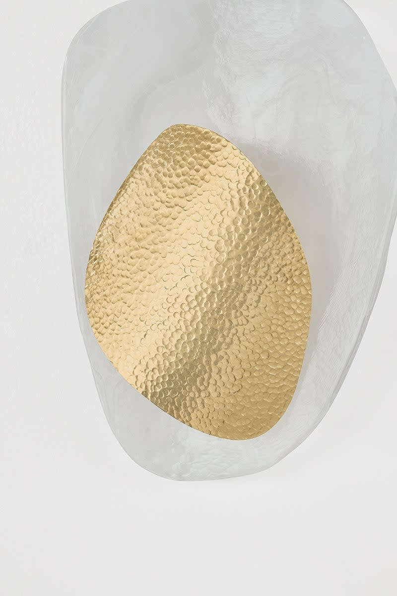 Item DescriptionDynamic design lines and layered materials combine in the eye-catching composition of Bilbao. This artful sconce pairs delicate cast Piastra glass with a hammered abstract form, creating a luxurious contrast. As it gently curves away from the wall, Bilbao breathes life into a space with its vaguely botanical beauty.