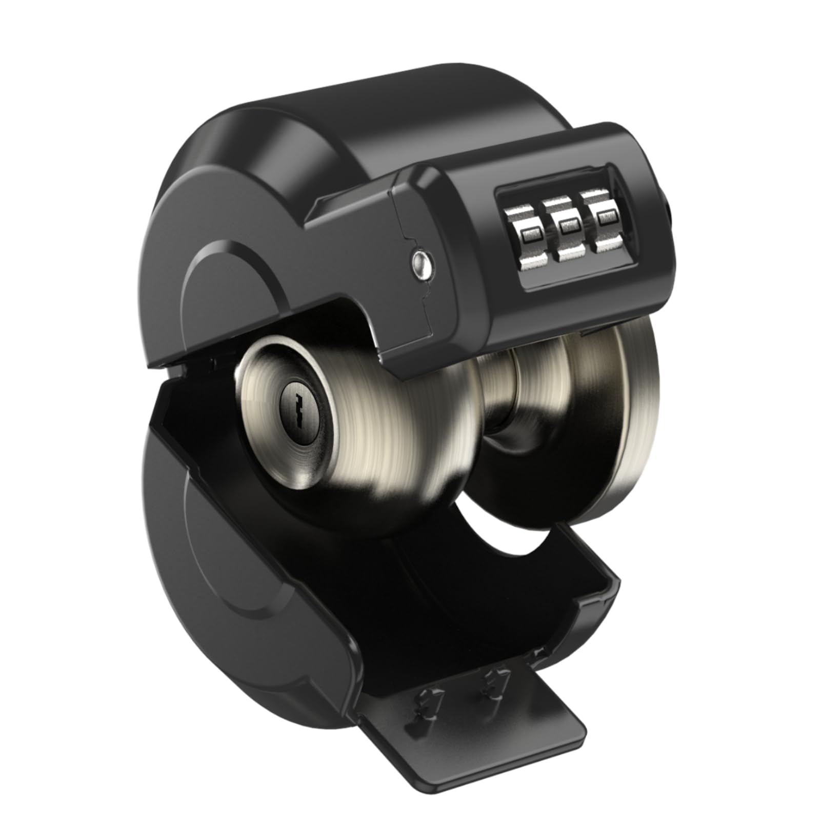 Door Knob Lockout Device Cover to Disable Doorknob/Faucet/Water Valve Hose LockCODE DESIGN NO KEY NEEDED: The door knob lockout device design with code lock.EASY TO INSTALL CARRY AND MOVE: Just place the device over the door knob, lock and go.It's quick and easy to install, lock and unlock.The deice can be stored in the bag and carry to anywhere you need.HIGH QUALITY: The door knob lockout device is made of high-quality metal with powder coating for long time usePRIVACY PROTECTION: The door knob lockout device can stop the people who has the key or the copy key to entre your room,keeping the room safer and protect your privacyWIDE APPLICATIONS: Not only for door knob, also suitable for valves, outdoor faucet locks, portable safety door locks for travel