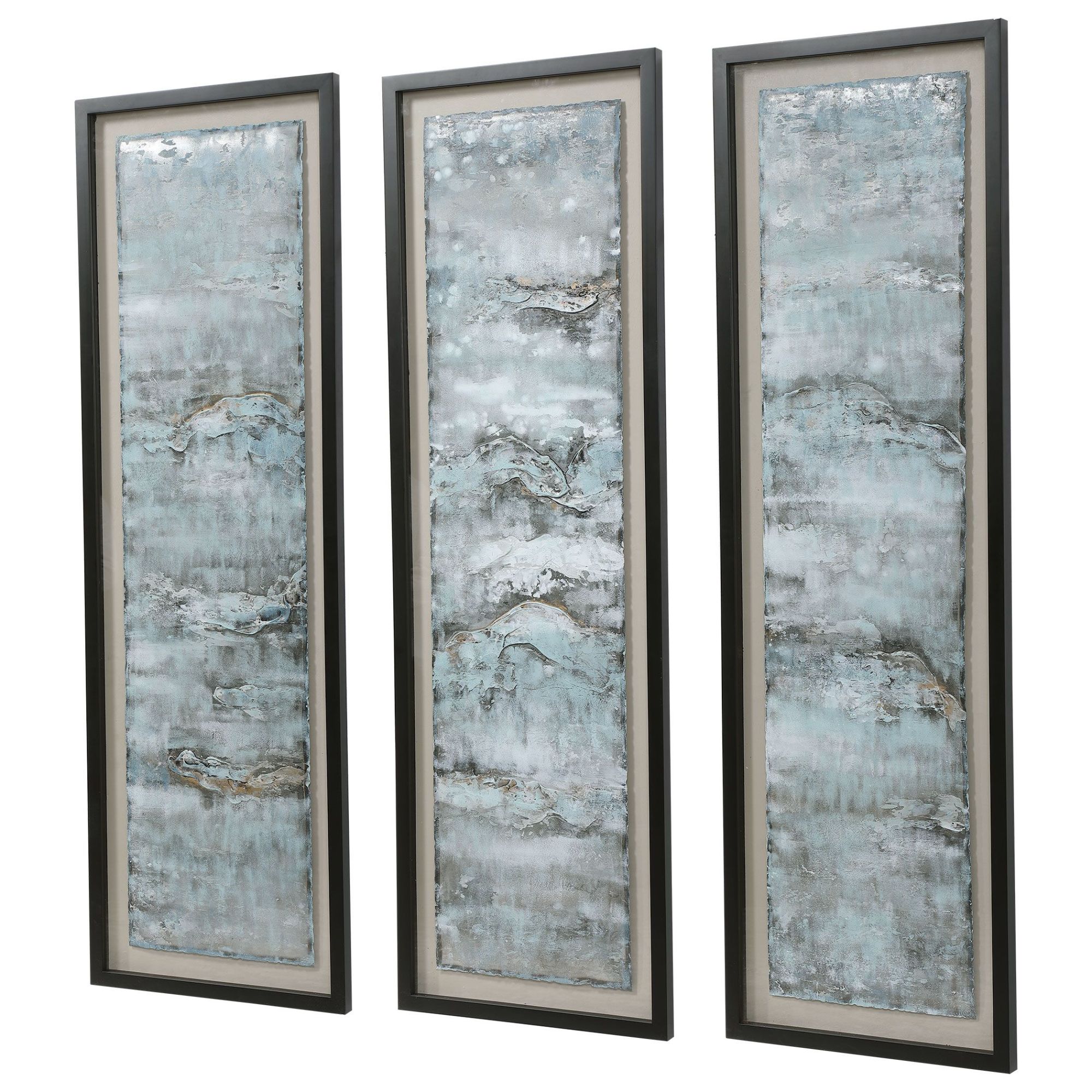 Item DescriptionReminiscent of ocean water, these metal sheets are hand painted in aqua, gray, silver and gold hues. The raw metal edge is softened by natural beige linen backing and a matte black shadow box style frame under glass. Due to the handcrafted nature of this artwork, each piece may have subtle differences. Each piece may be hung horizontal or vertical.
