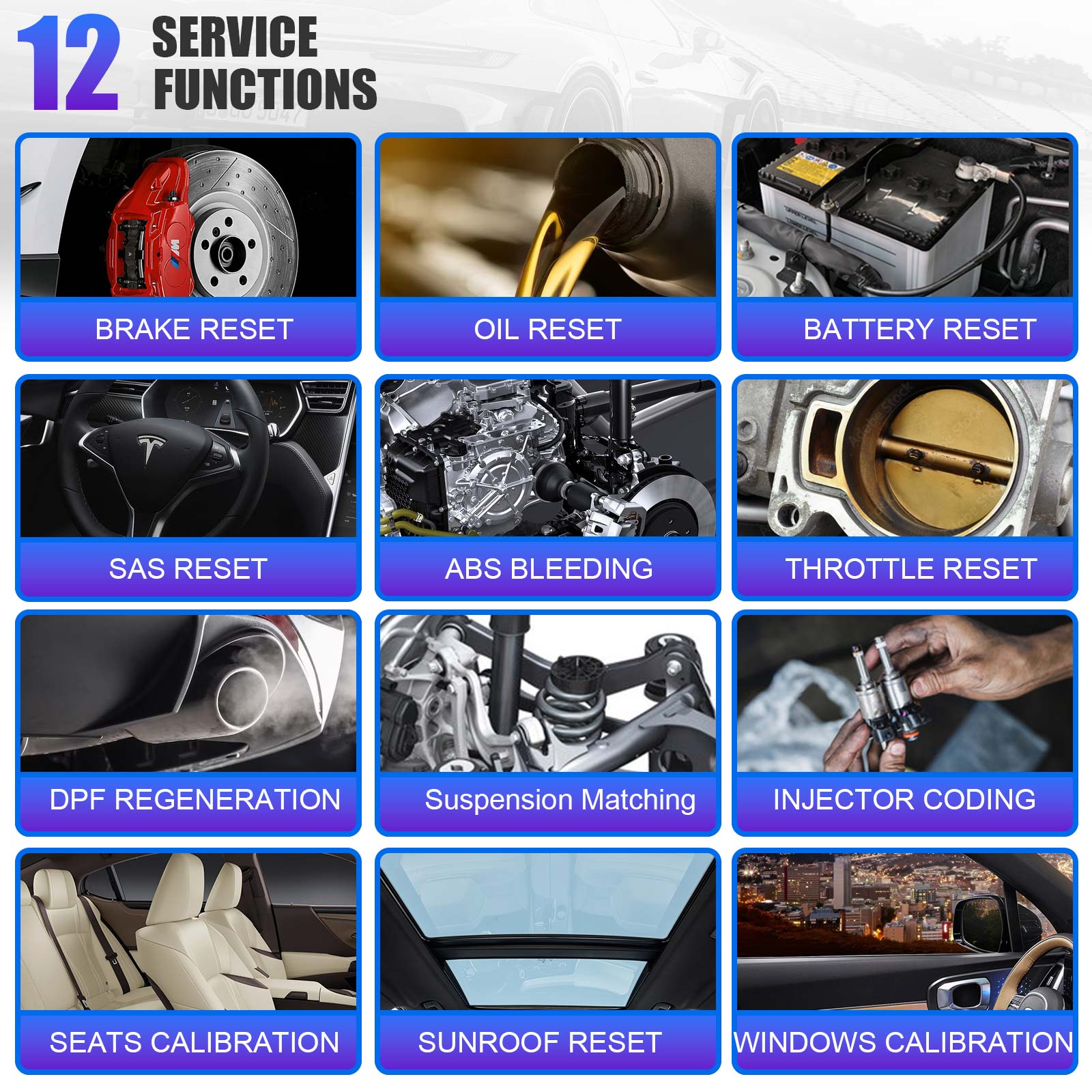 special functions: ABS exhaust, battery matching, brake pad replacement, DP-F regeneration, throttle learning, injector coding, maintenance light reset, steering angle learning, seat calibration, sunroof initialization, door and window calibration.