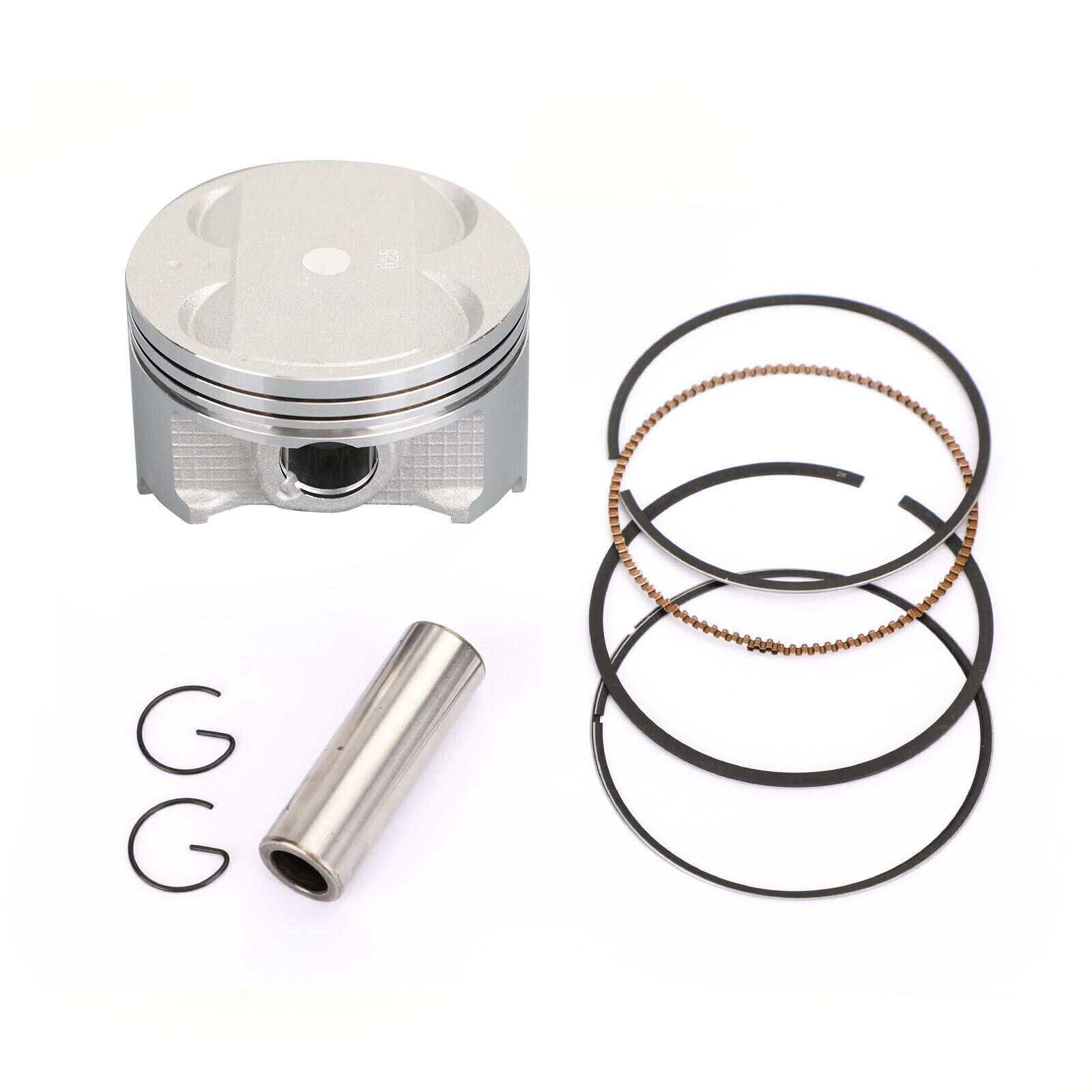 This kit includes a piston, rings, wrist pin, and circlips.