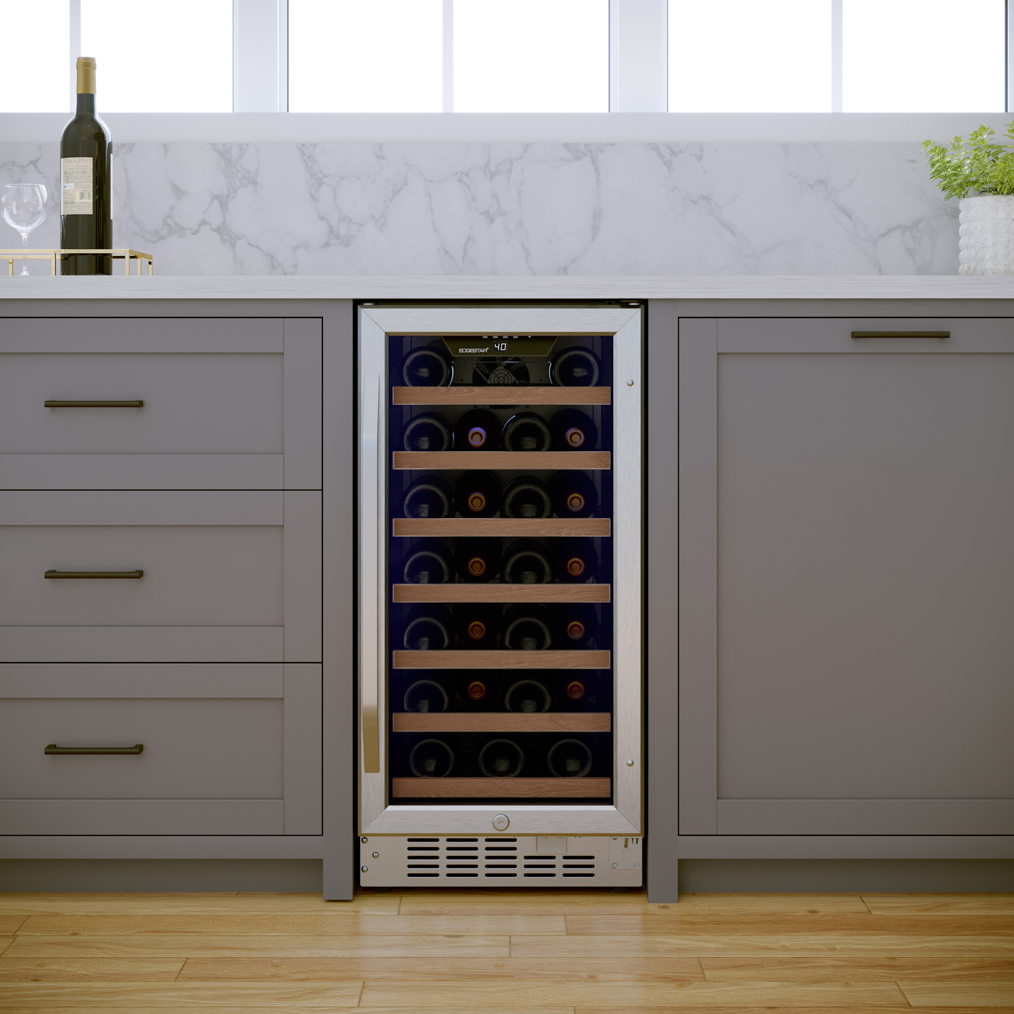 - The slide-out wood trimmed wire wine racks, stainless steel trimmed door, and soft LED lighting add to an overall great presentation of your collection